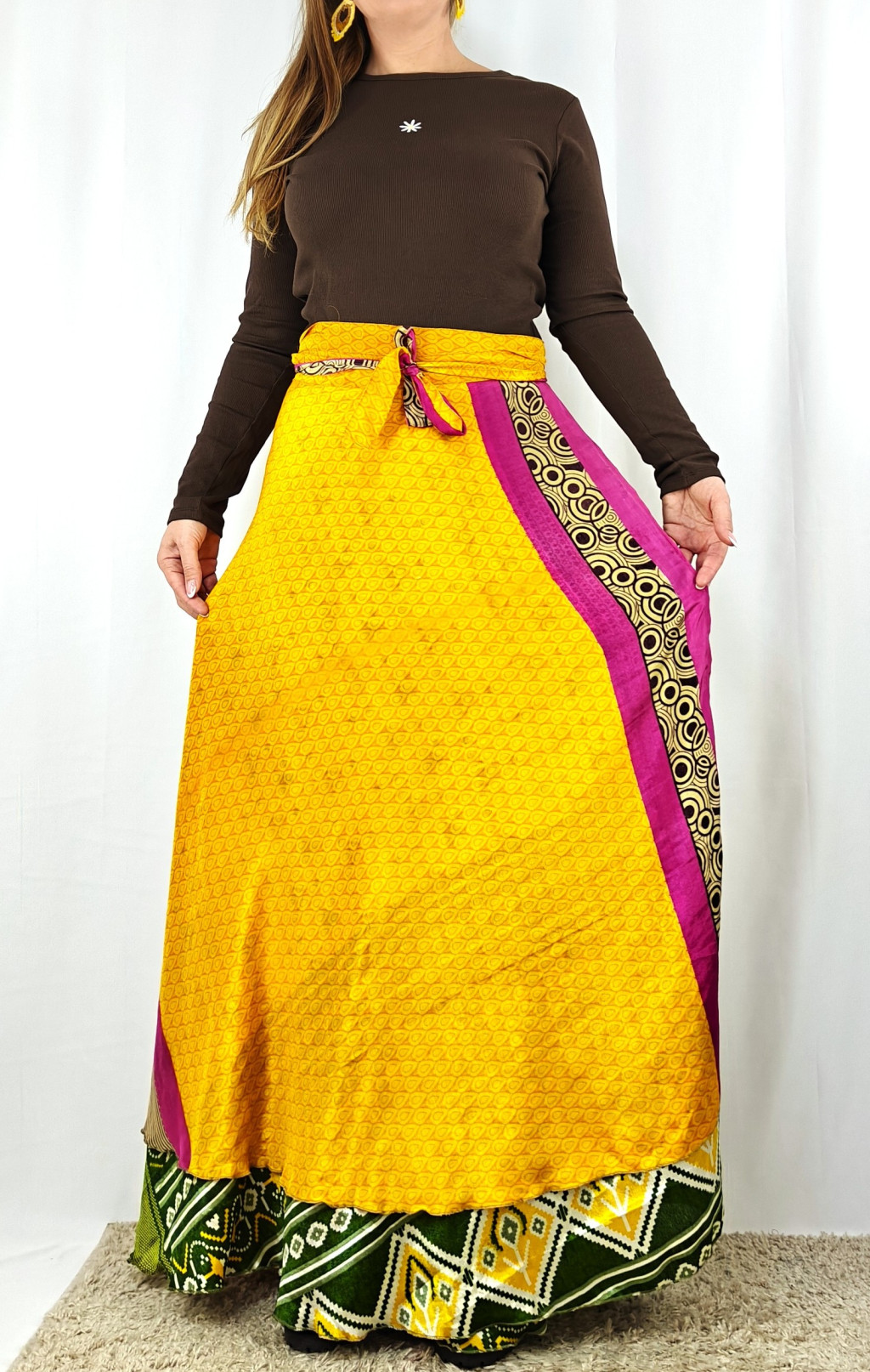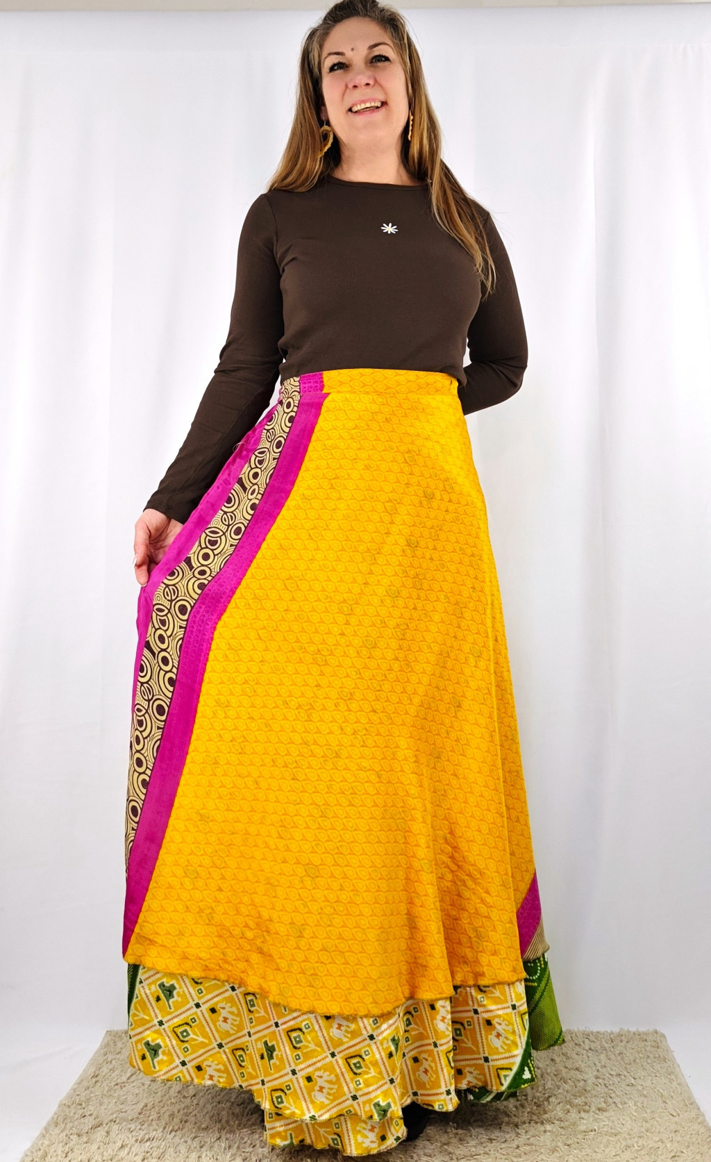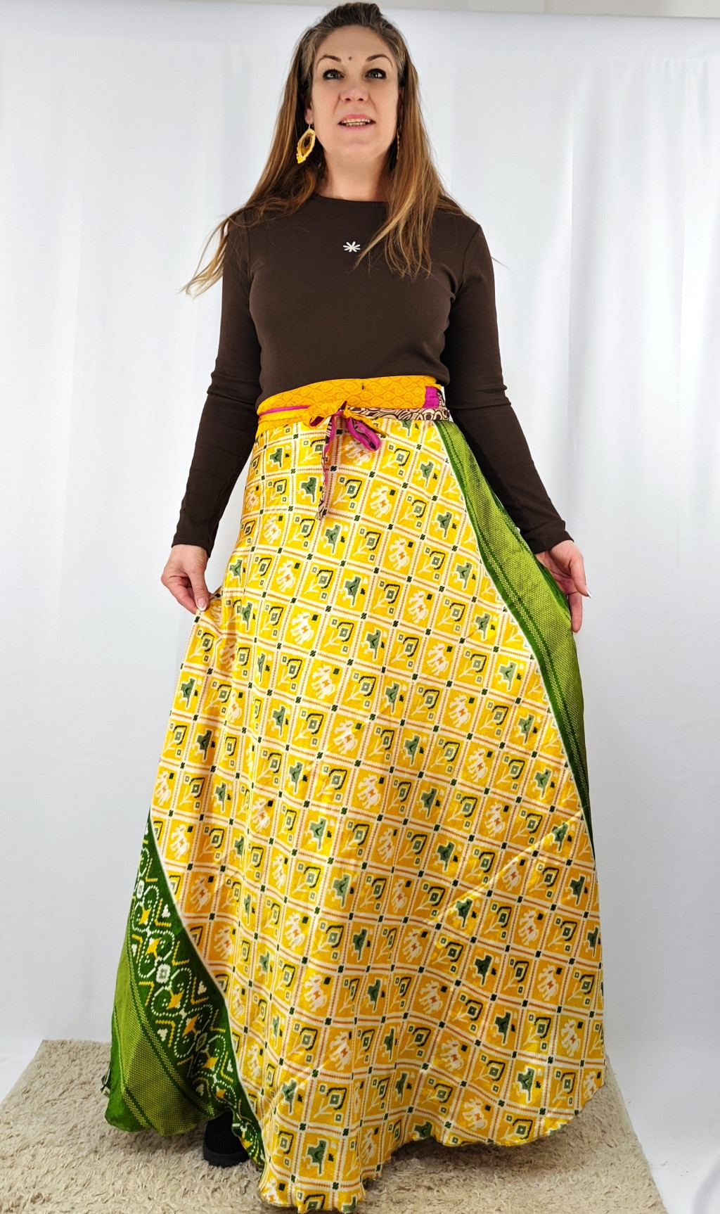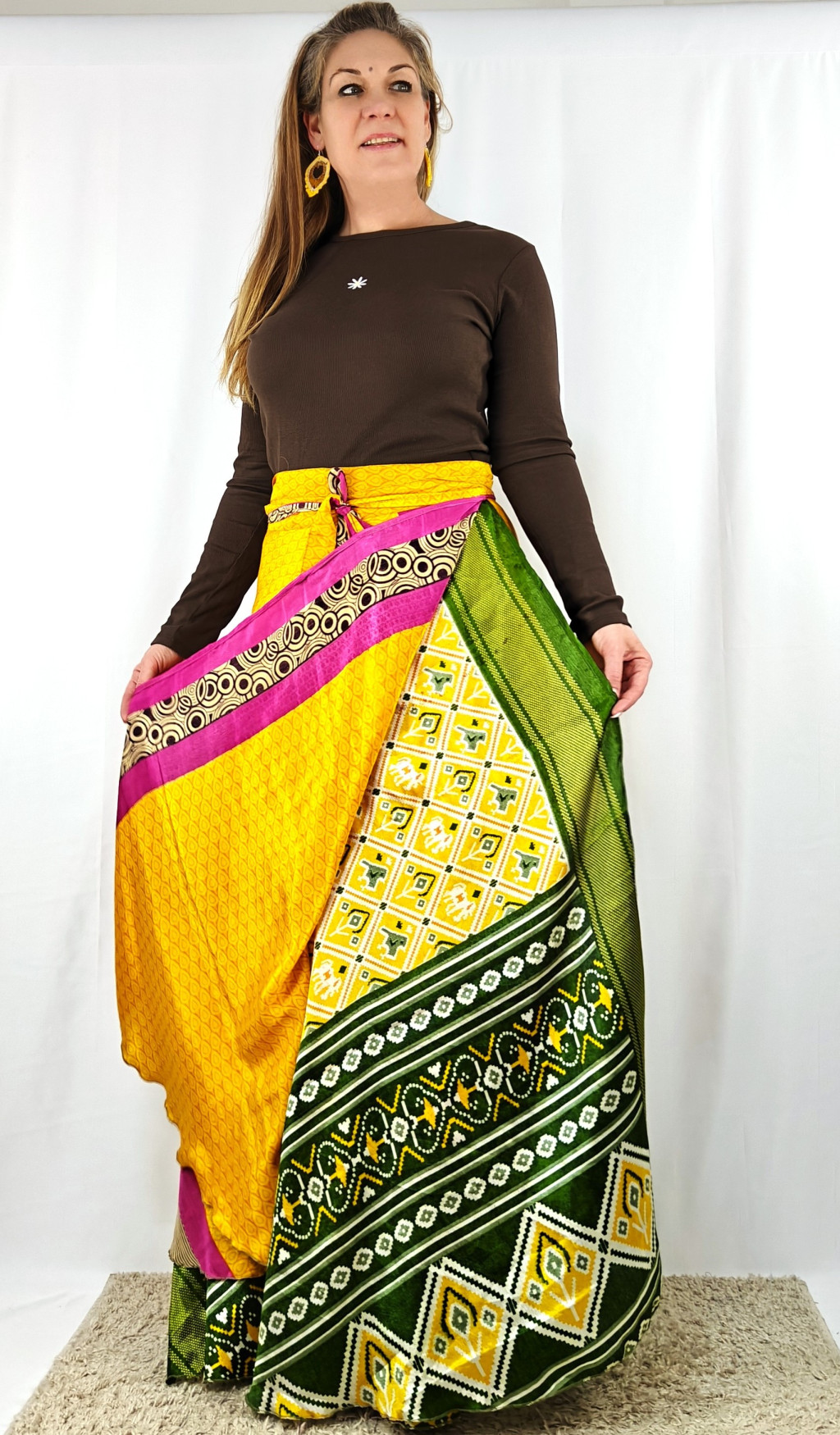 Lapszoknyáink újrahasznosított szárikból készülnek Indiában, egy hosszabb és egy rövidebb anyag derékban összevarrva! Két oldalú, kifordítható, mindkét oldala hordható, sokféleképpen köthető, variálható. Szoknyáinkból nincs két egyforma, mindegyikből csak EGY darab van, ha megtetszik, csapj le rá!