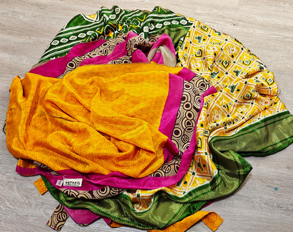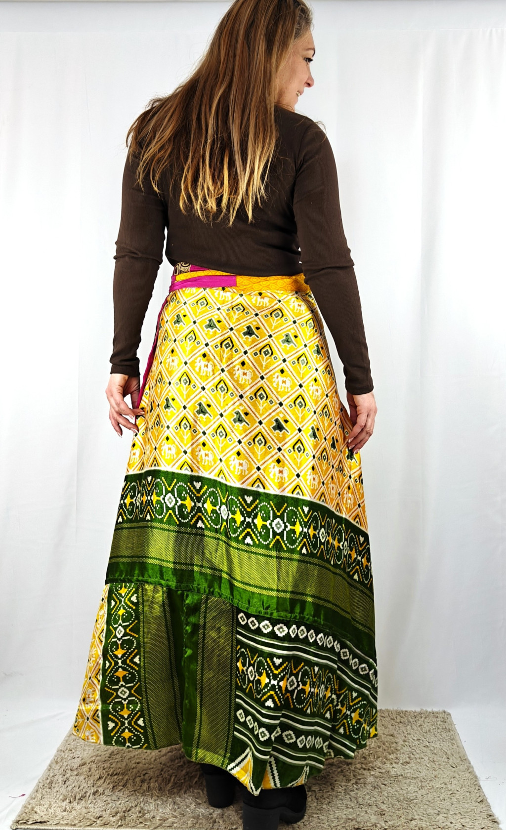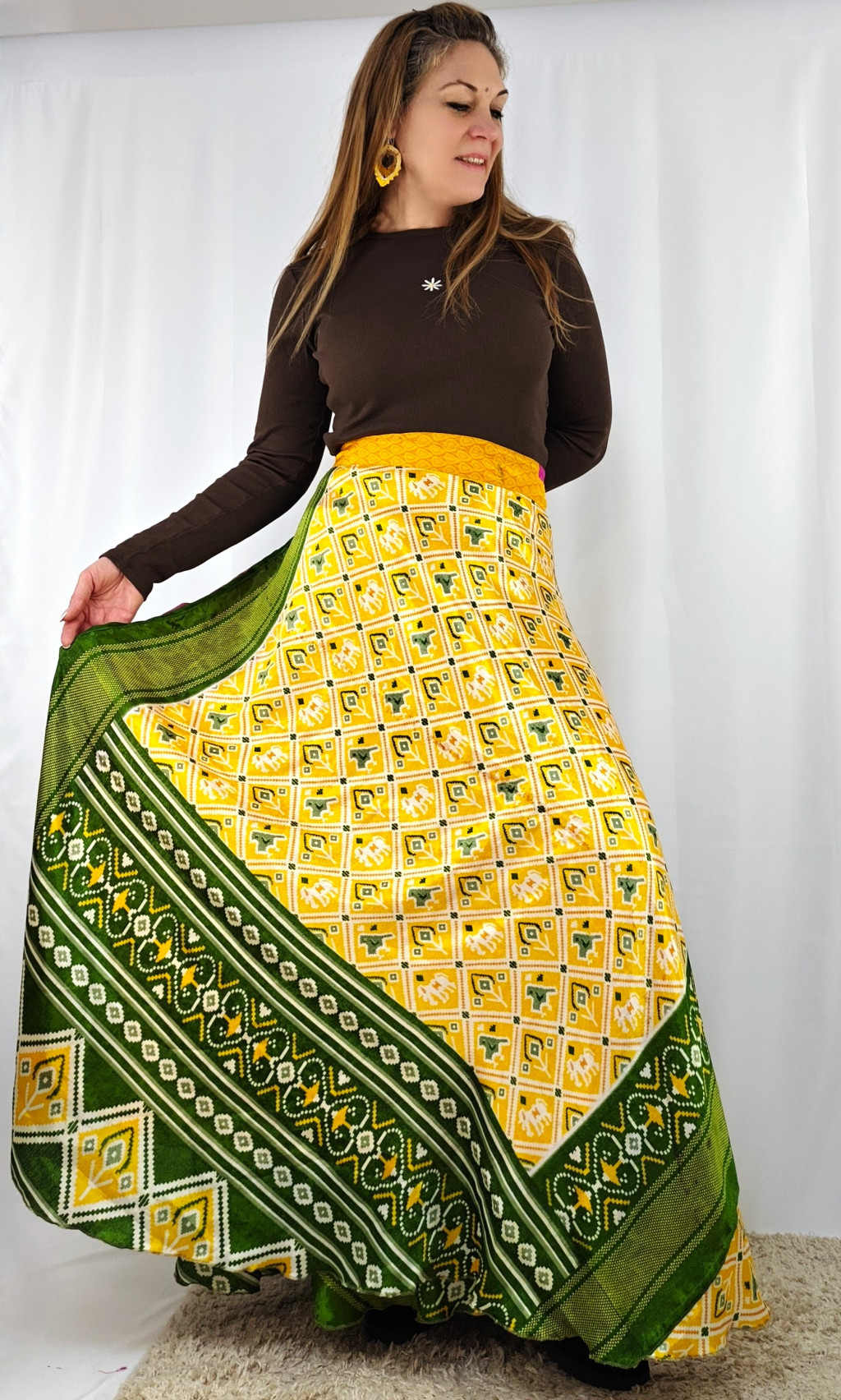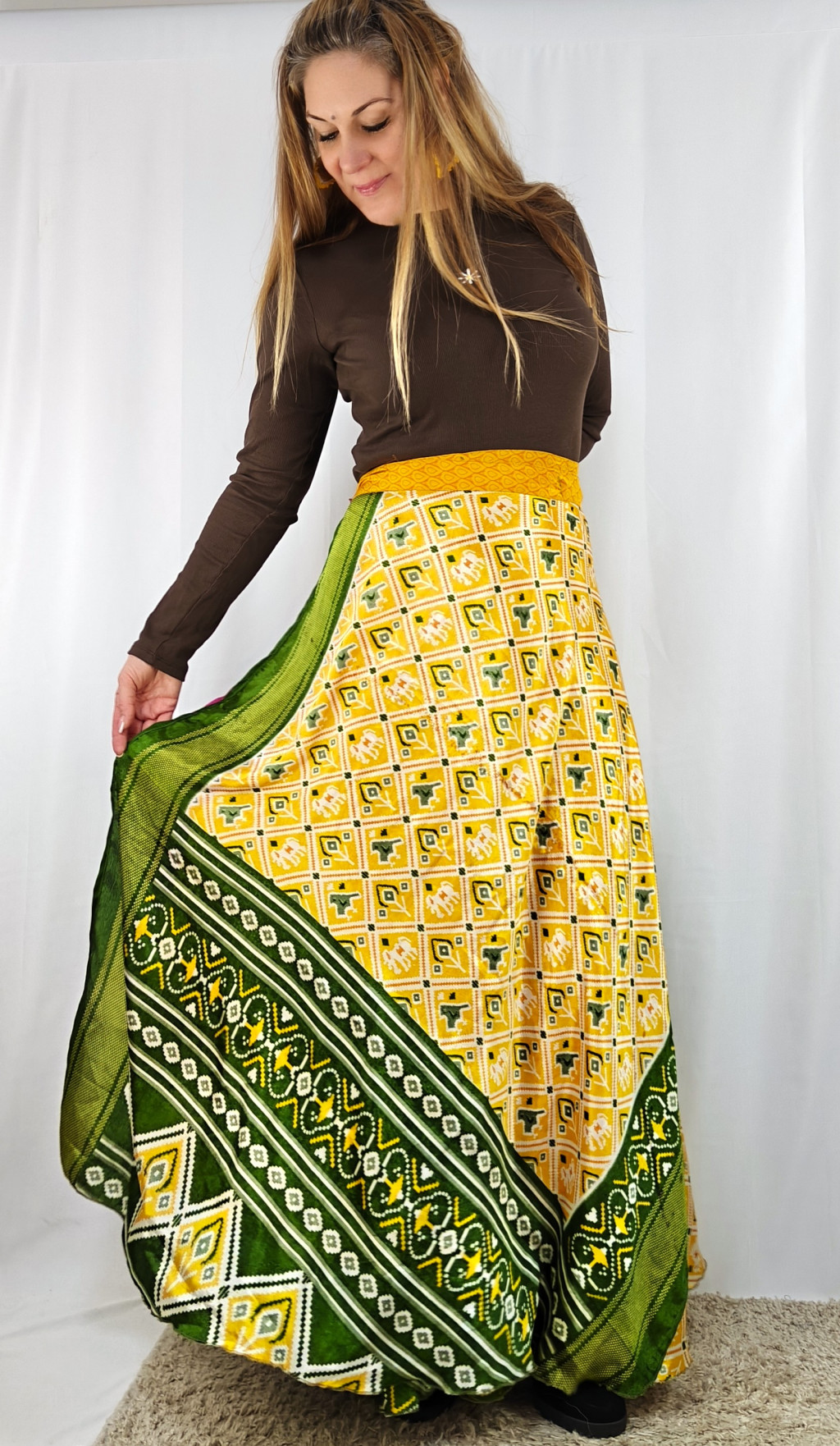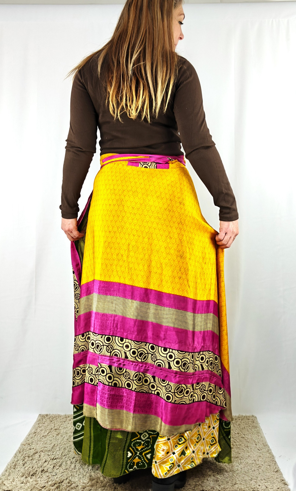 Lapszoknyáink újrahasznosított szárikból készülnek Indiában, egy hosszabb és egy rövidebb anyag derékban összevarrva! Két oldalú, kifordítható, mindkét oldala hordható, sokféleképpen köthető, variálható. Szoknyáinkból nincs két egyforma, mindegyikből csak EGY darab van, ha megtetszik, csapj le rá!