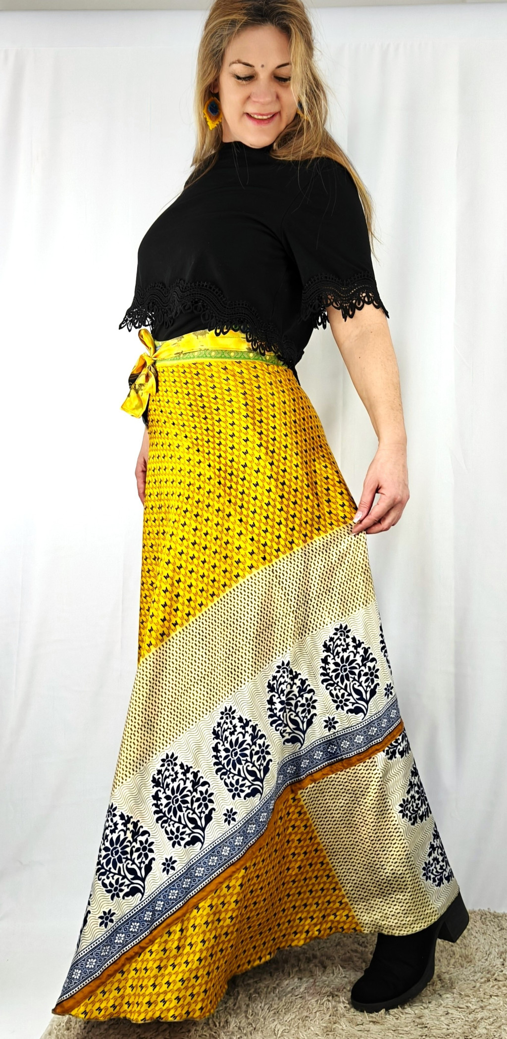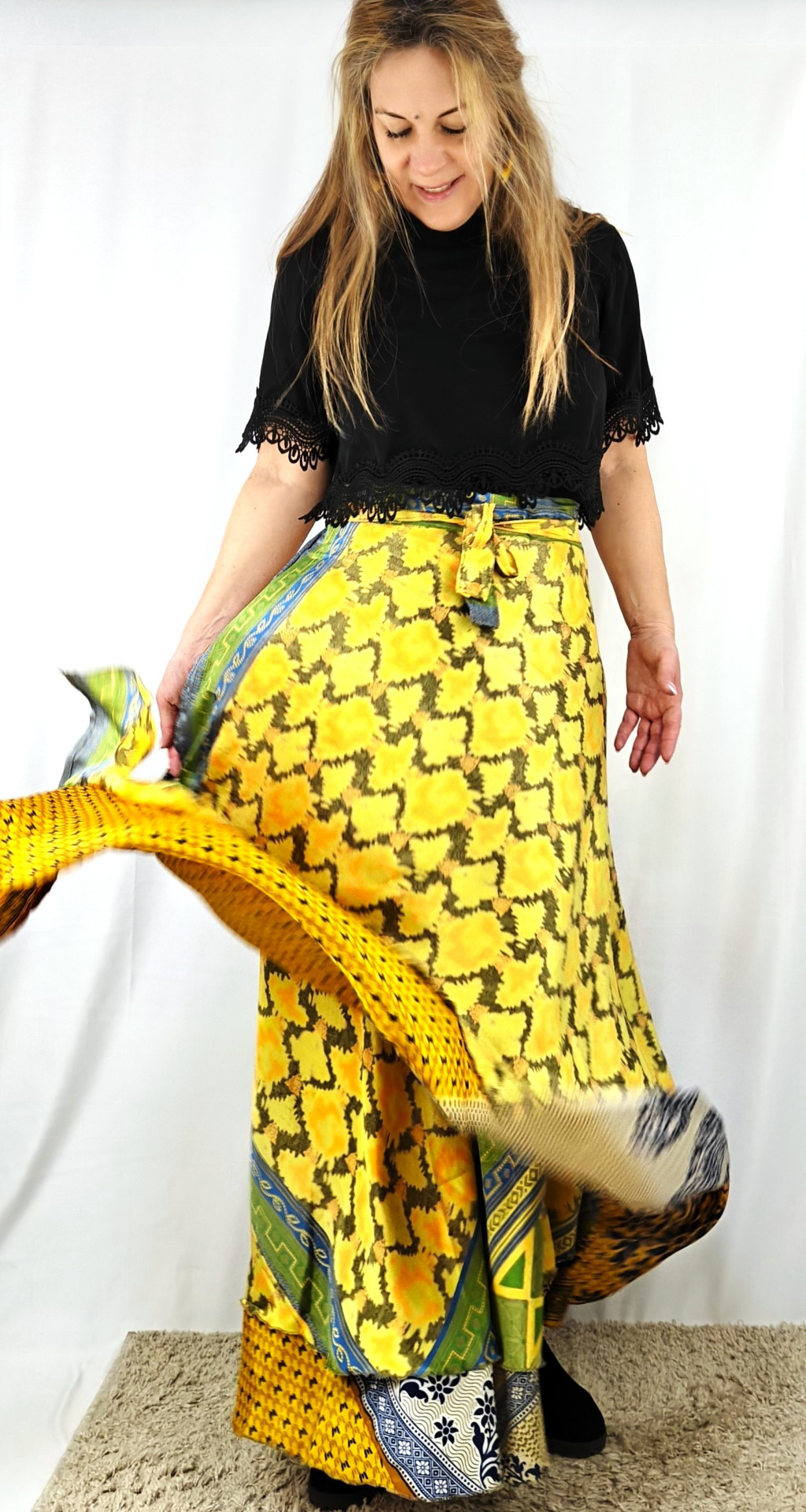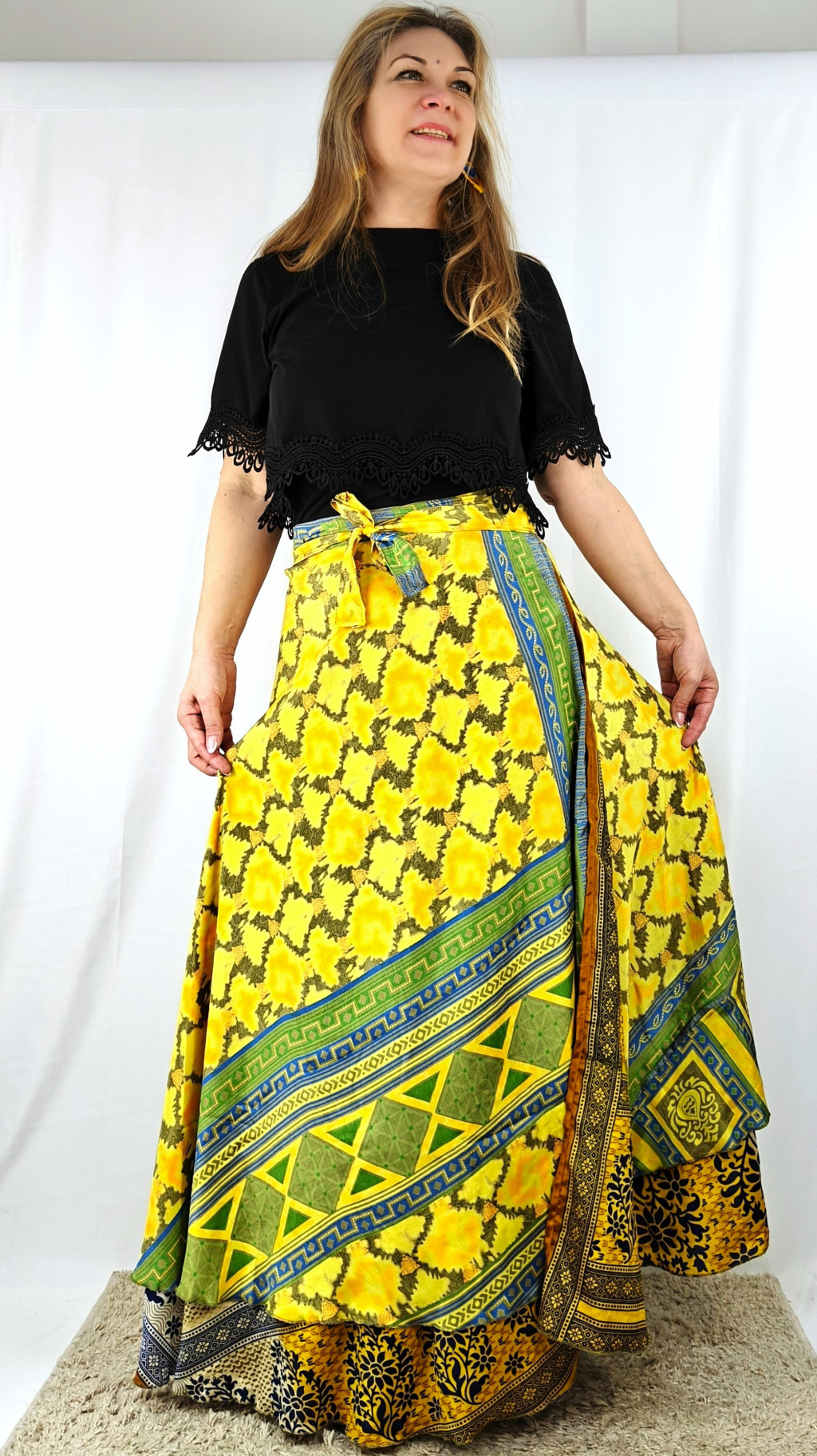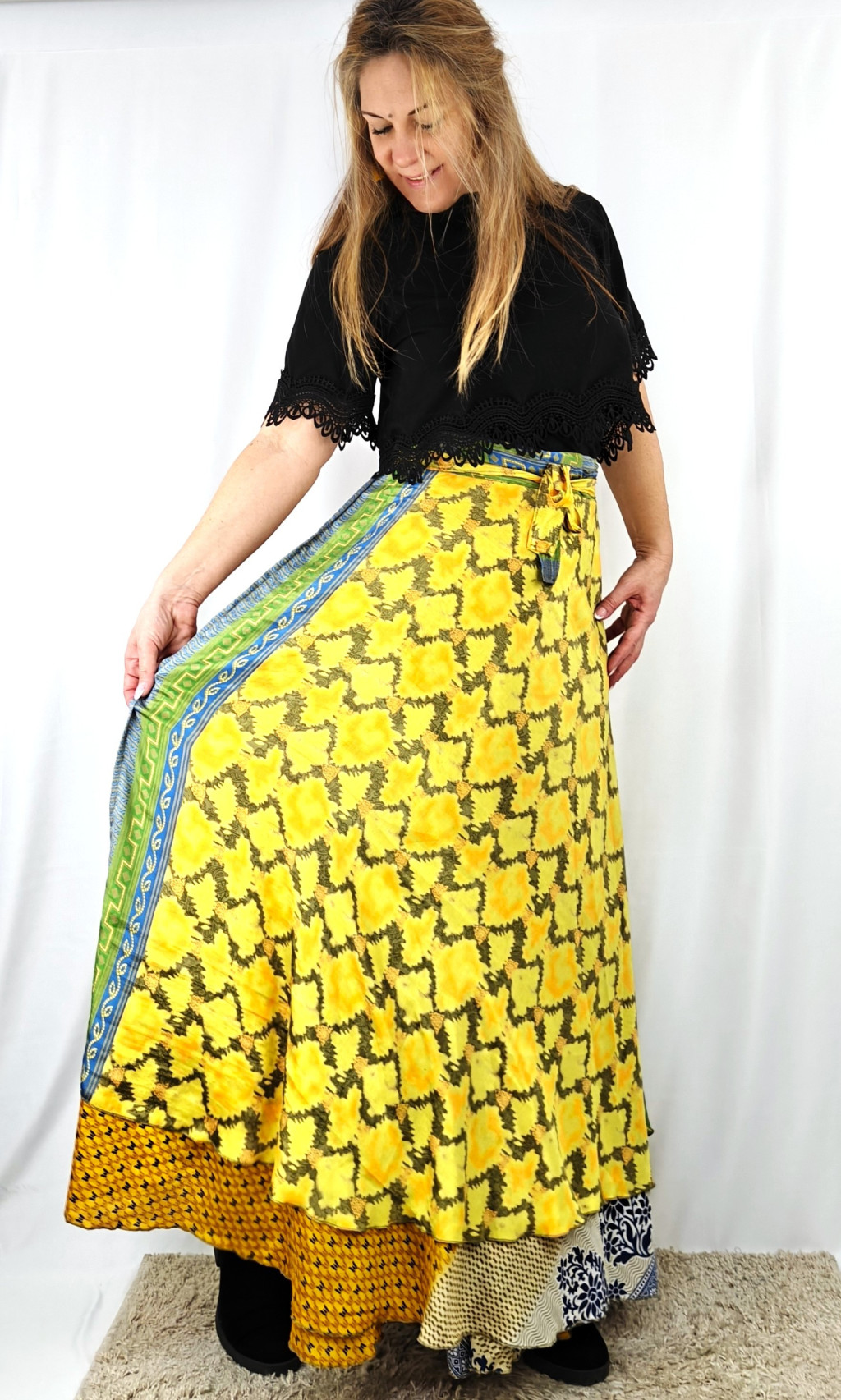 Lapszoknyáink újrahasznosított szárikból készülnek Indiában, egy hosszabb és egy rövidebb anyag derékban összevarrva! Két oldalú, kifordítható, mindkét oldala hordható, sokféleképpen köthető, variálható. Szoknyáinkból nincs két egyforma, mindegyikből csak EGY darab van, ha megtetszik, csapj le rá!