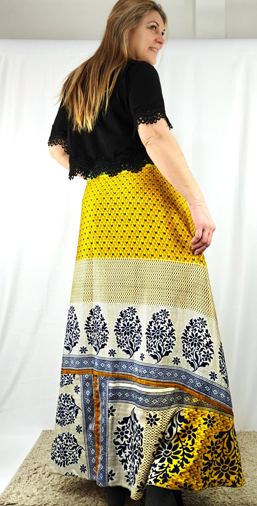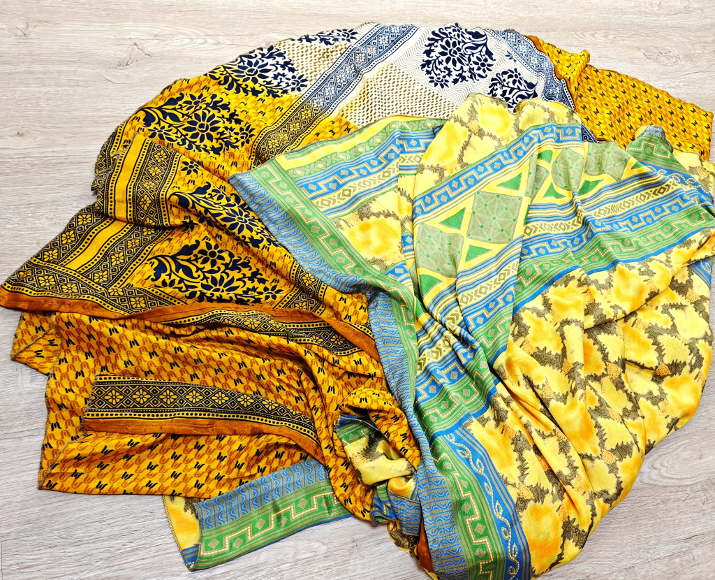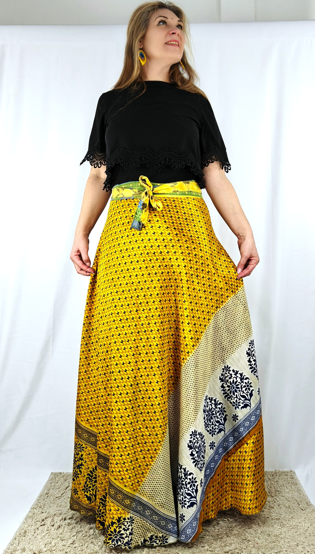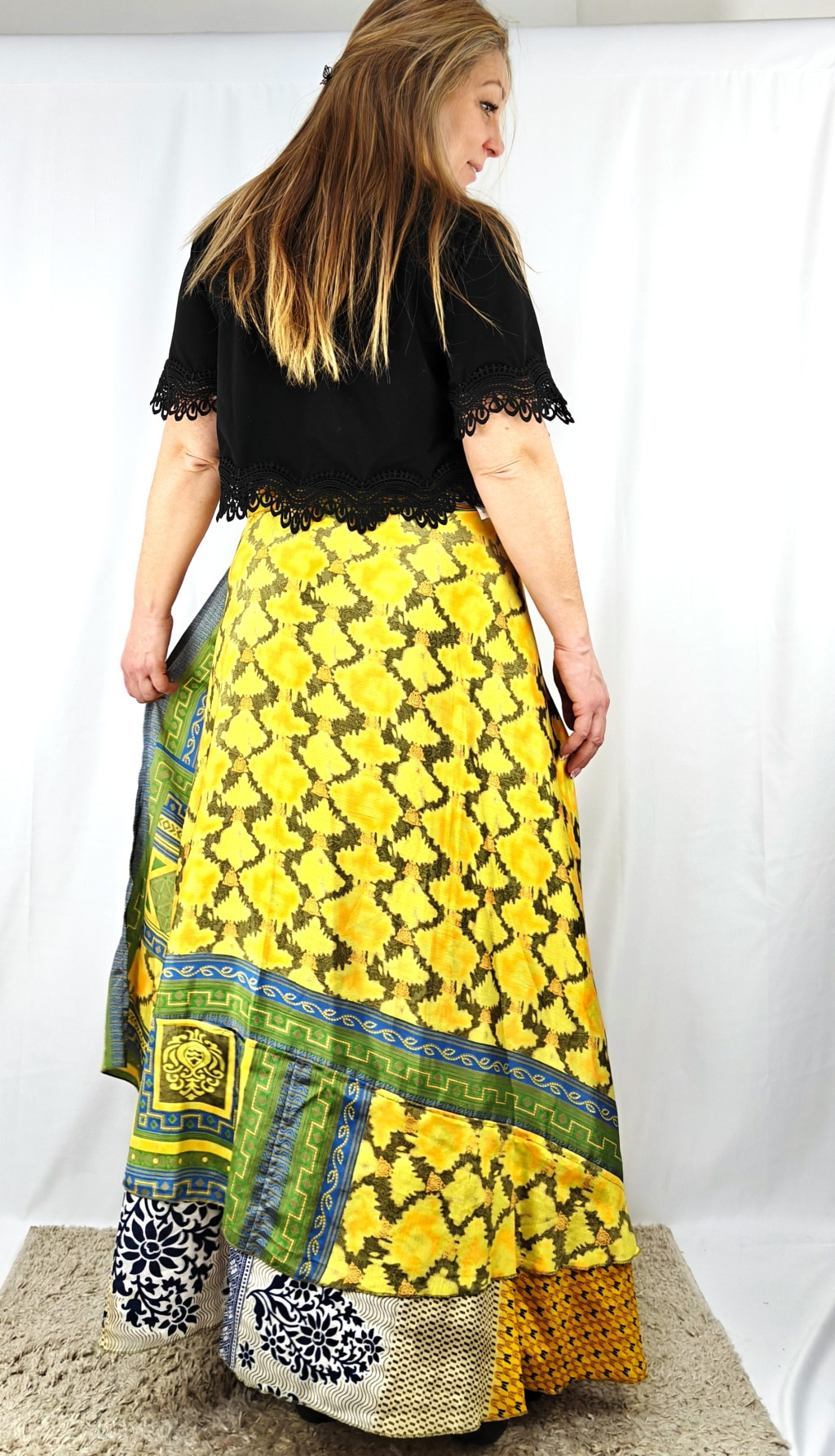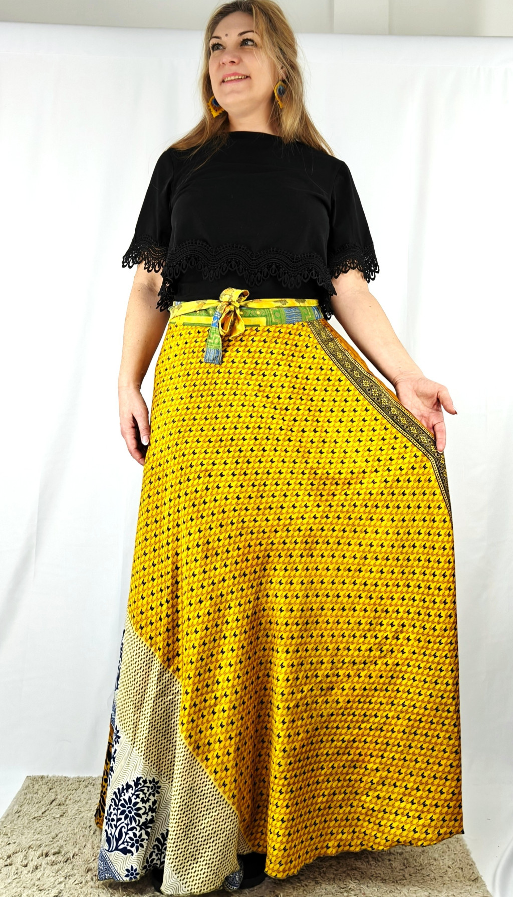 Lapszoknyáink újrahasznosított szárikból készülnek Indiában, egy hosszabb és egy rövidebb anyag derékban összevarrva! Két oldalú, kifordítható, mindkét oldala hordható, sokféleképpen köthető, variálható. Szoknyáinkból nincs két egyforma, mindegyikből csak EGY darab van, ha megtetszik, csapj le rá!