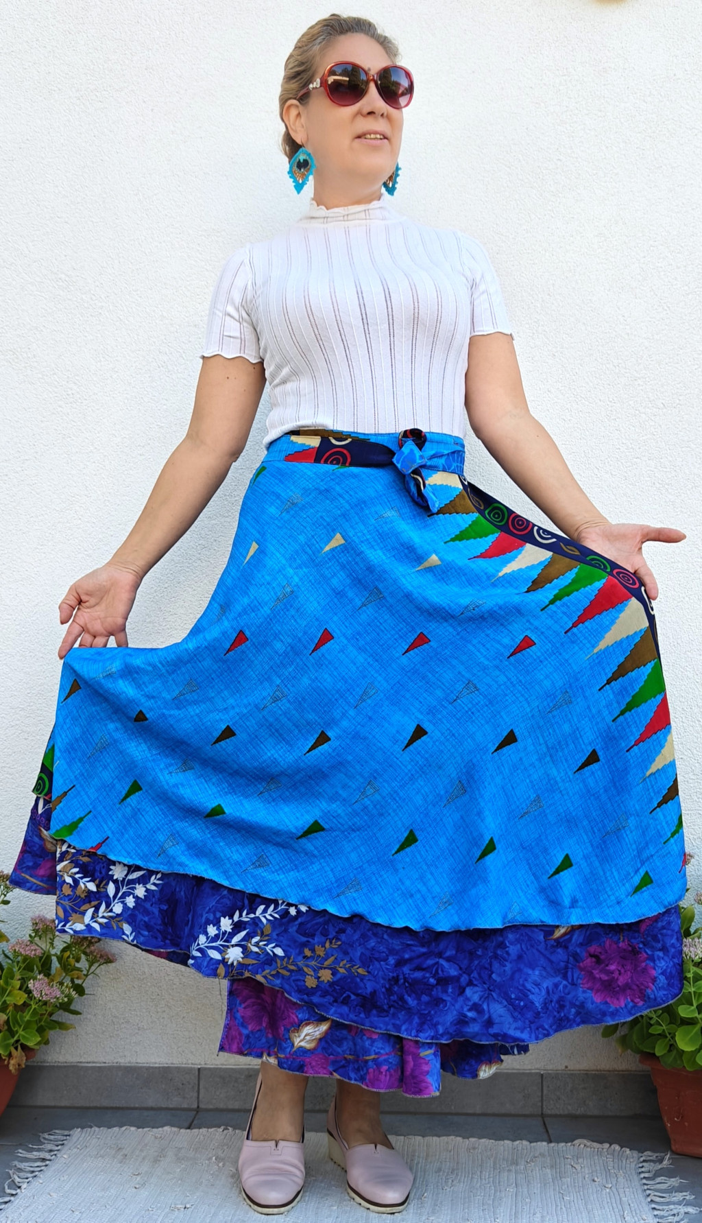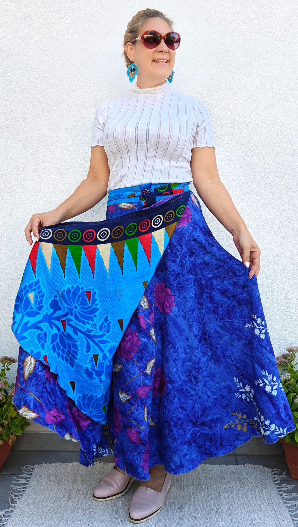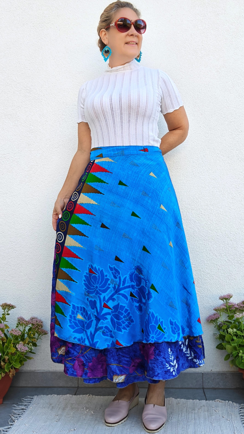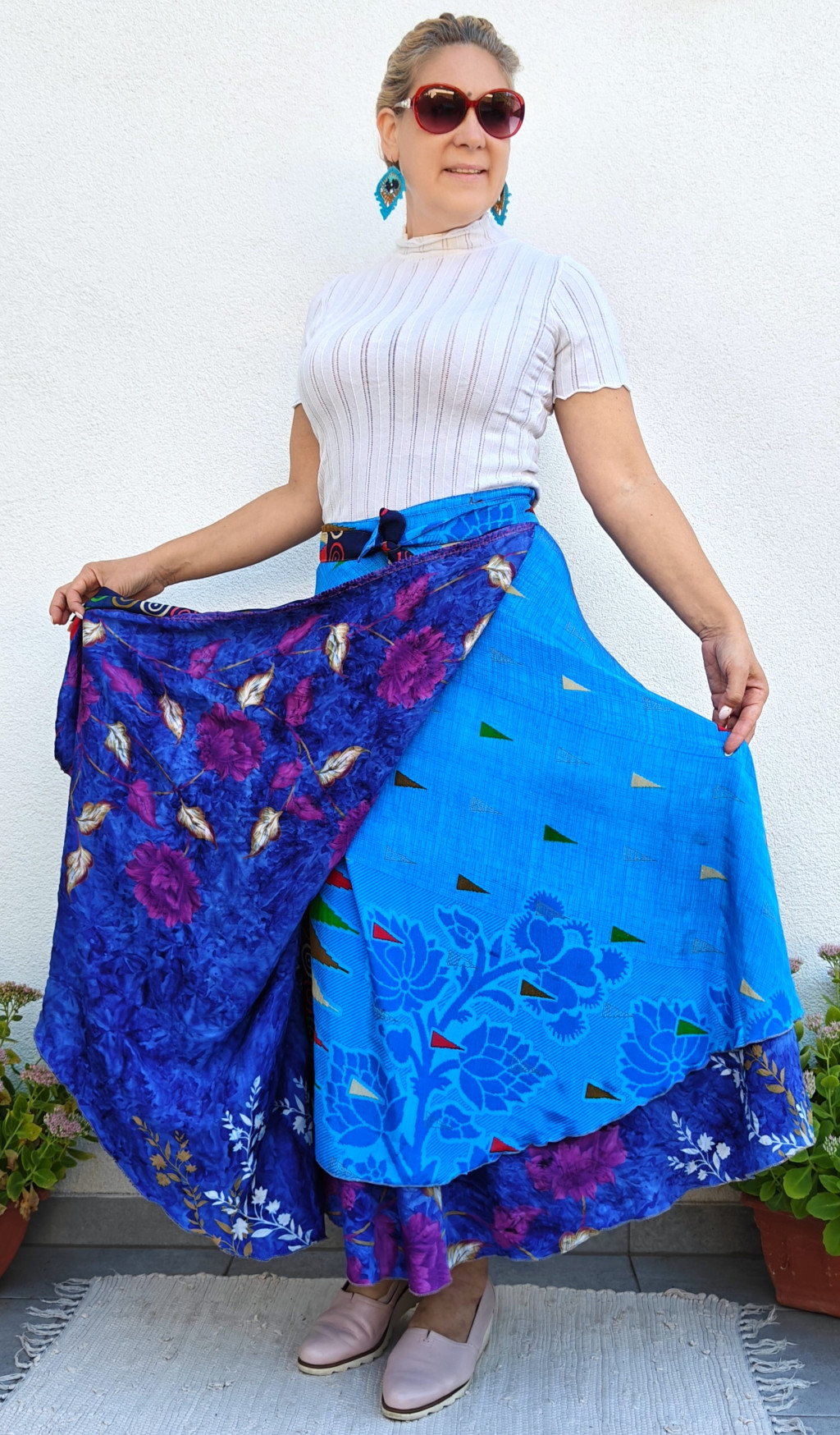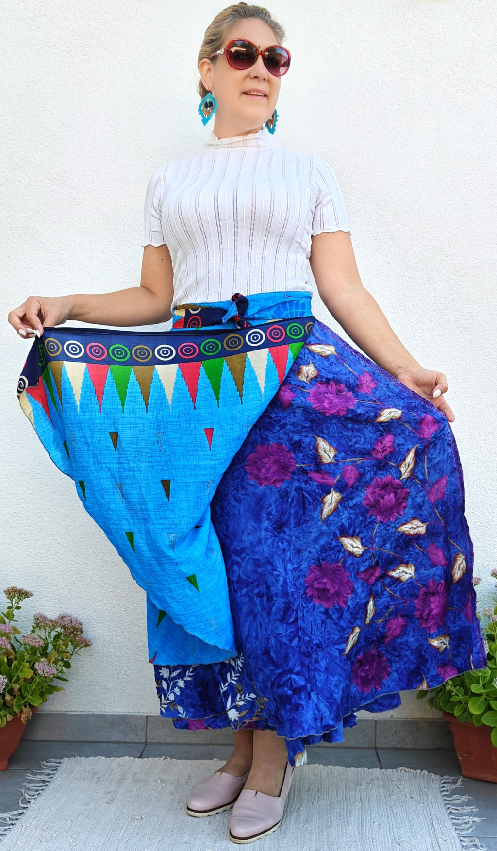 Lapszoknyáink újrahasznosított szárikból készülnek Indiában, egy hosszabb és egy rövidebb anyag derékban összevarrva! Két oldalú, kifordítható, mindkét oldala hordható, sokféleképpen köthető, variálható. Szoknyáinkból nincs két egyforma, mindegyikből csak EGY darab van, ha megtetszik, csapj le rá!