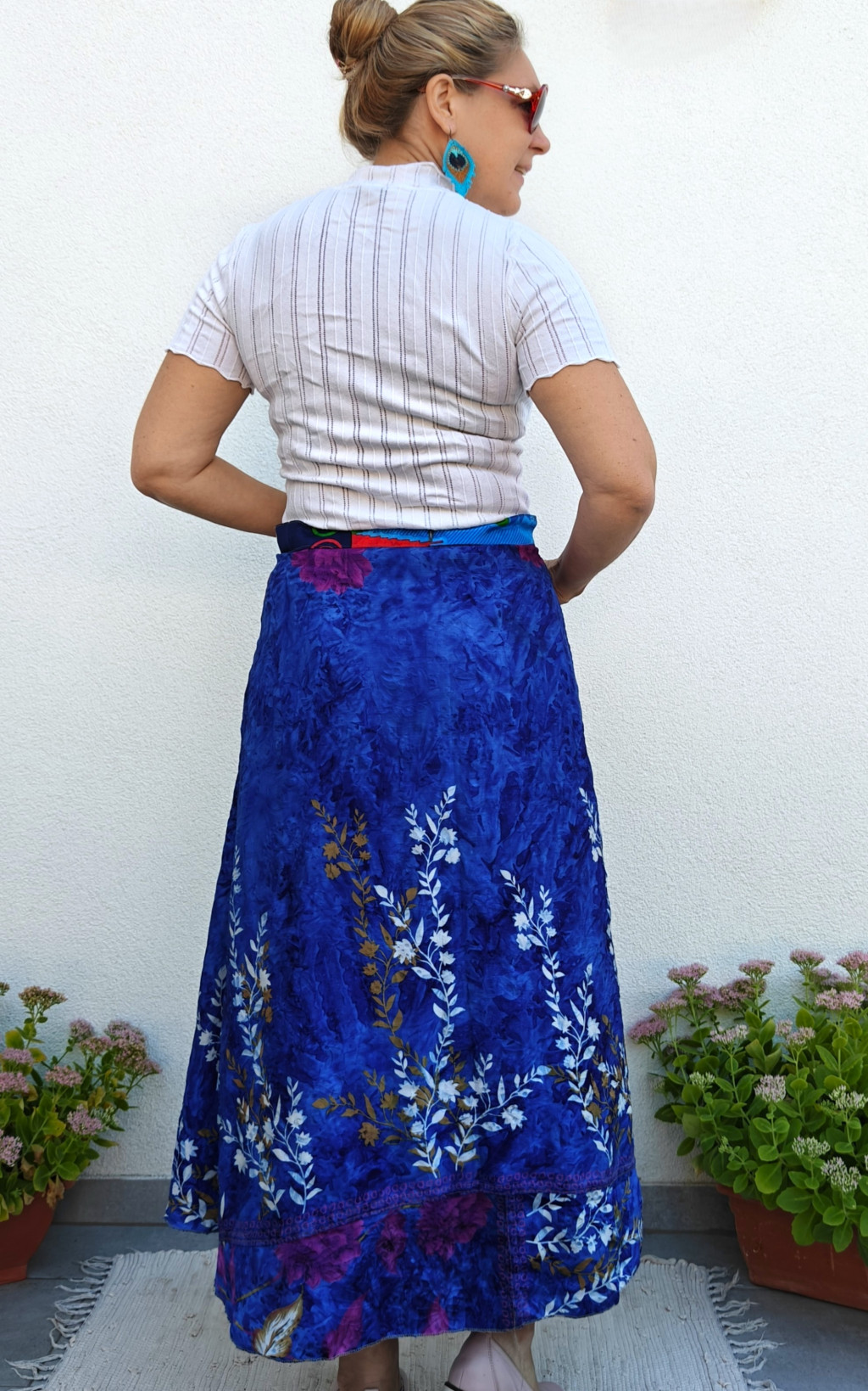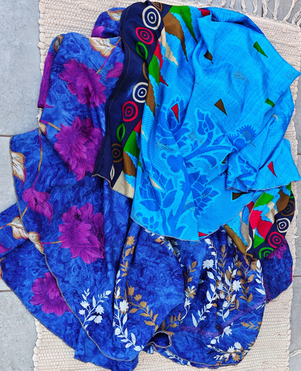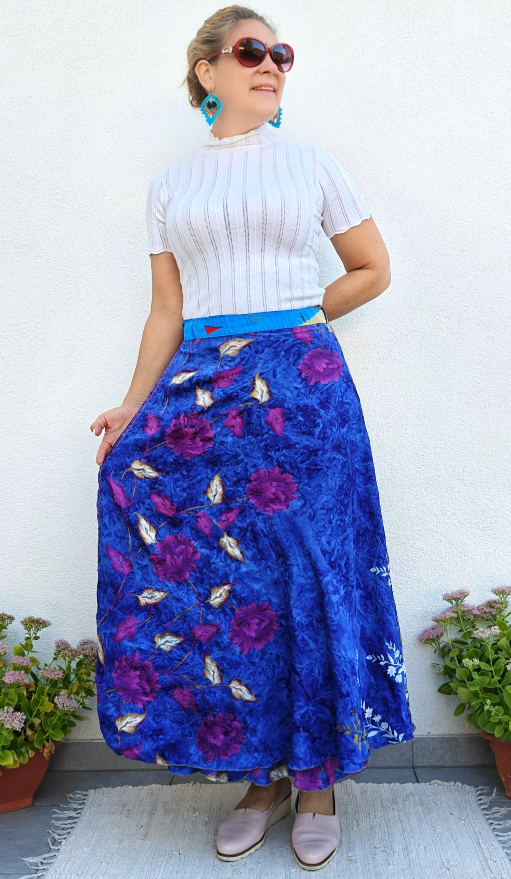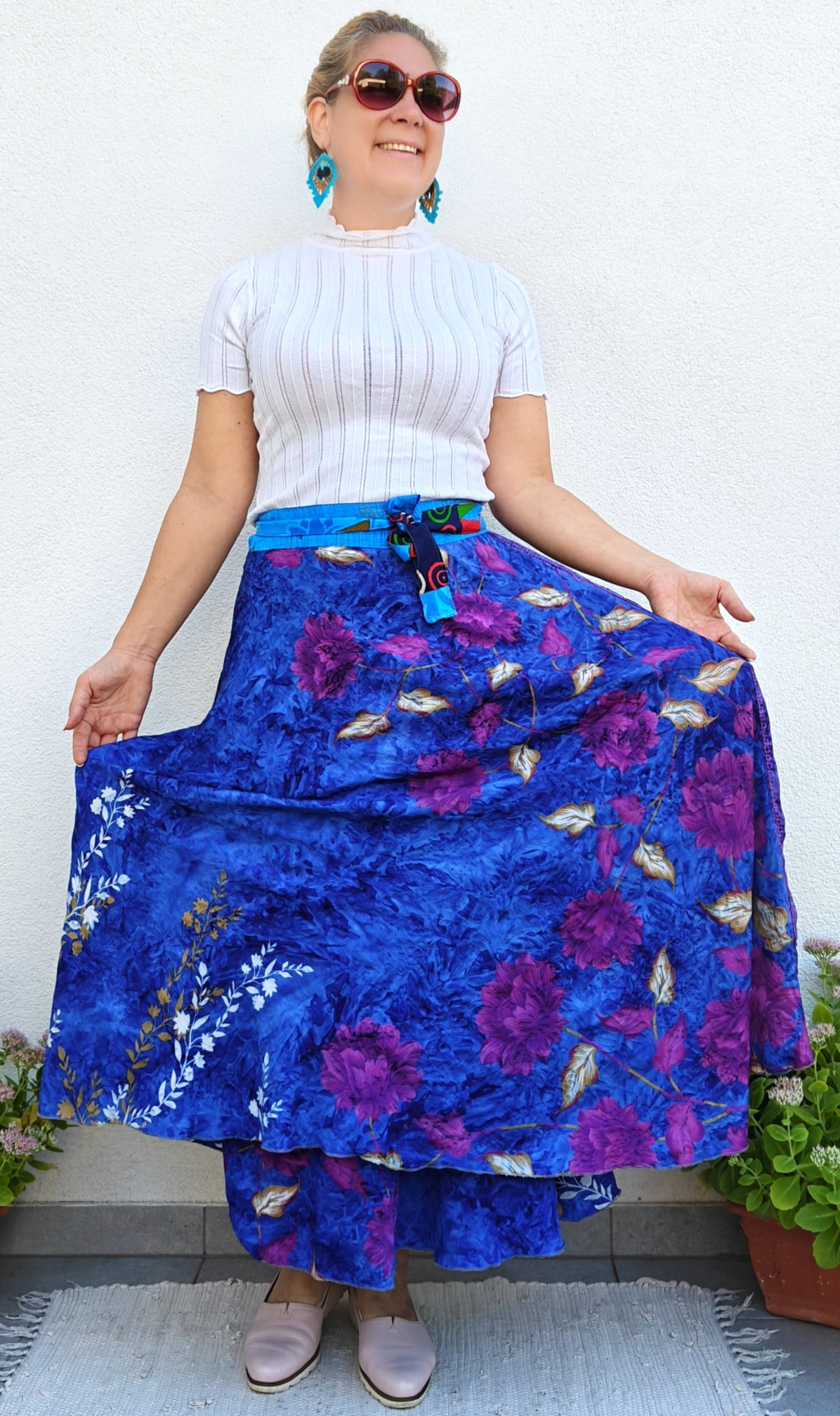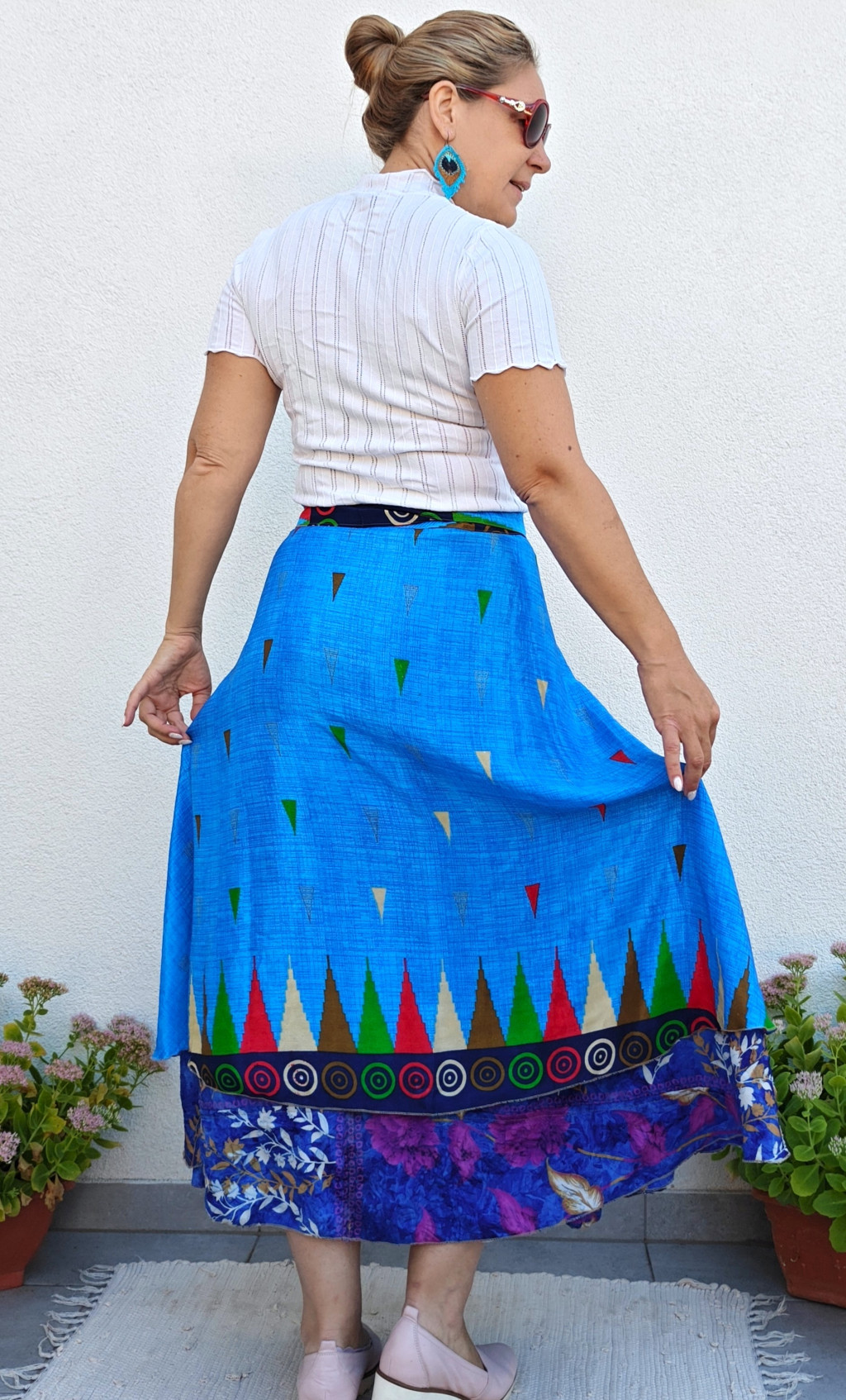 Lapszoknyáink újrahasznosított szárikból készülnek Indiában, egy hosszabb és egy rövidebb anyag derékban összevarrva! Két oldalú, kifordítható, mindkét oldala hordható, sokféleképpen köthető, variálható. Szoknyáinkból nincs két egyforma, mindegyikből csak EGY darab van, ha megtetszik, csapj le rá!