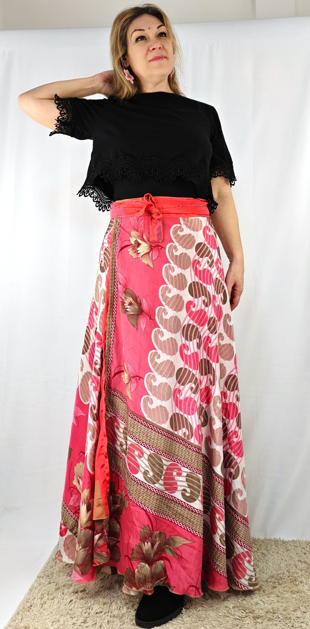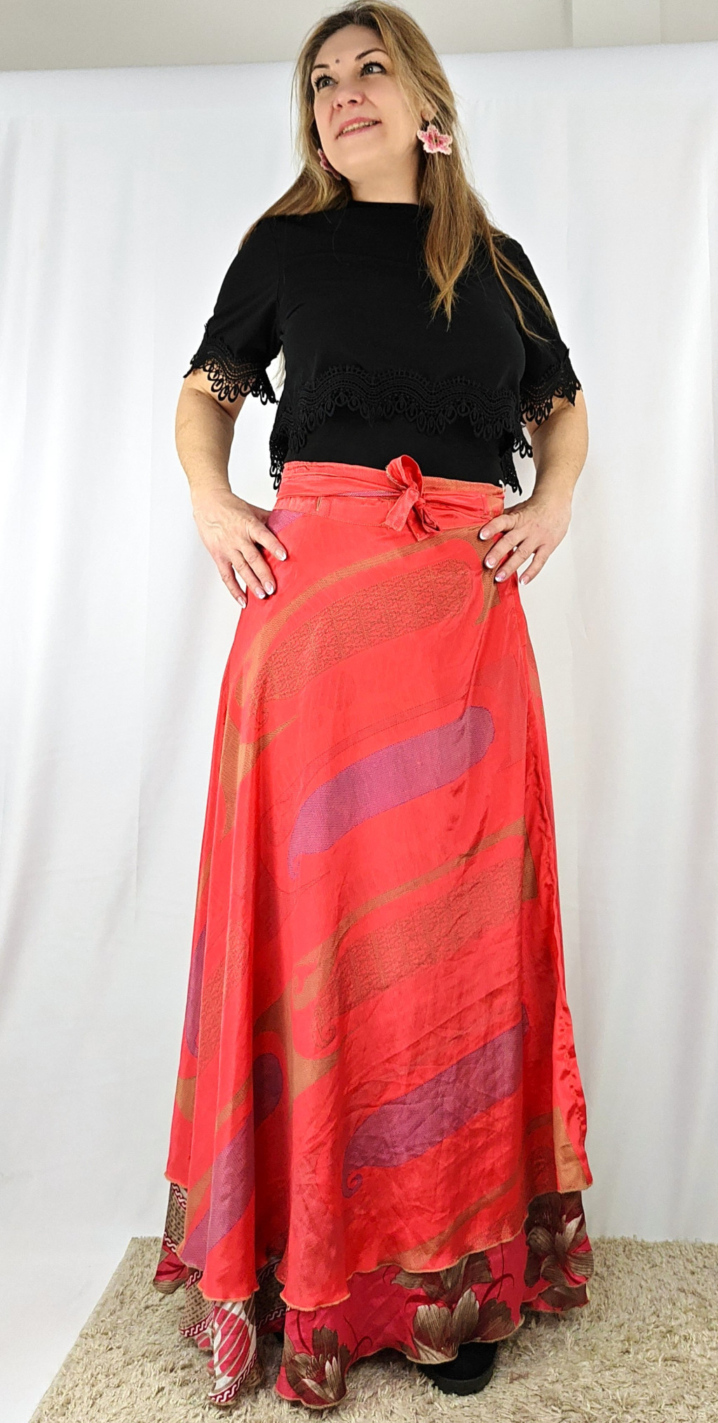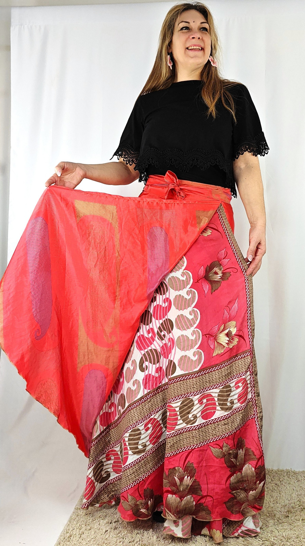 Lapszoknyáink újrahasznosított szárikból készülnek Indiában, egy hosszabb és egy rövidebb anyag derékban összevarrva! Két oldalú, kifordítható, mindkét oldala hordható, sokféleképpen köthető, variálható. Szoknyáinkból nincs két egyforma, mindegyikből csak EGY darab van, ha megtetszik, csapj le rá!