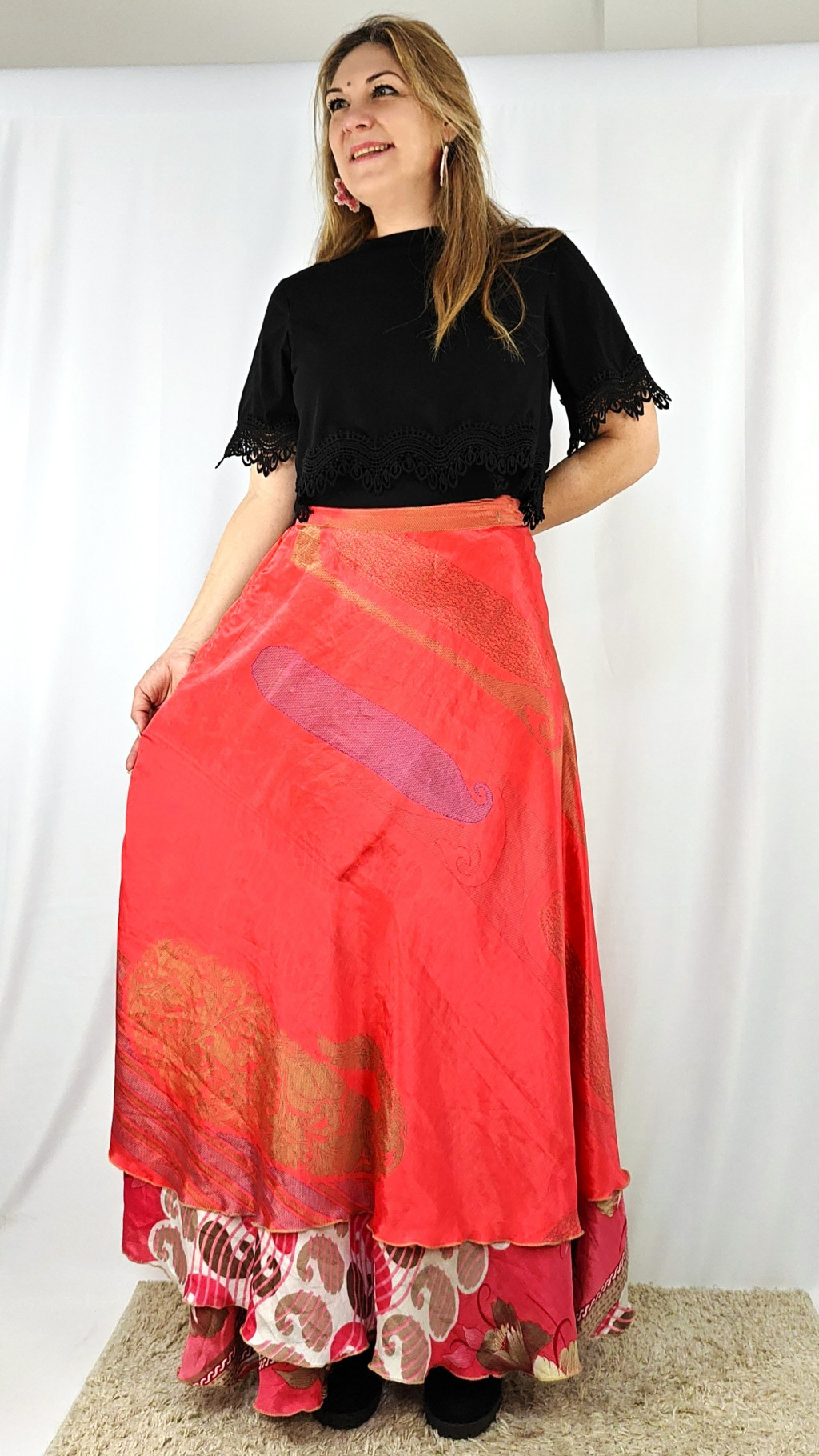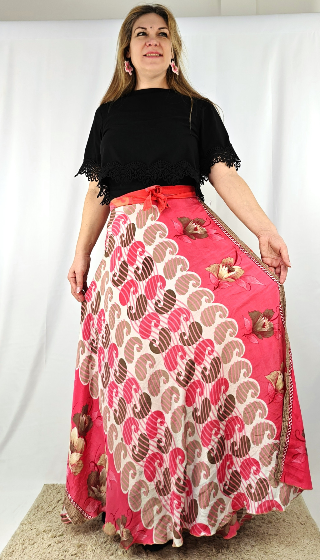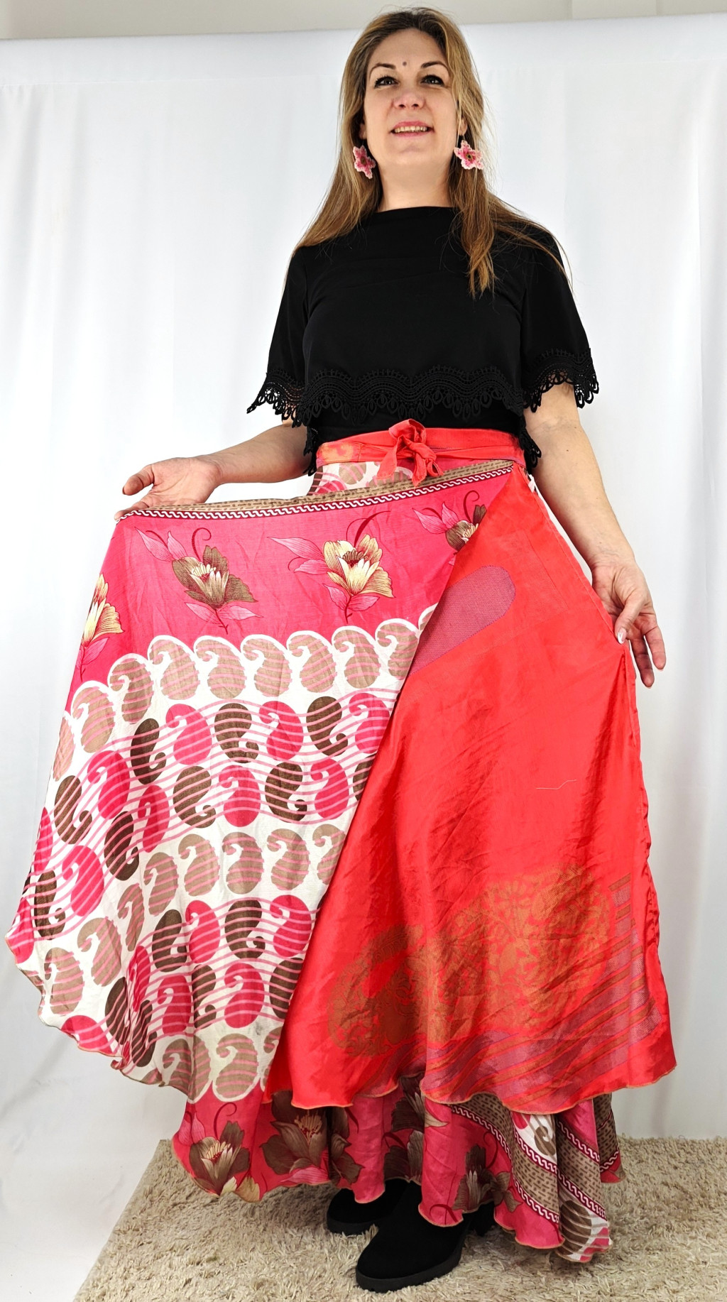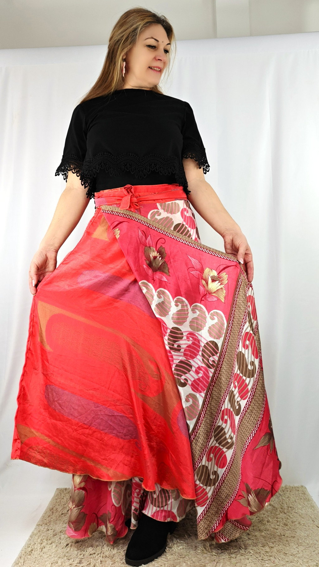Lapszoknyáink újrahasznosított szárikból készülnek Indiában, egy hosszabb és egy rövidebb anyag derékban összevarrva! Két oldalú, kifordítható, mindkét oldala hordható, sokféleképpen köthető, variálható. Szoknyáinkból nincs két egyforma, mindegyikből csak EGY darab van, ha megtetszik, csapj le rá!