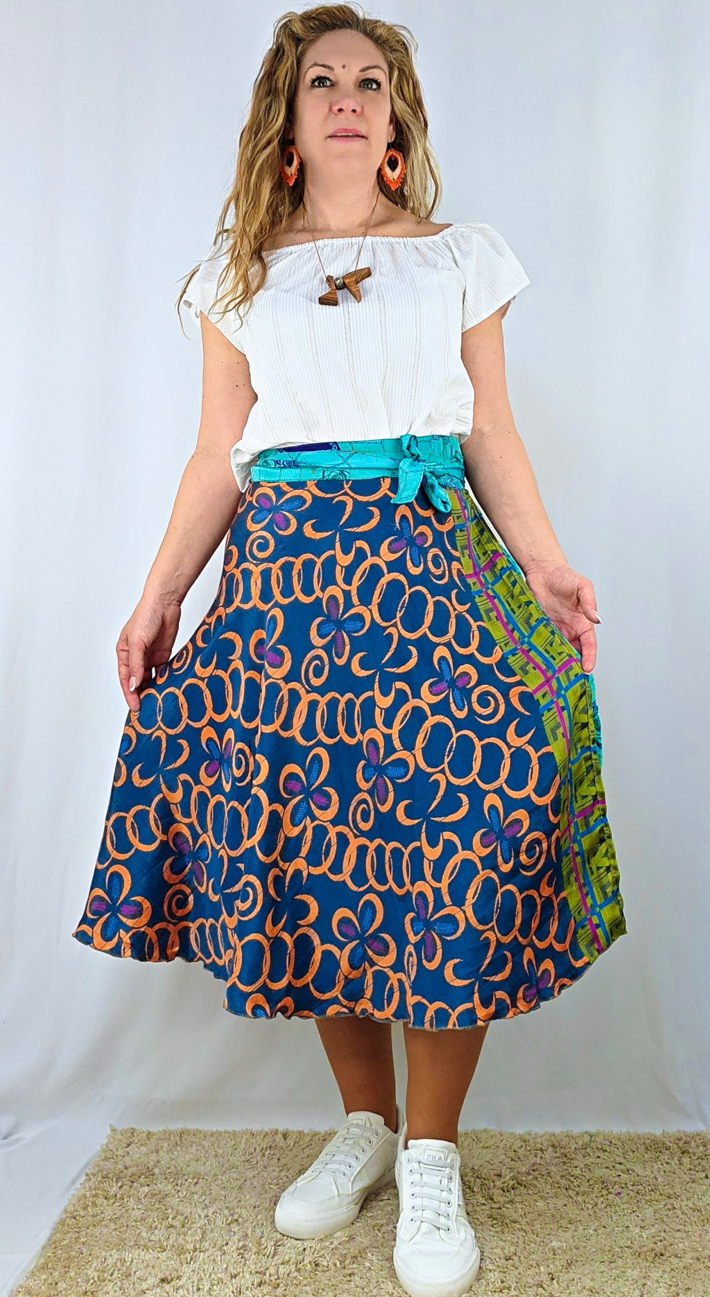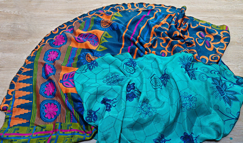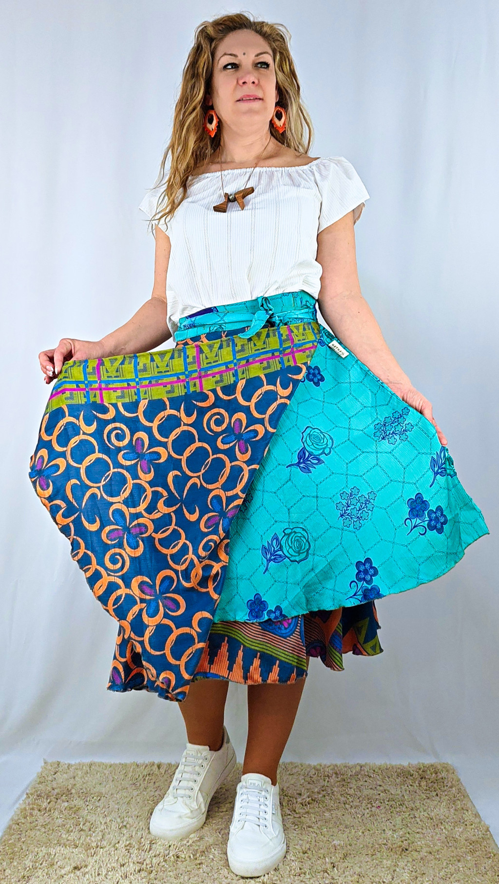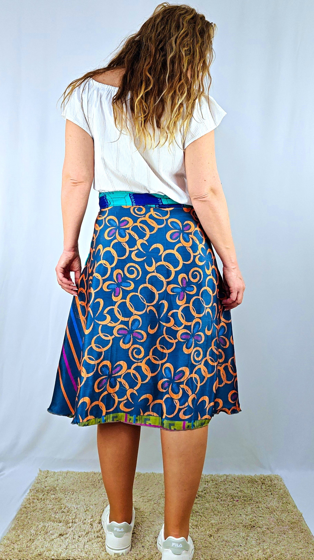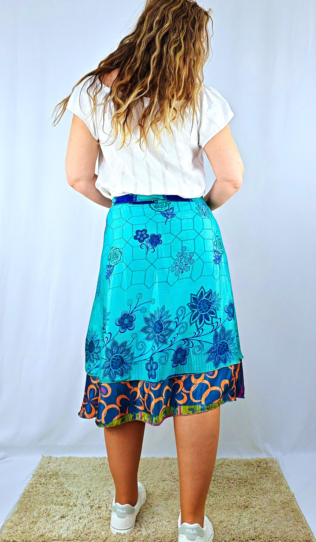Lapszoknyáink újrahasznosított szárikból készülnek Indiában, egy hosszabb és egy rövidebb anyag derékban összevarrva! Két oldalú, kifordítható, mindkét oldala hordható, sokféleképpen köthető, variálható. Szoknyáinkból nincs két egyforma, mindegyikből csak EGY darab van, ha megtetszik, csapj le rá!