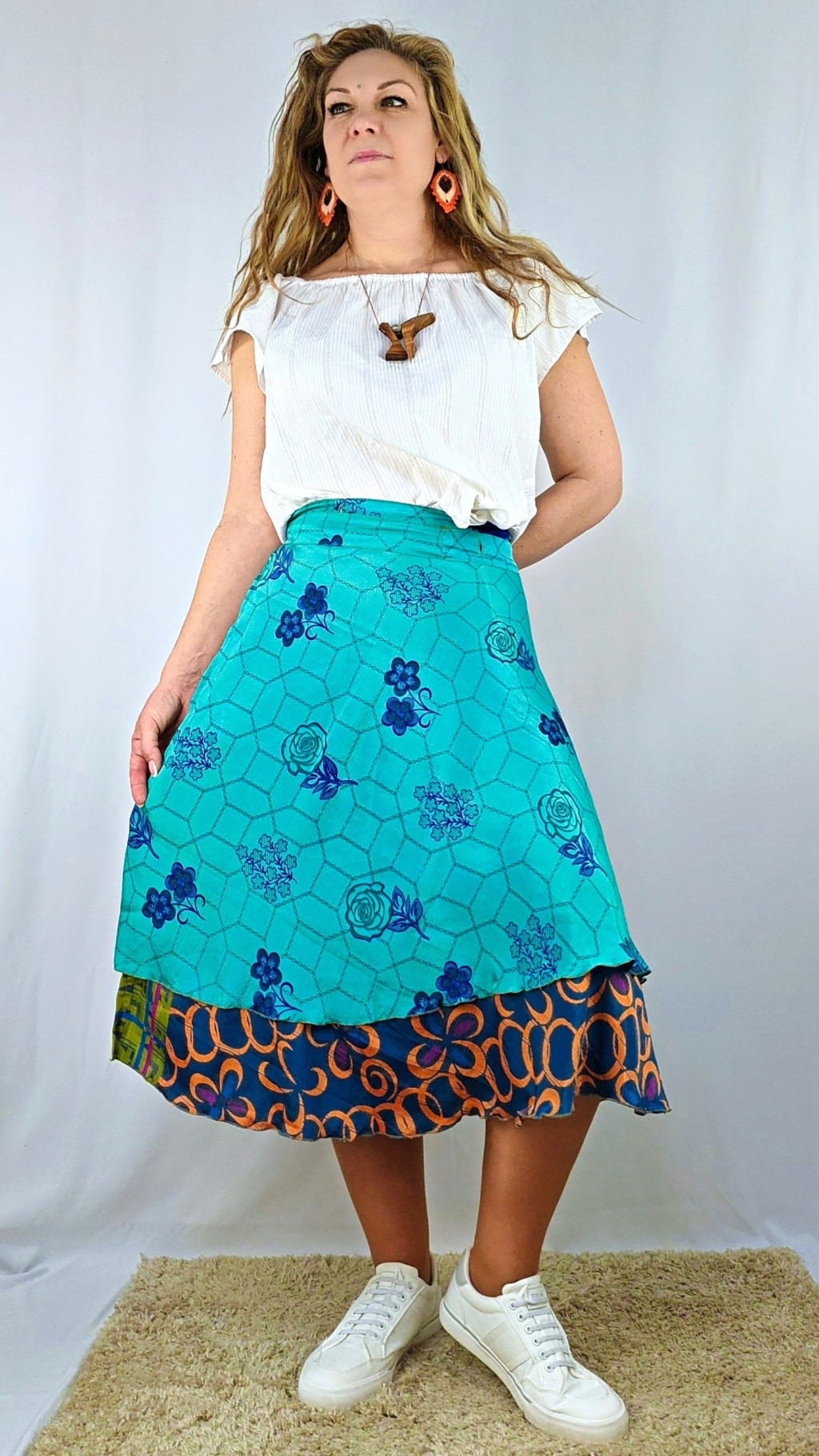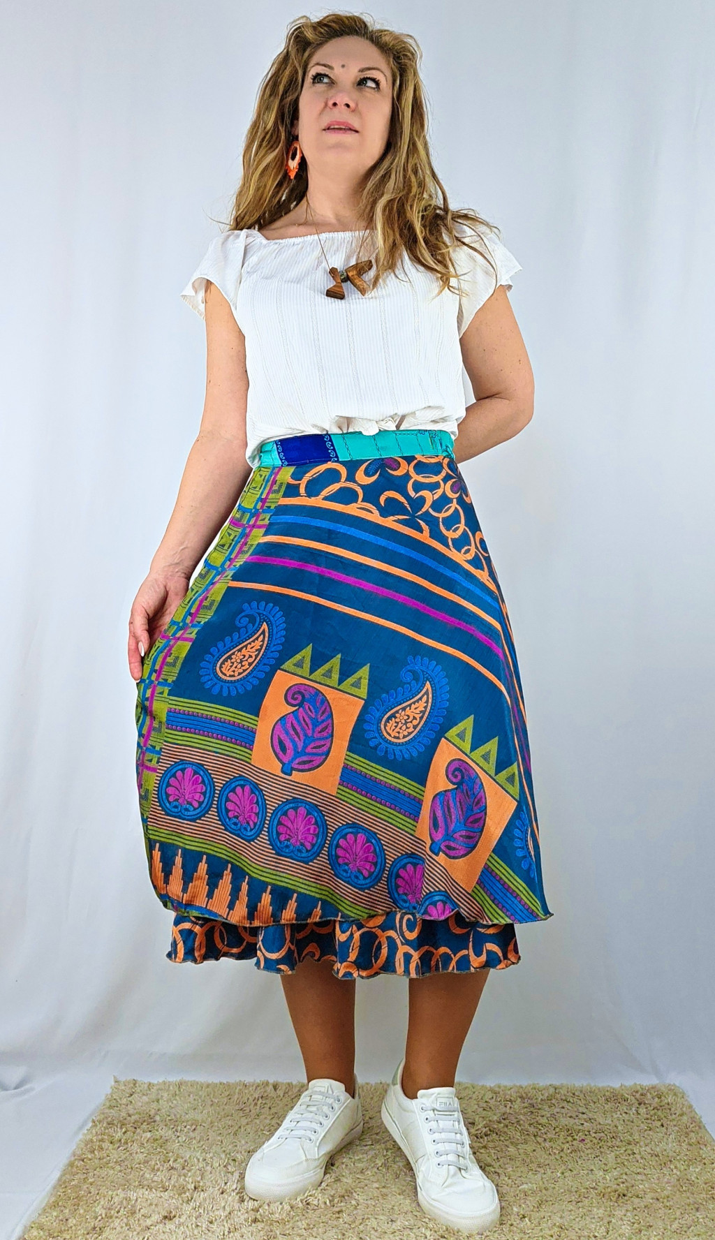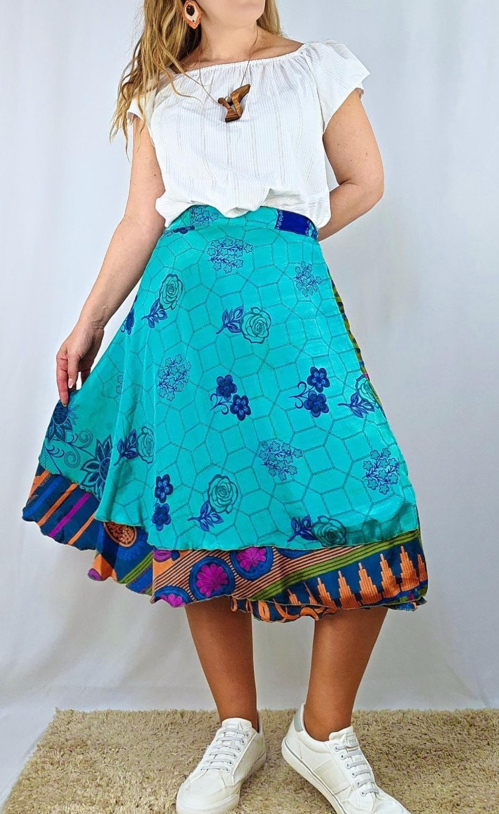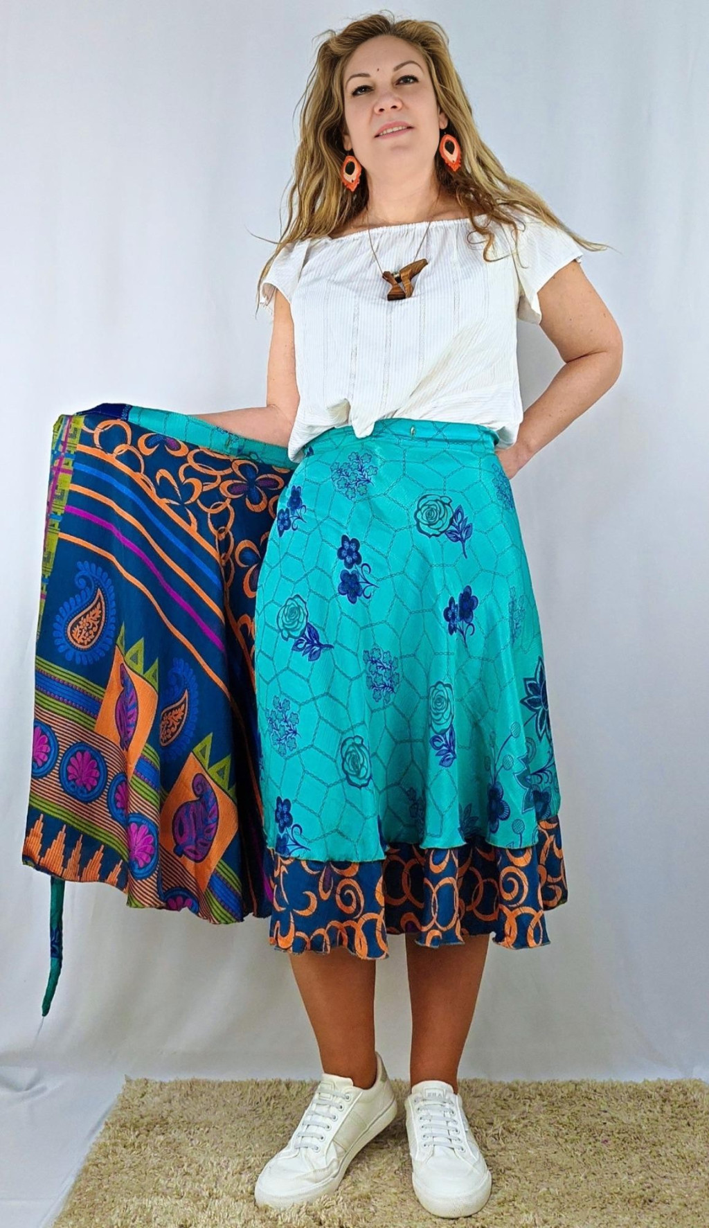 Lapszoknyáink újrahasznosított szárikból készülnek Indiában, egy hosszabb és egy rövidebb anyag derékban összevarrva! Két oldalú, kifordítható, mindkét oldala hordható, sokféleképpen köthető, variálható. Szoknyáinkból nincs két egyforma, mindegyikből csak EGY darab van, ha megtetszik, csapj le rá!