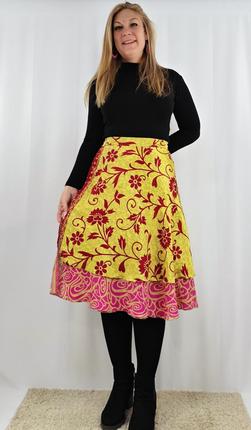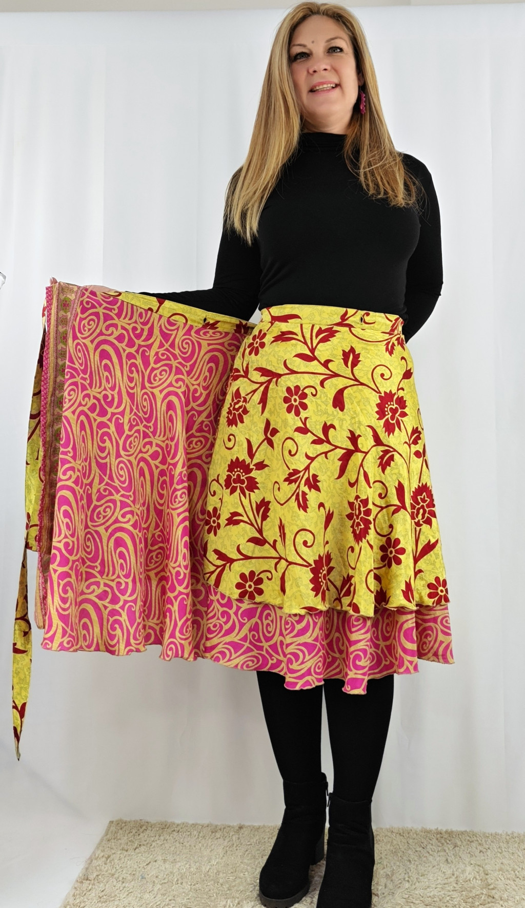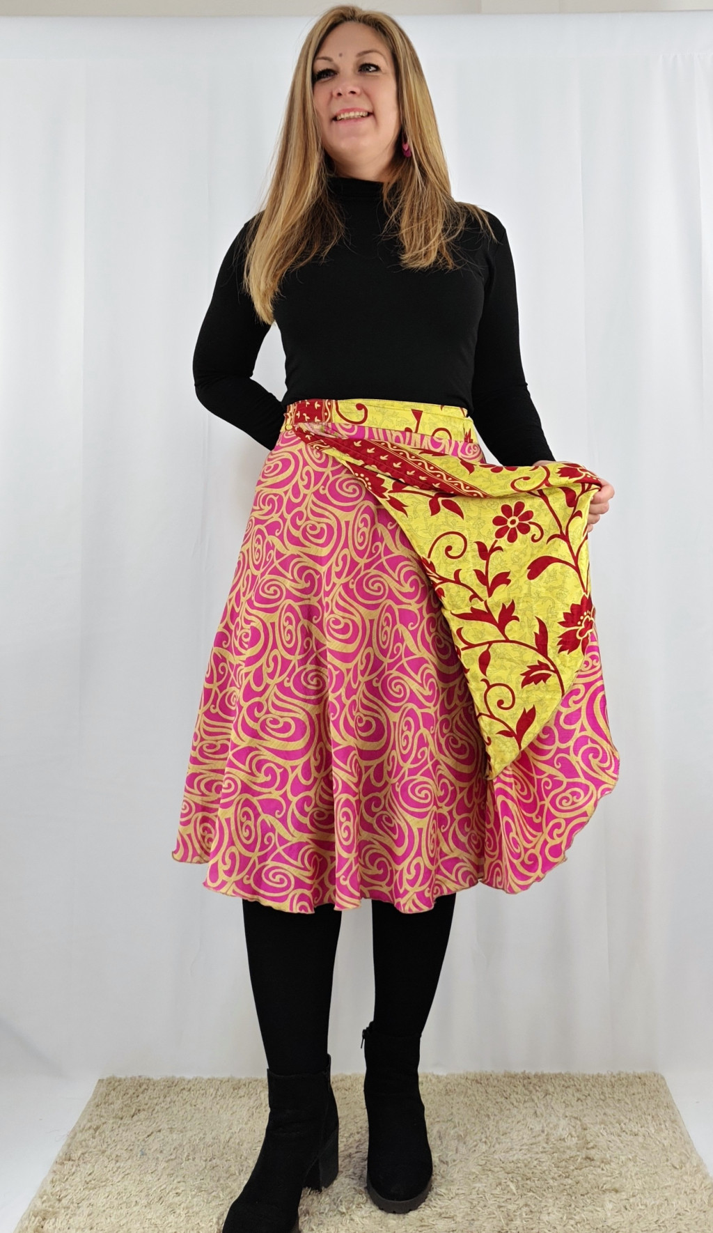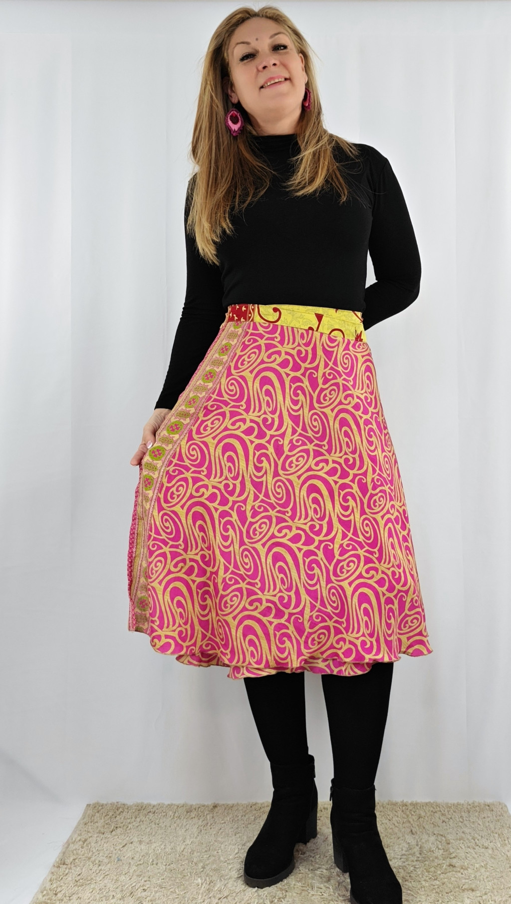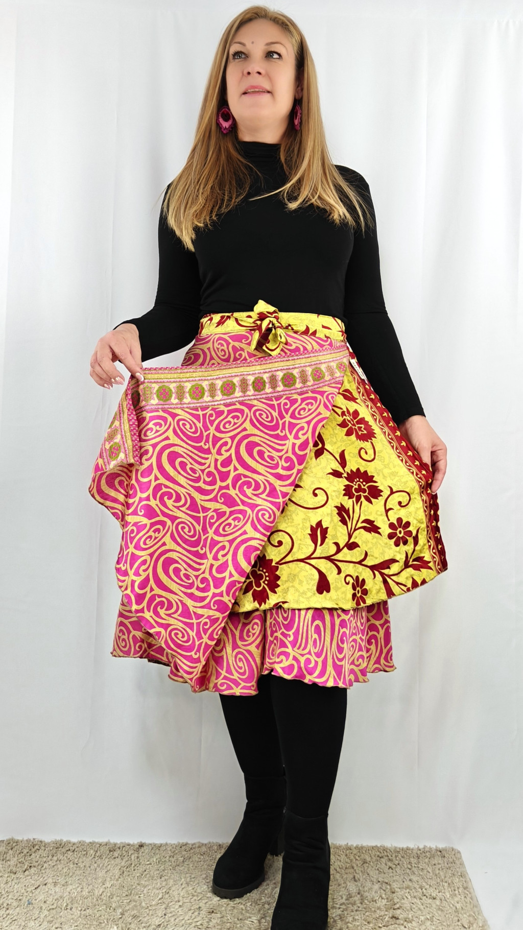 Lapszoknyáink újrahasznosított szárikból készülnek Indiában, egy hosszabb és egy rövidebb anyag derékban összevarrva! Két oldalú, kifordítható, mindkét oldala hordható, sokféleképpen köthető, variálható. Szoknyáinkból nincs két egyforma, mindegyikből csak EGY darab van, ha megtetszik, csapj le rá!