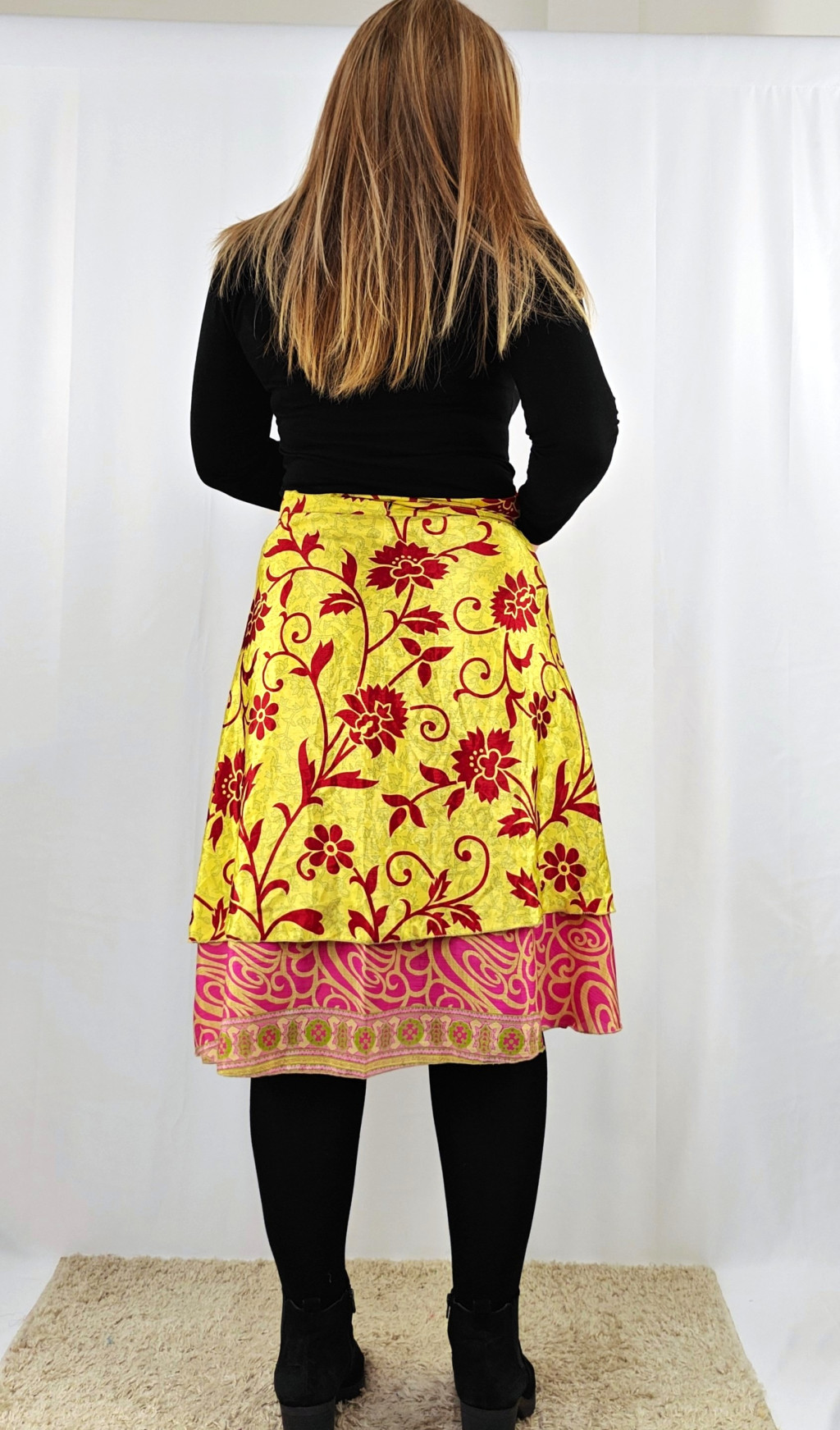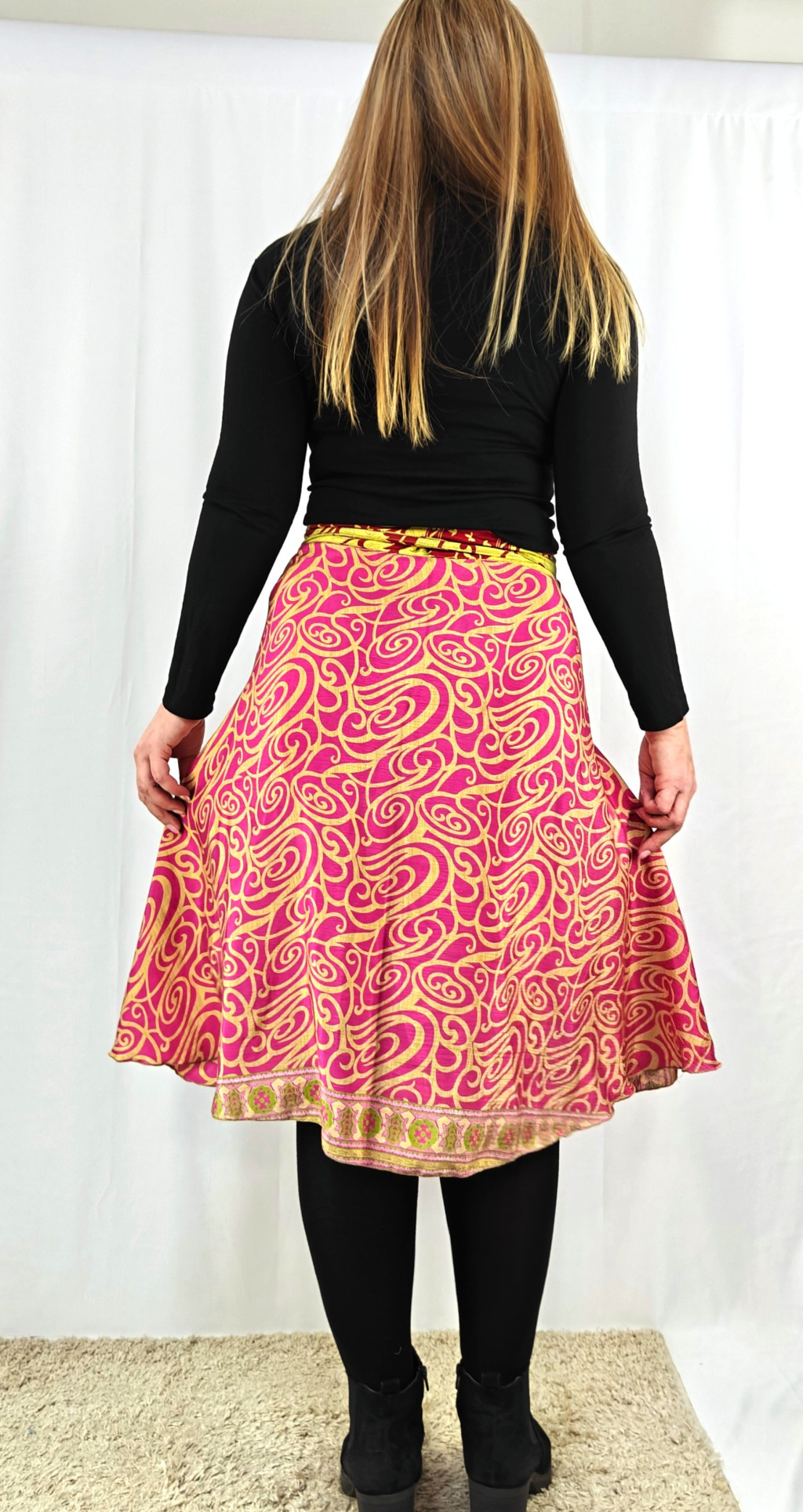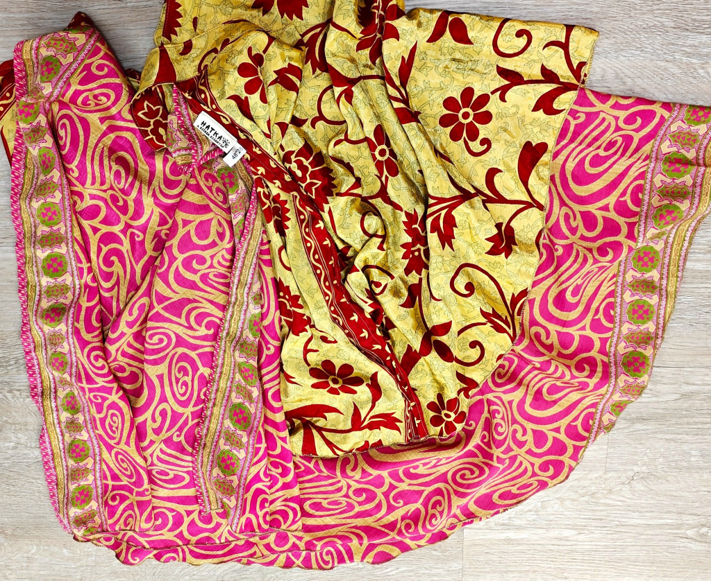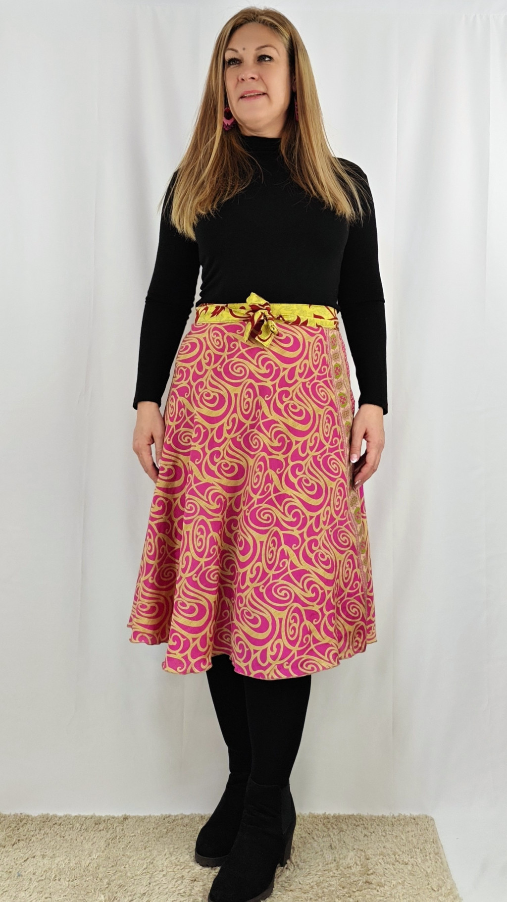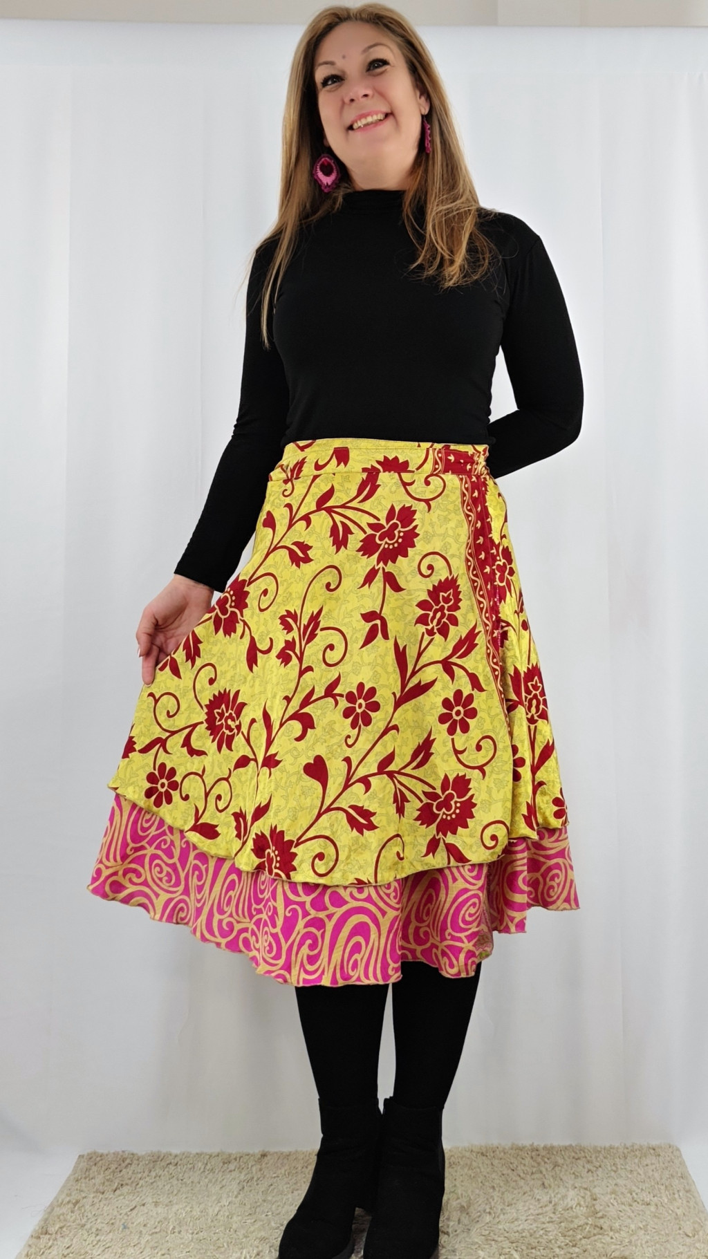 Lapszoknyáink újrahasznosított szárikból készülnek Indiában, egy hosszabb és egy rövidebb anyag derékban összevarrva! Két oldalú, kifordítható, mindkét oldala hordható, sokféleképpen köthető, variálható. Szoknyáinkból nincs két egyforma, mindegyikből csak EGY darab van, ha megtetszik, csapj le rá!