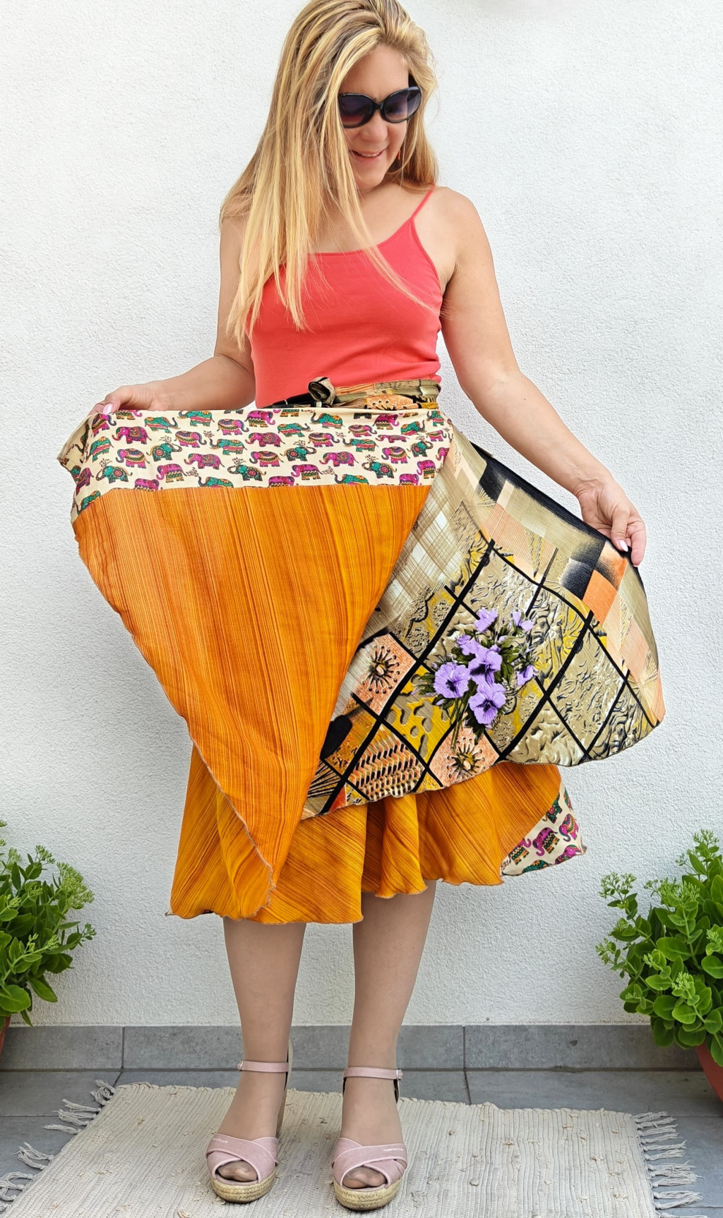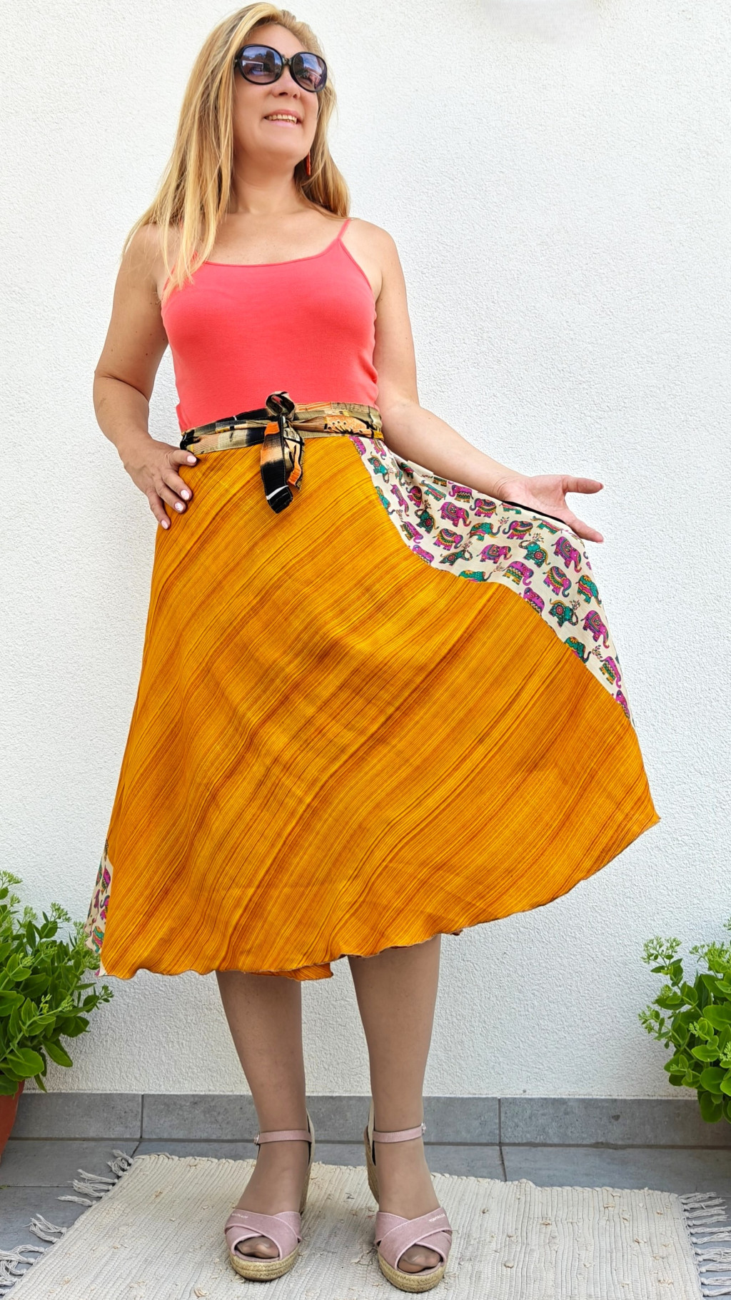 Lapszoknyáink újrahasznosított szárikból készülnek Indiában, egy hosszabb és egy rövidebb anyag derékban összevarrva! Kifordítható, mindkét oldala hordható, sokféleképpen köthető, variálható. Szoknyáinkból nincs két egyforma, mindegyikből csak EGY darab van, ha megtetszik, csapj le rá!
