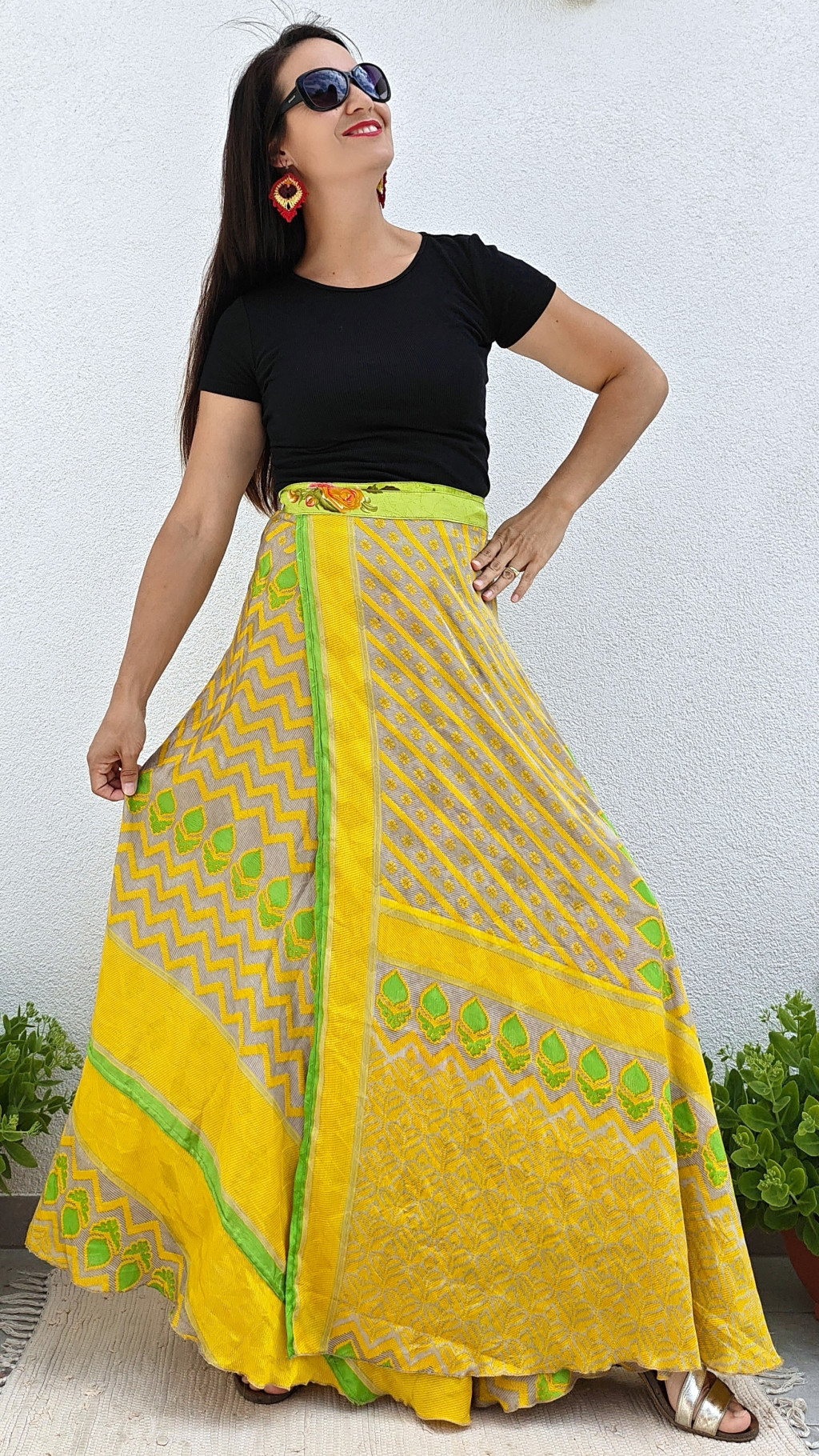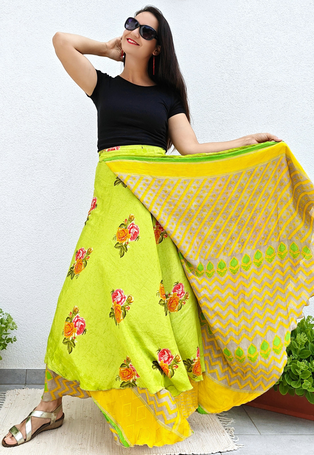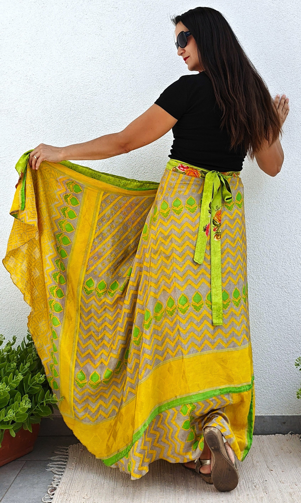 Lapszoknyáink újrahasznosított szárikból készülnek Indiában, egy hosszabb és egy rövidebb anyag derékban összevarrva! Kifordítható, mindkét oldala hordható, sokféleképpen köthető, variálható. Szoknyáinkból nincs két egyforma, mindegyikből csak EGY darab van, ha megtetszik, csapj le rá!