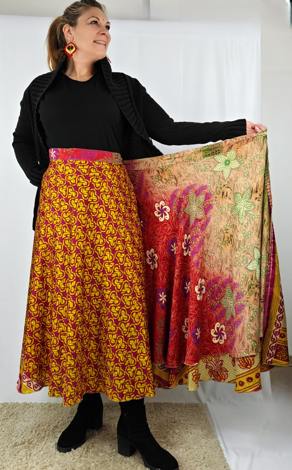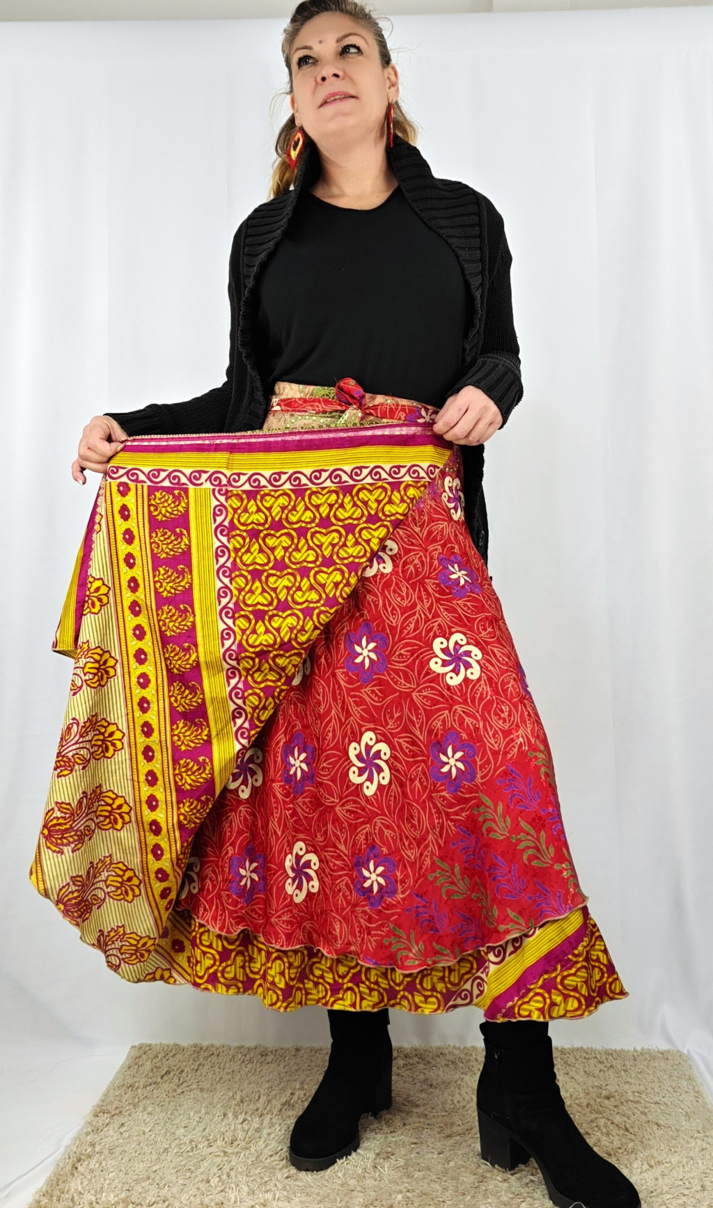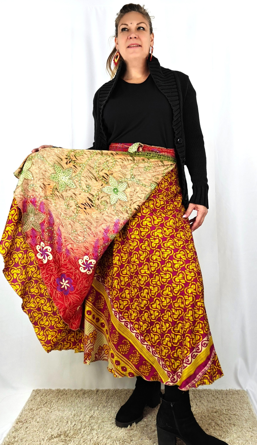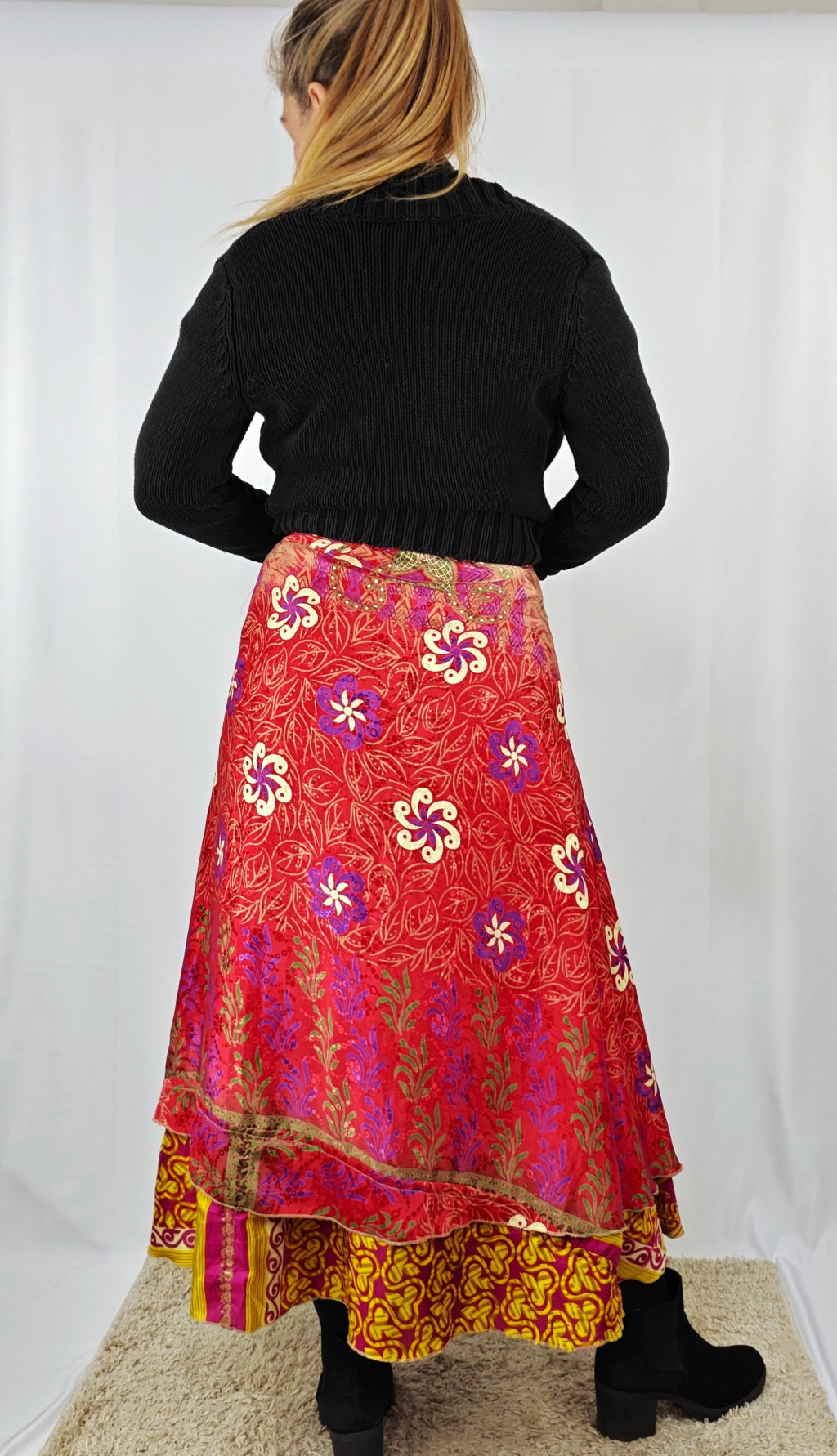 Lapszoknyáink újrahasznosított szárikból készülnek Indiában, egy hosszabb és egy rövidebb anyag derékban összevarrva! Két oldalú, kifordítható, mindkét oldala hordható, sokféleképpen köthető, variálható. Szoknyáinkból nincs két egyforma, mindegyikből csak EGY darab van, ha megtetszik, csapj le rá!