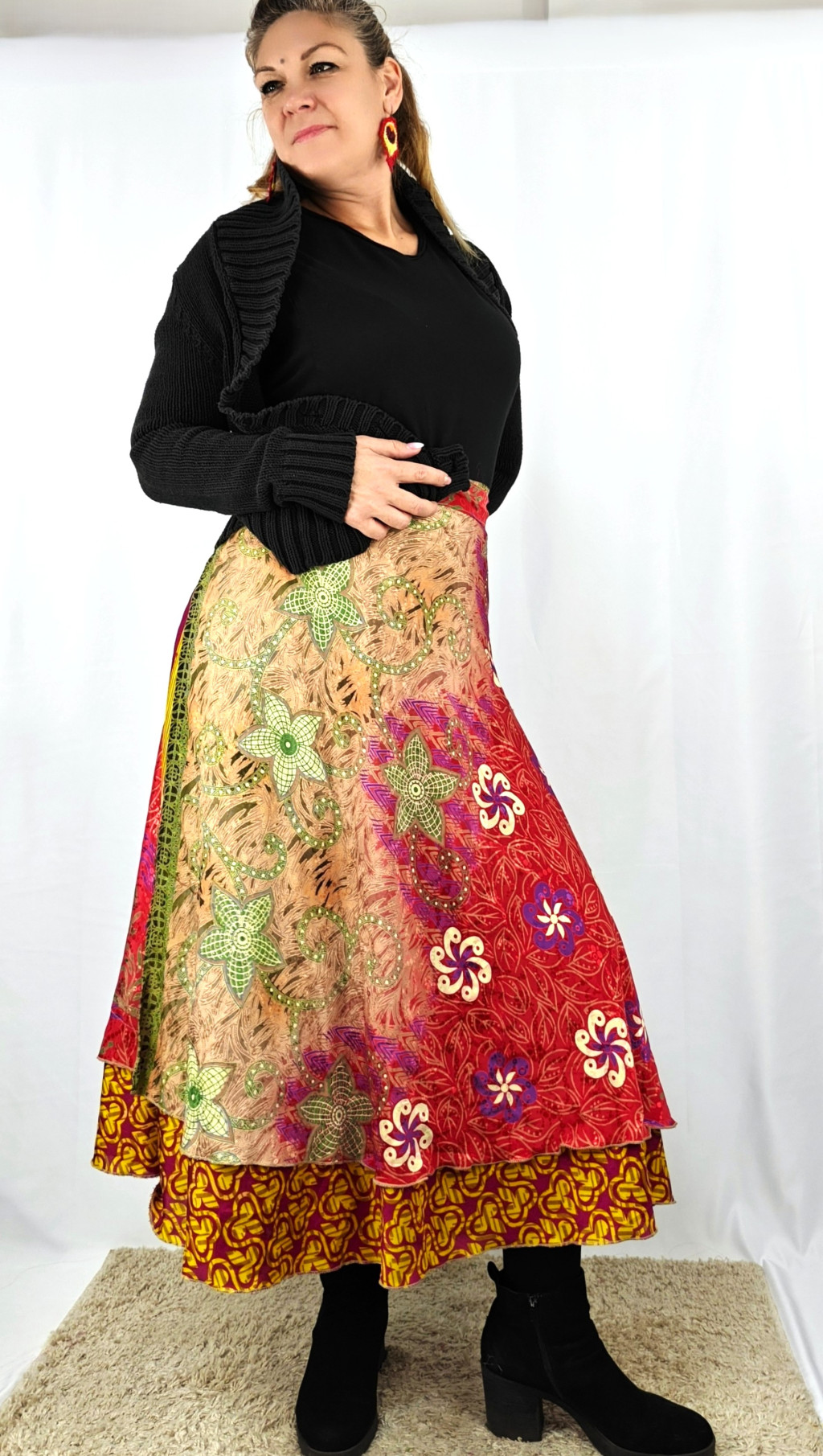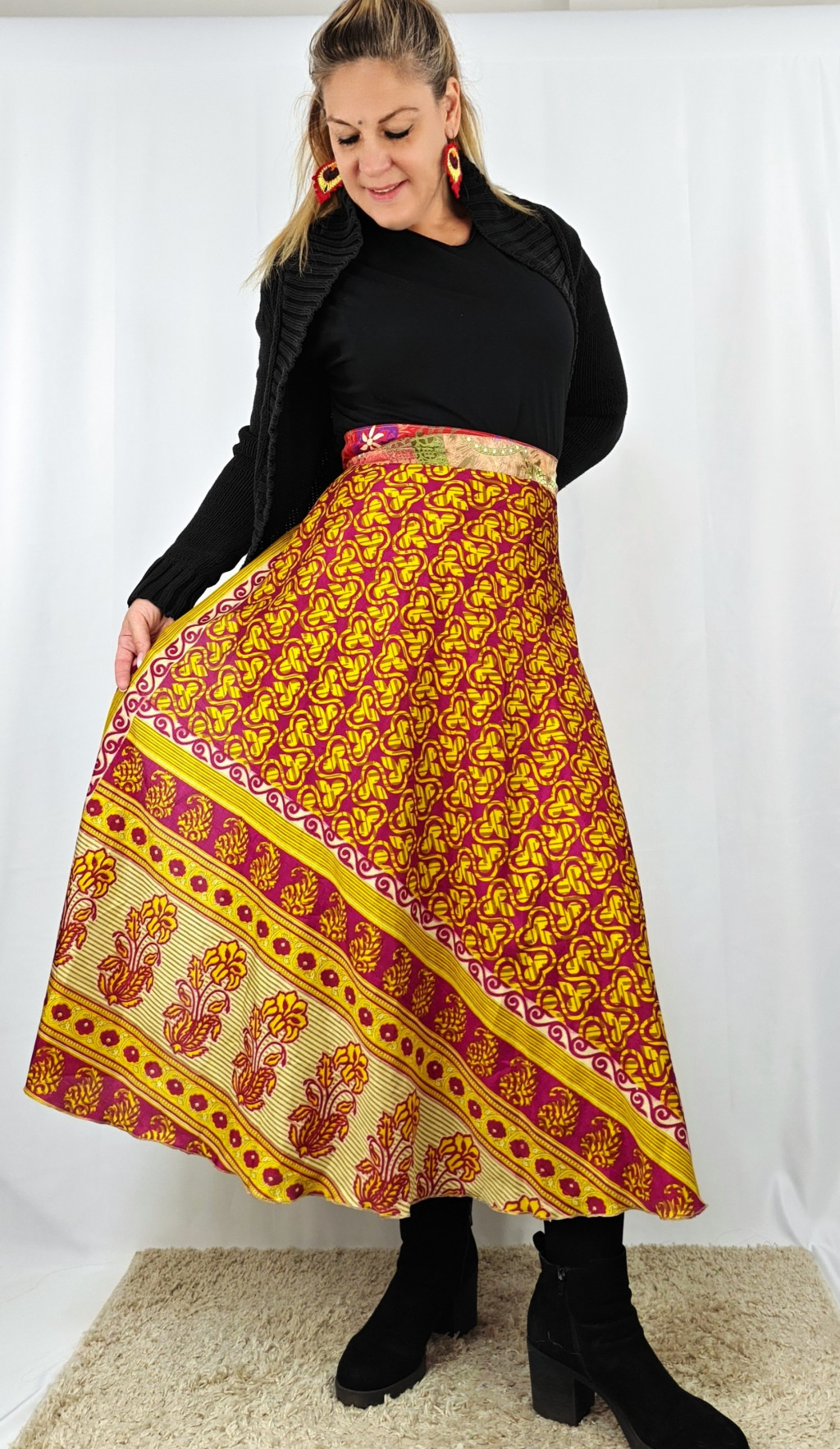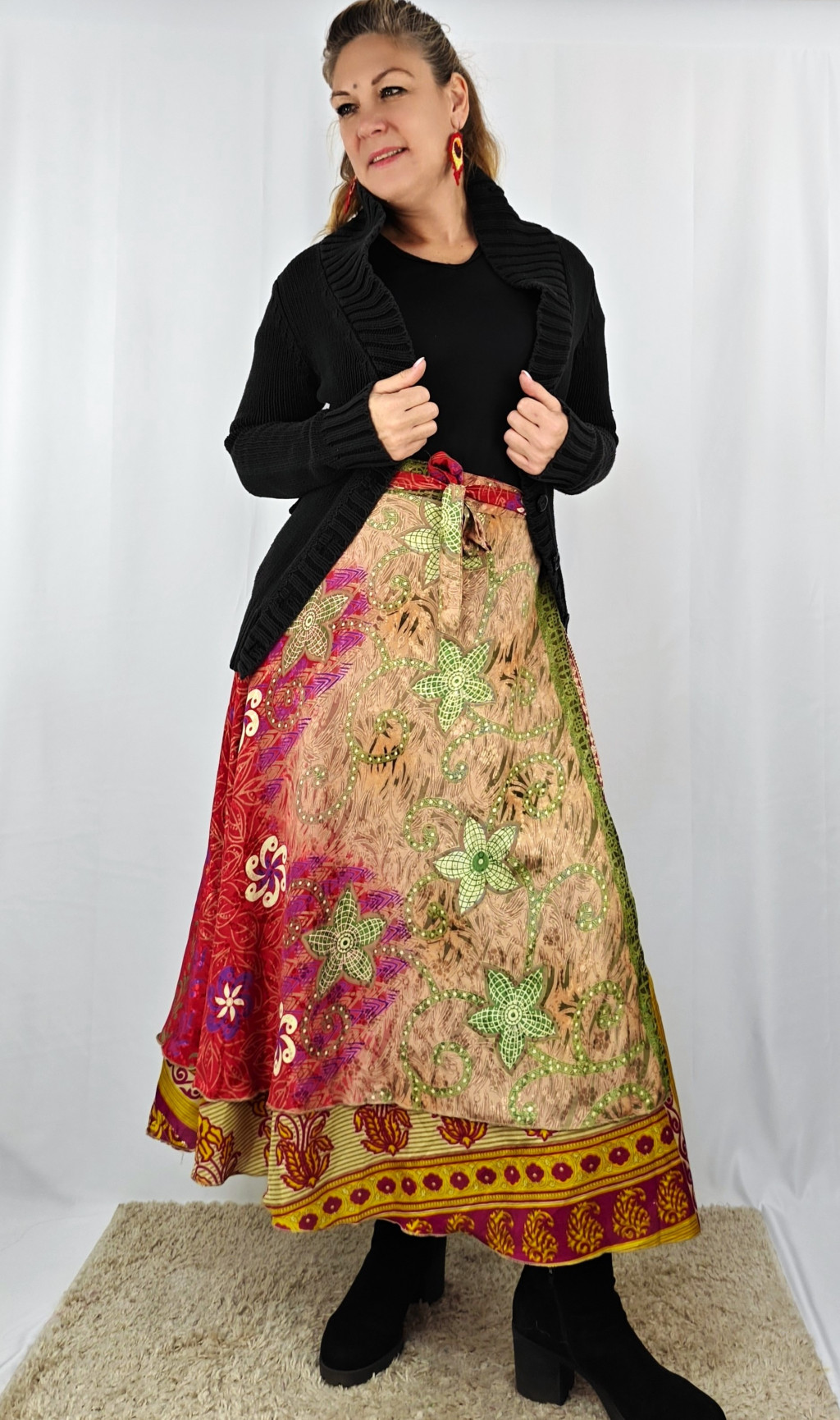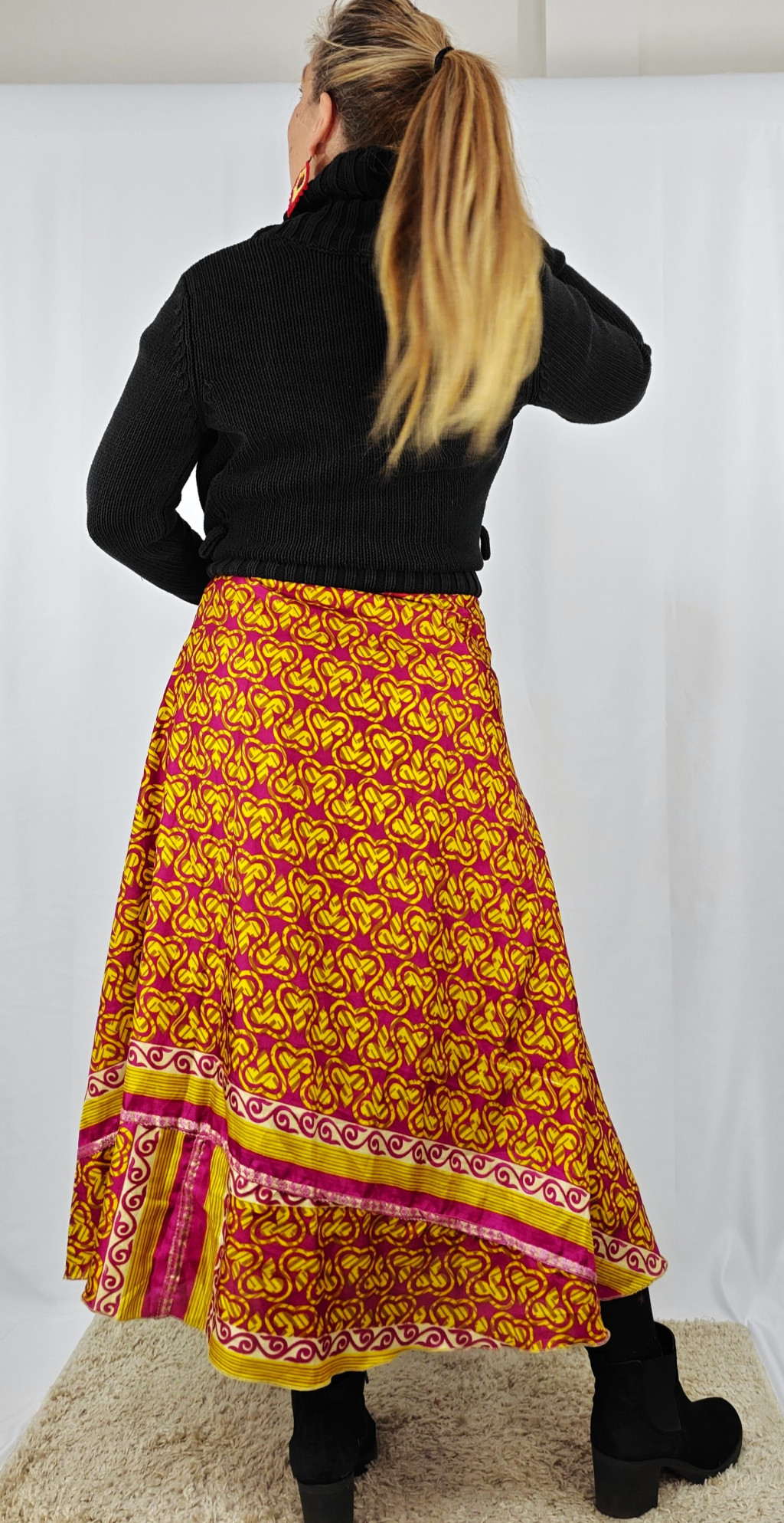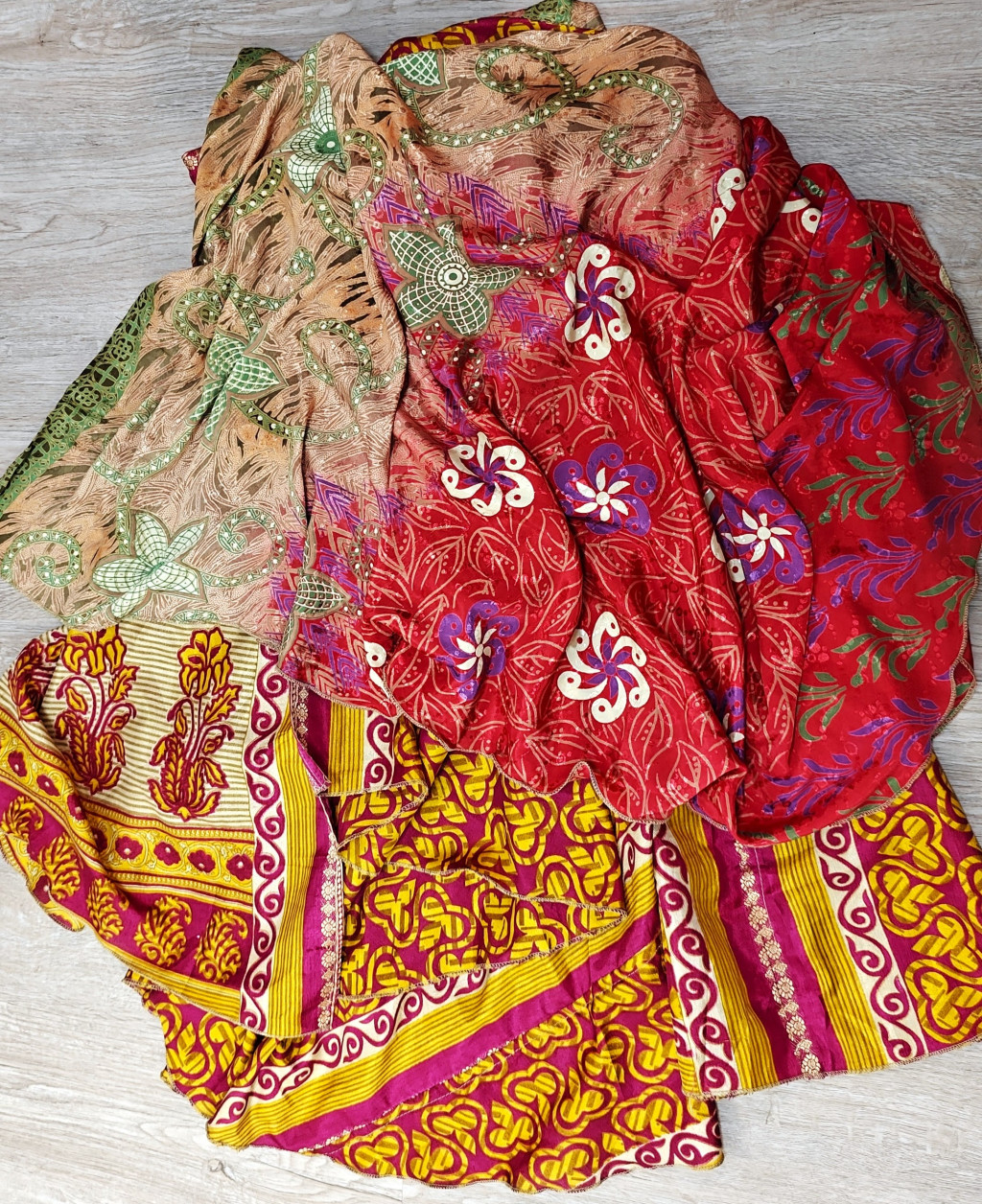 Lapszoknyáink újrahasznosított szárikból készülnek Indiában, egy hosszabb és egy rövidebb anyag derékban összevarrva! Két oldalú, kifordítható, mindkét oldala hordható, sokféleképpen köthető, variálható. Szoknyáinkból nincs két egyforma, mindegyikből csak EGY darab van, ha megtetszik, csapj le rá!
