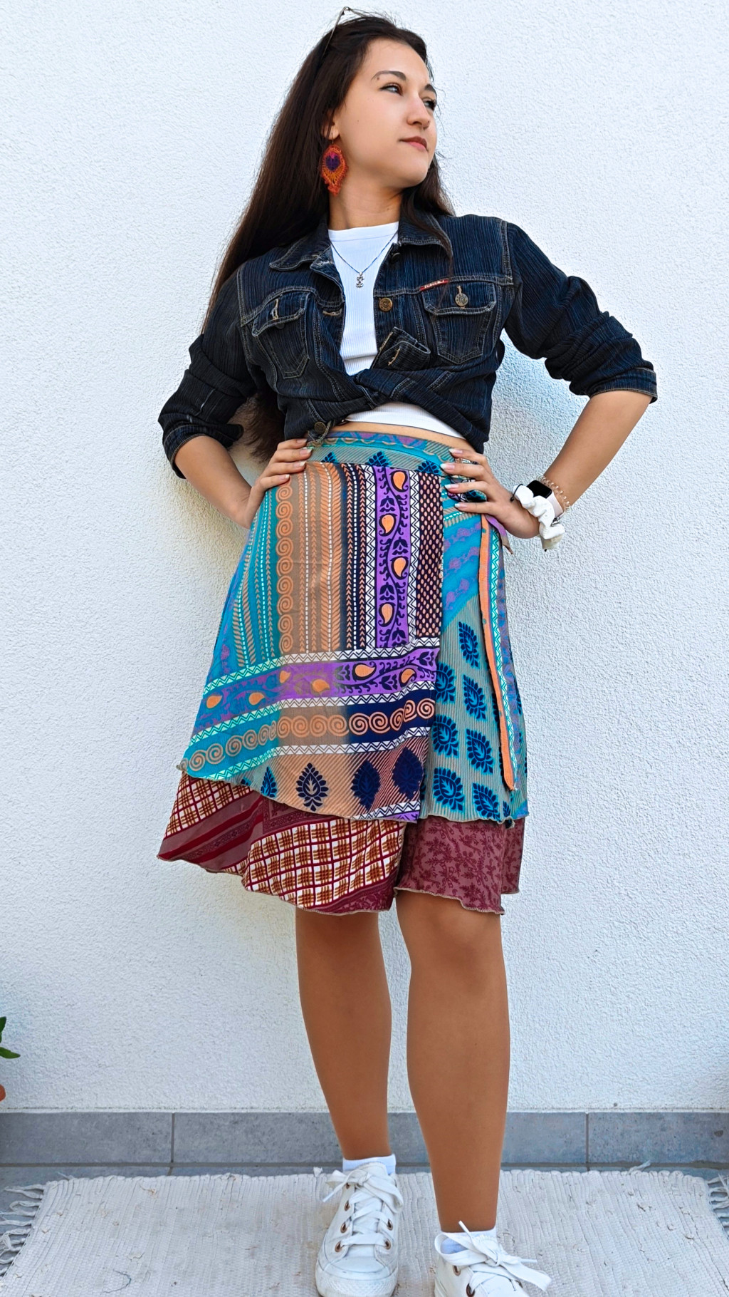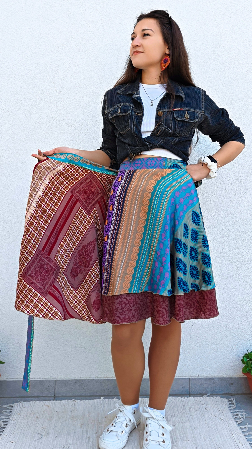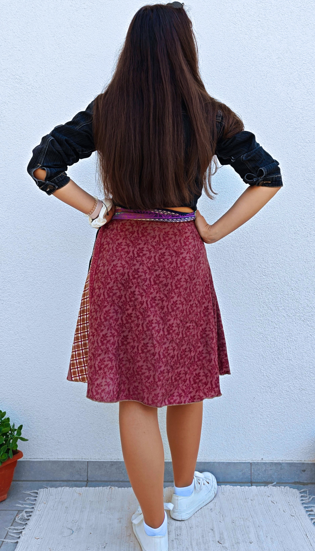 Lapszoknyáink újrahasznosított szárikból készülnek Indiában, egy hosszabb és egy rövidebb anyag derékban összevarrva! Két oldalú, kifordítható, mindkét oldala hordható, sokféleképpen köthető, variálható. Szoknyáinkból nincs két egyforma, mindegyikből csak EGY darab van, ha megtetszik, csapj le rá!