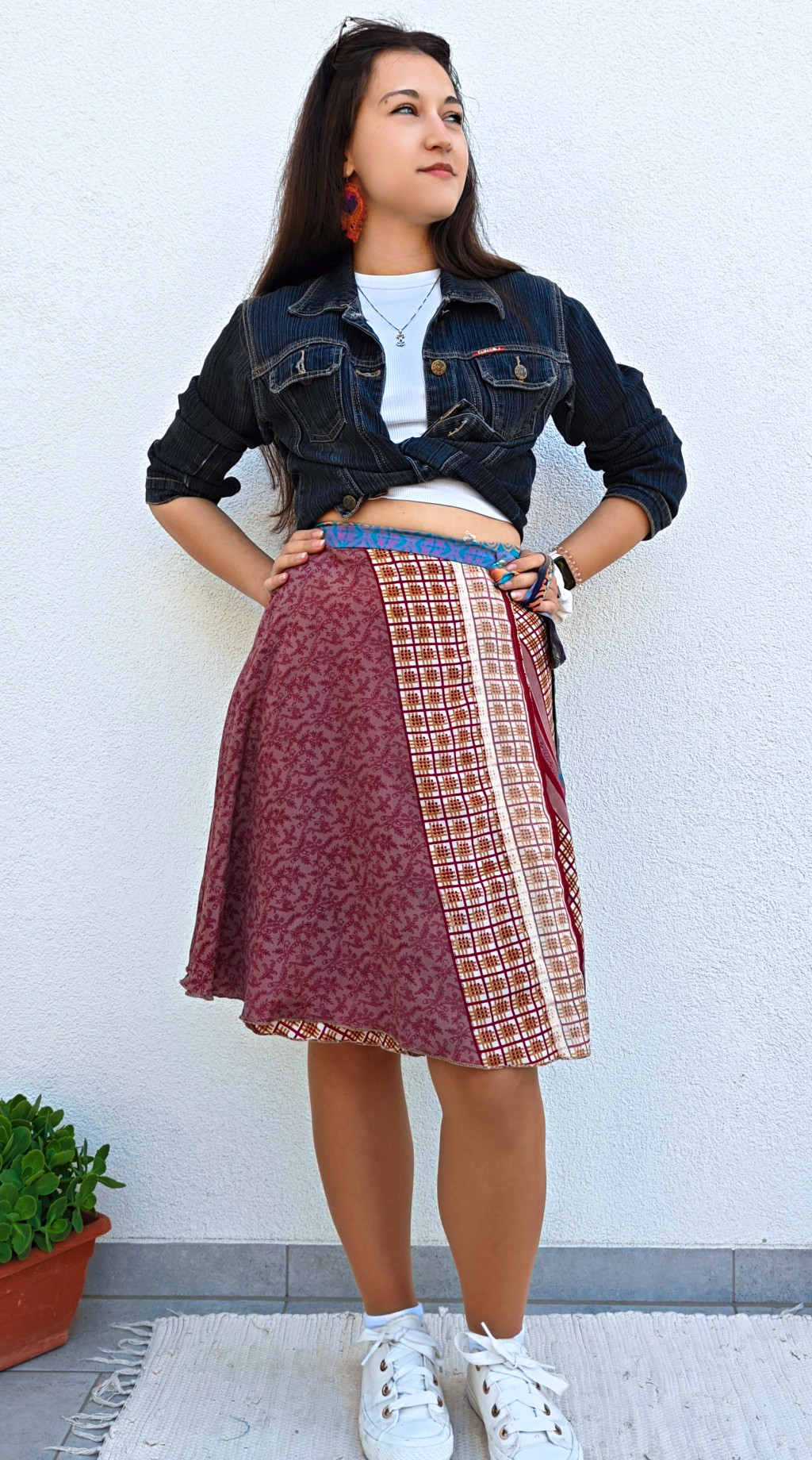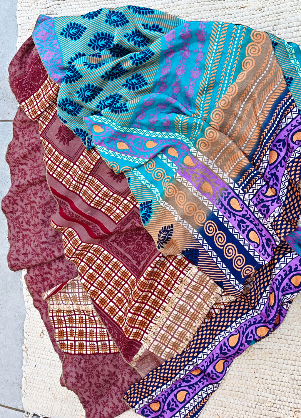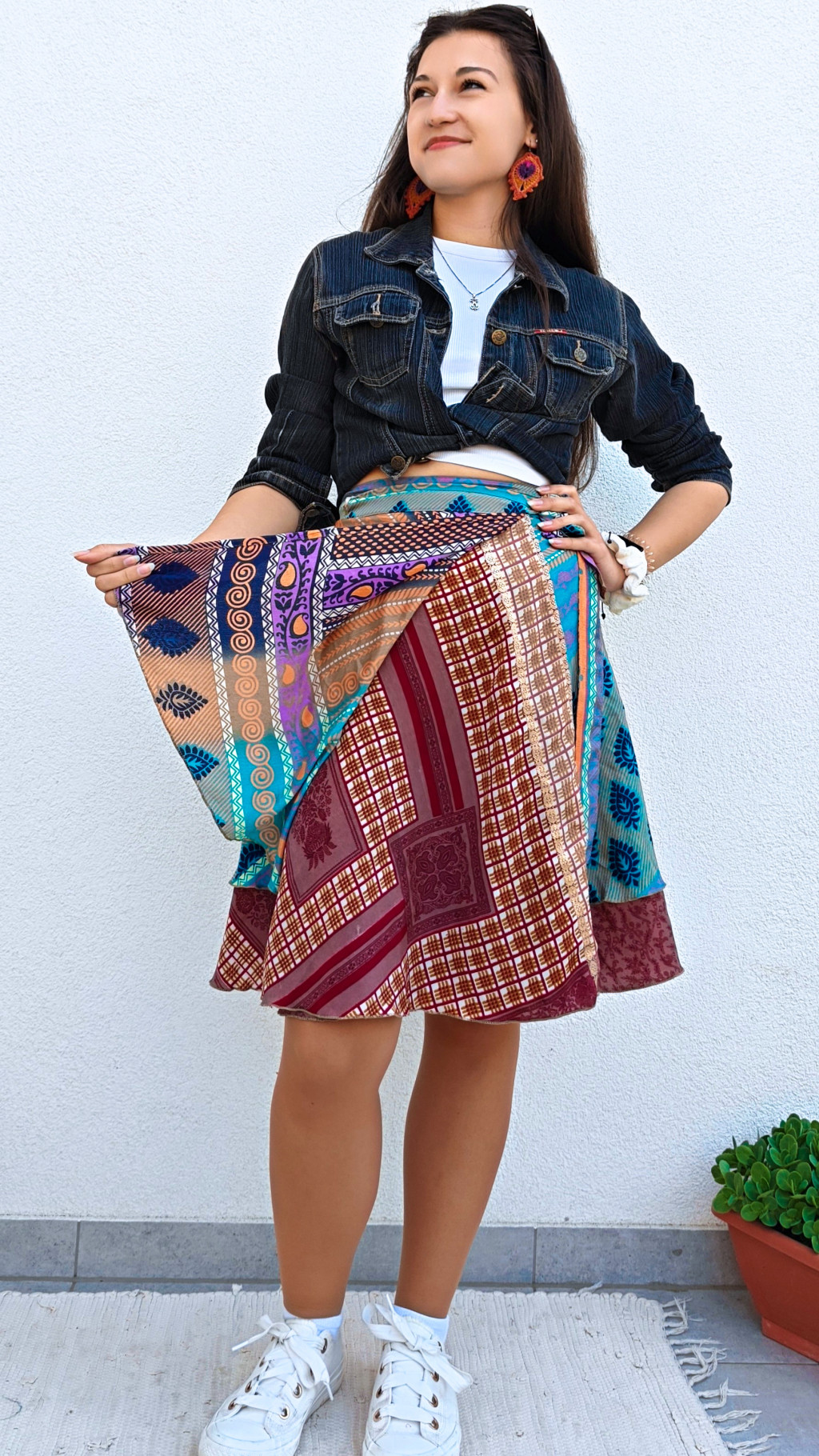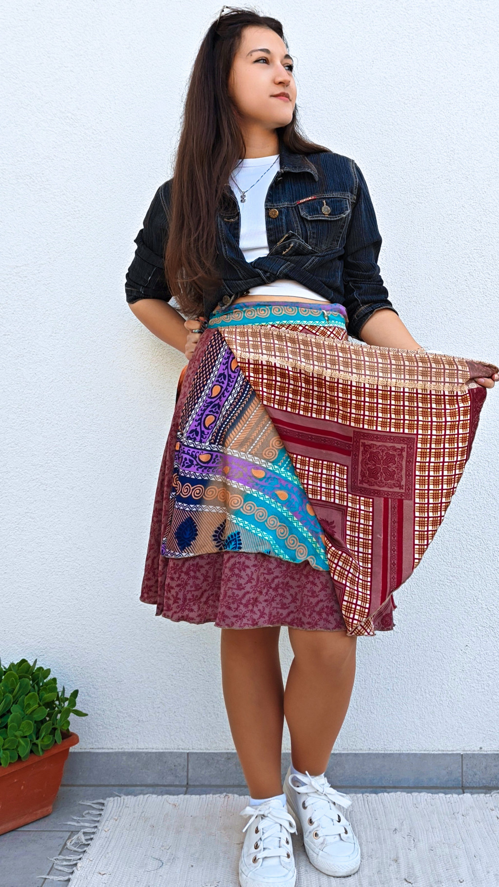 Lapszoknyáink újrahasznosított szárikból készülnek Indiában, egy hosszabb és egy rövidebb anyag derékban összevarrva! Két oldalú, kifordítható, mindkét oldala hordható, sokféleképpen köthető, variálható. Szoknyáinkból nincs két egyforma, mindegyikből csak EGY darab van, ha megtetszik, csapj le rá!