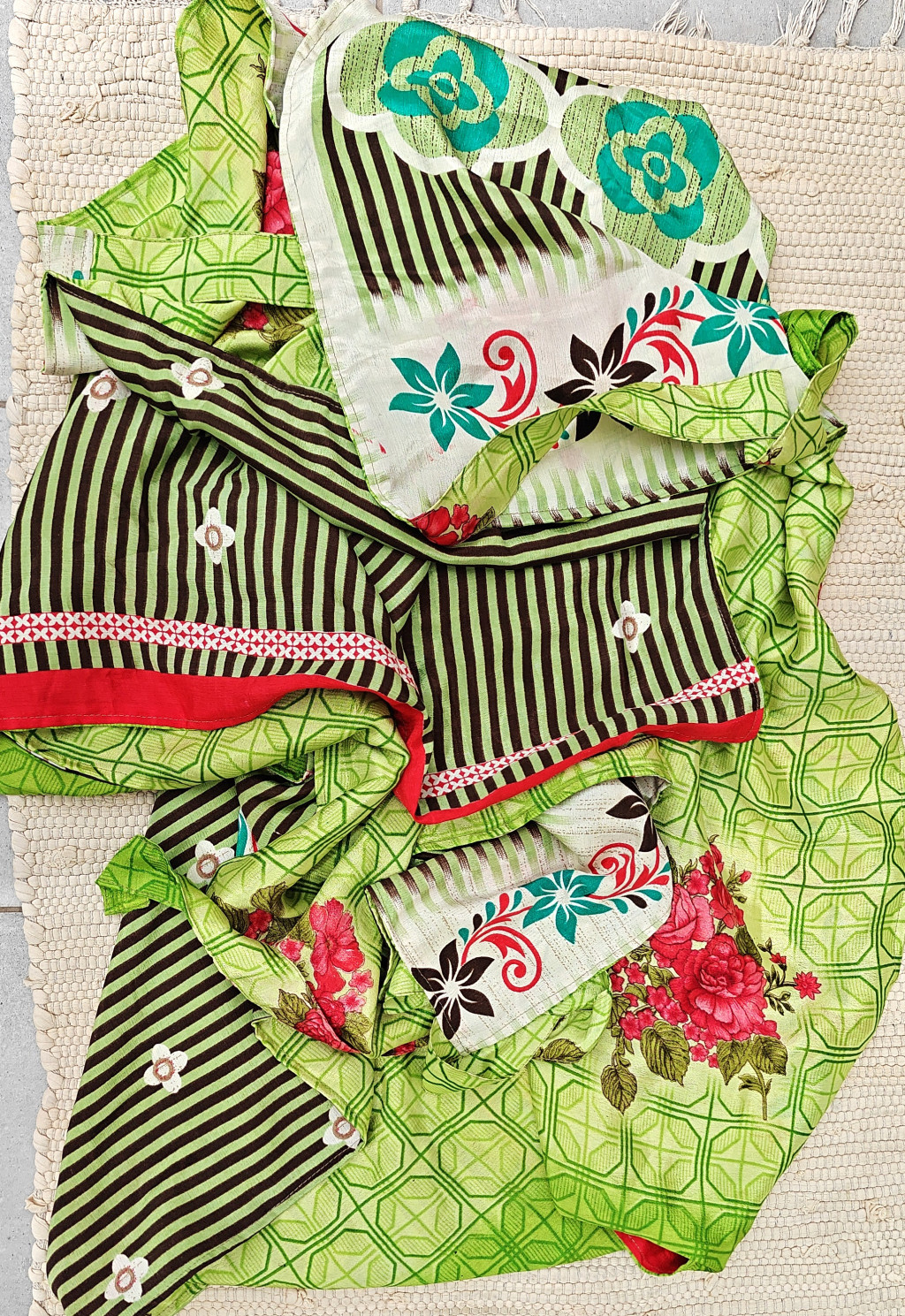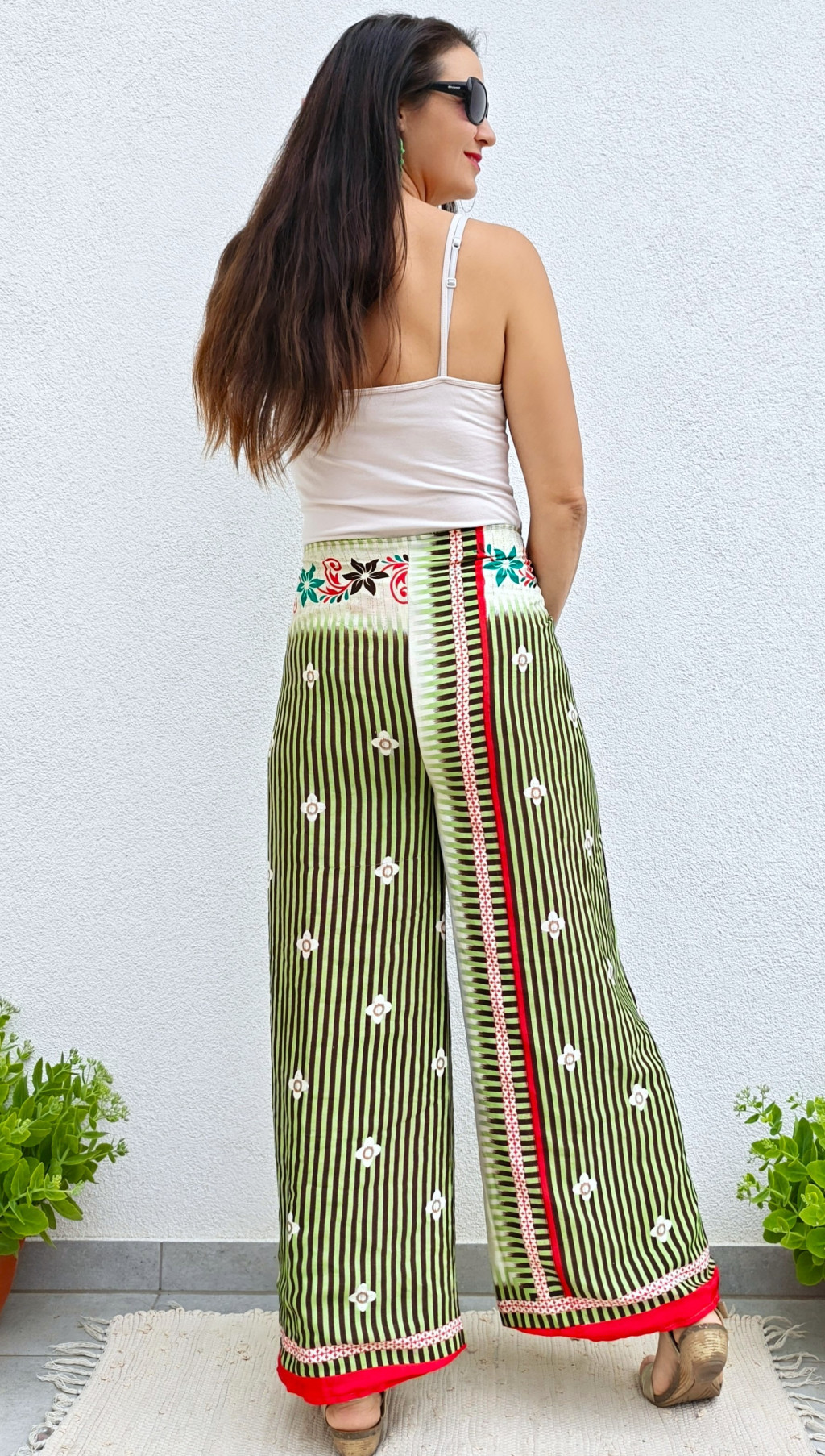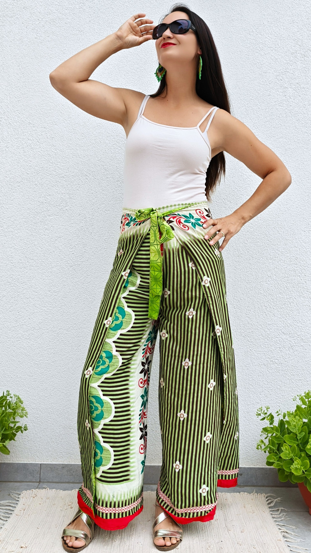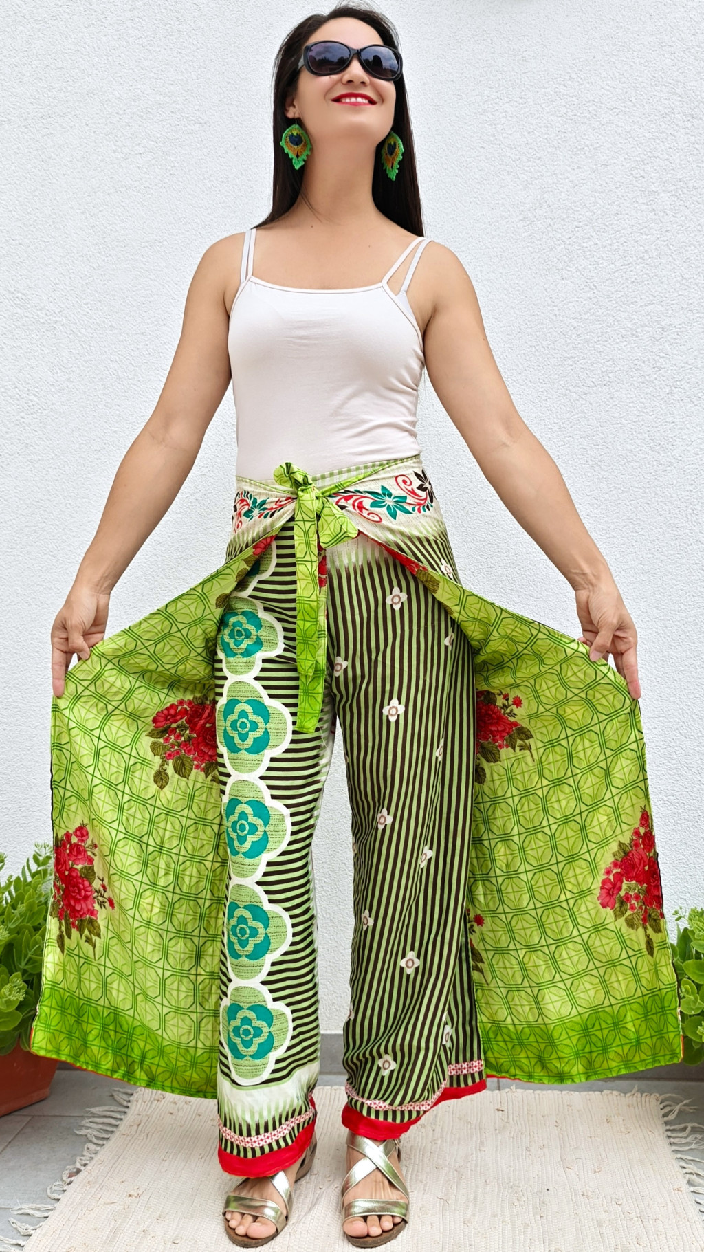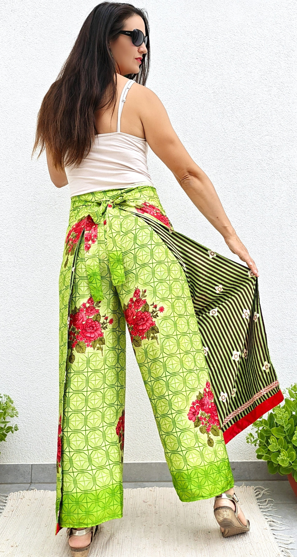 Lapnadrágjaink újrahasznosított szárikból készülnek Indiában. Két különböző csodás anyagot varrnak össze, így a külső és belső fele is hordható!