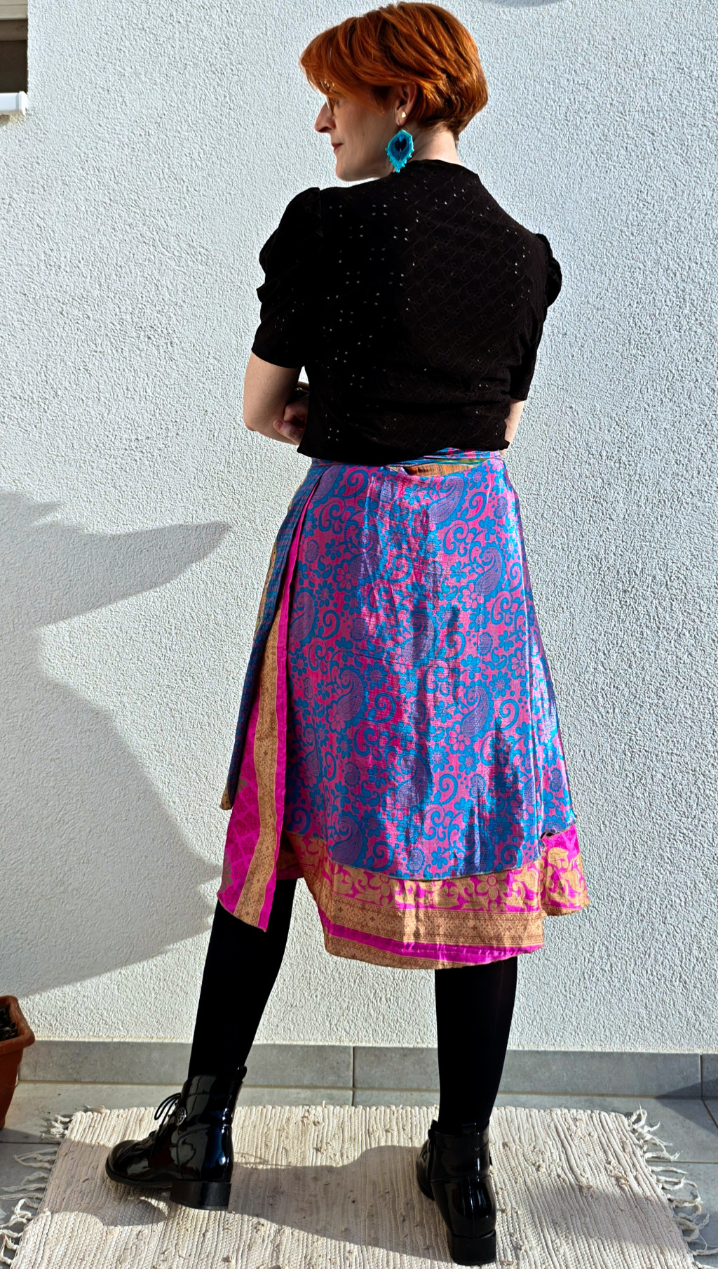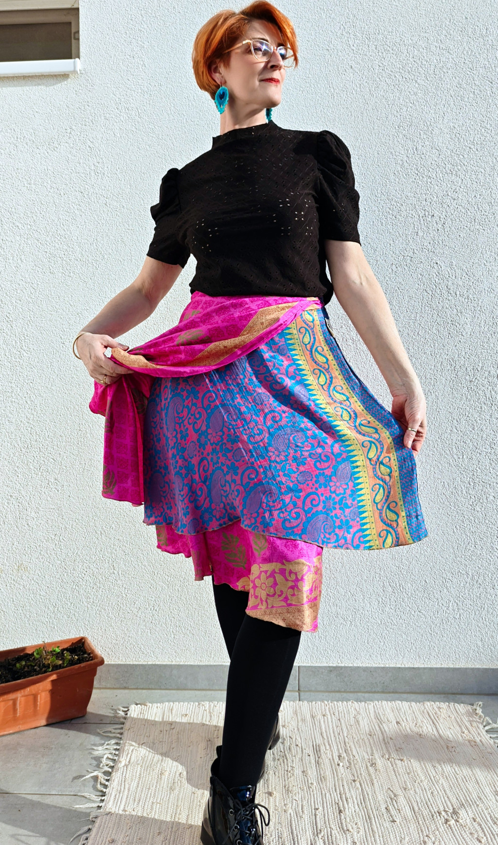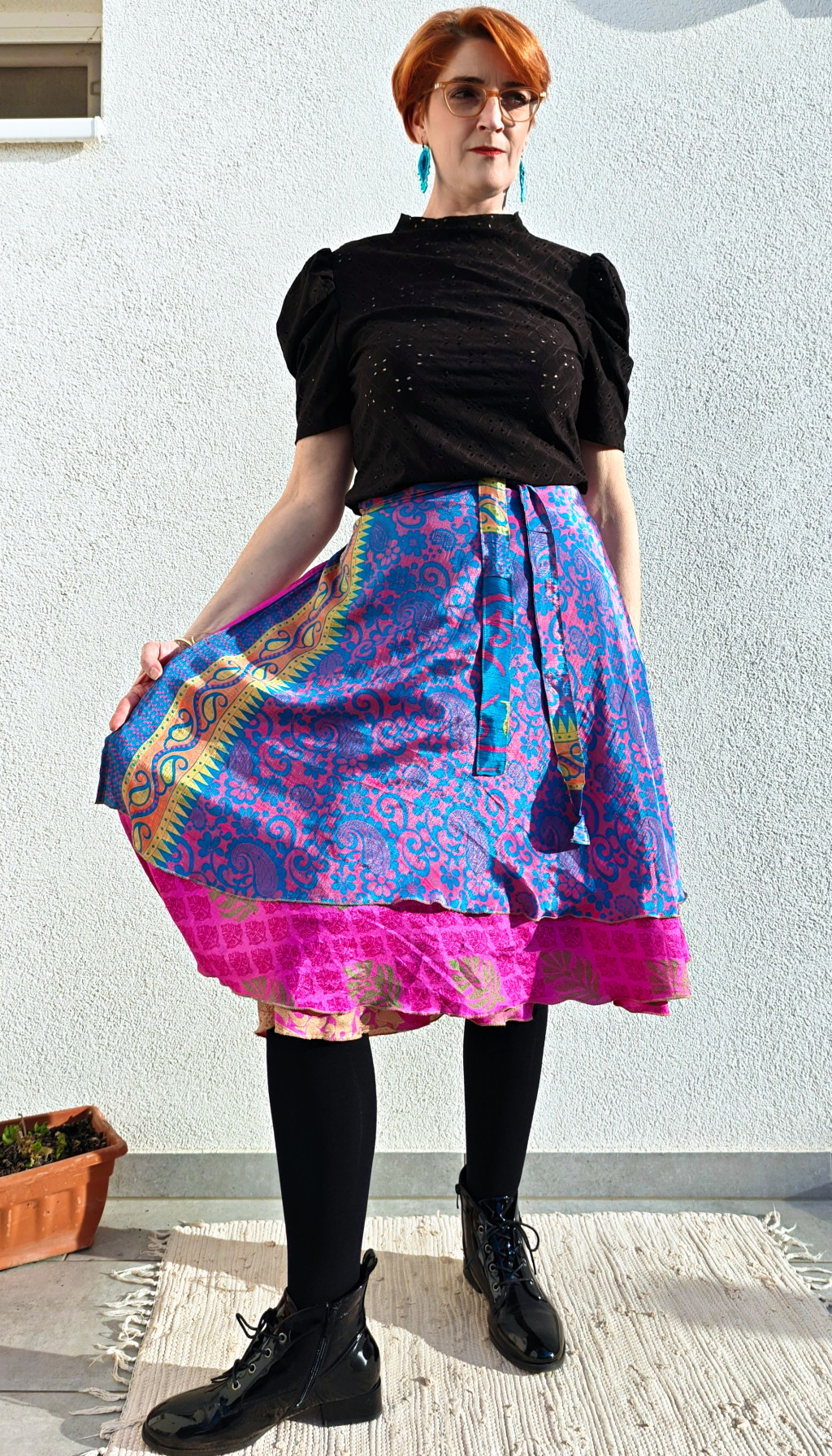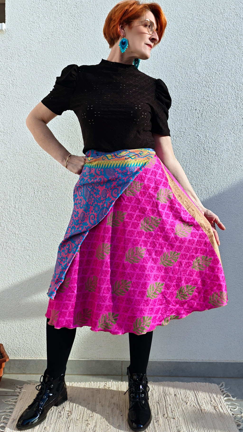 Lapszoknyáink újrahasznosított szárikból készülnek Indiában, egy hosszabb és egy rövidebb anyag derékban összevarrva! Két oldalú, kifordítható, mindkét oldala hordható, sokféleképpen köthető, variálható. Szoknyáinkból nincs két egyforma, mindegyikből csak EGY darab van, ha megtetszik, csapj le rá!