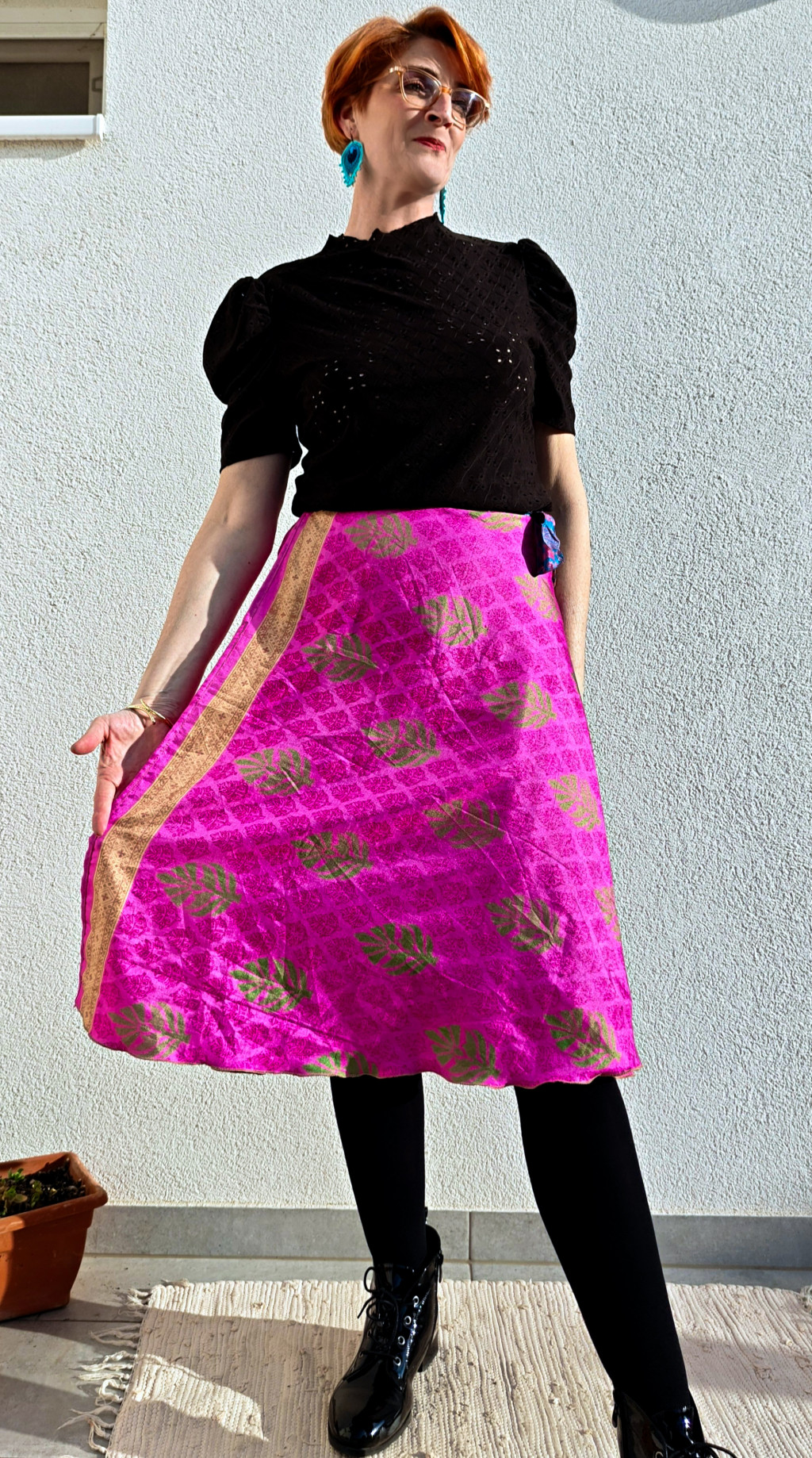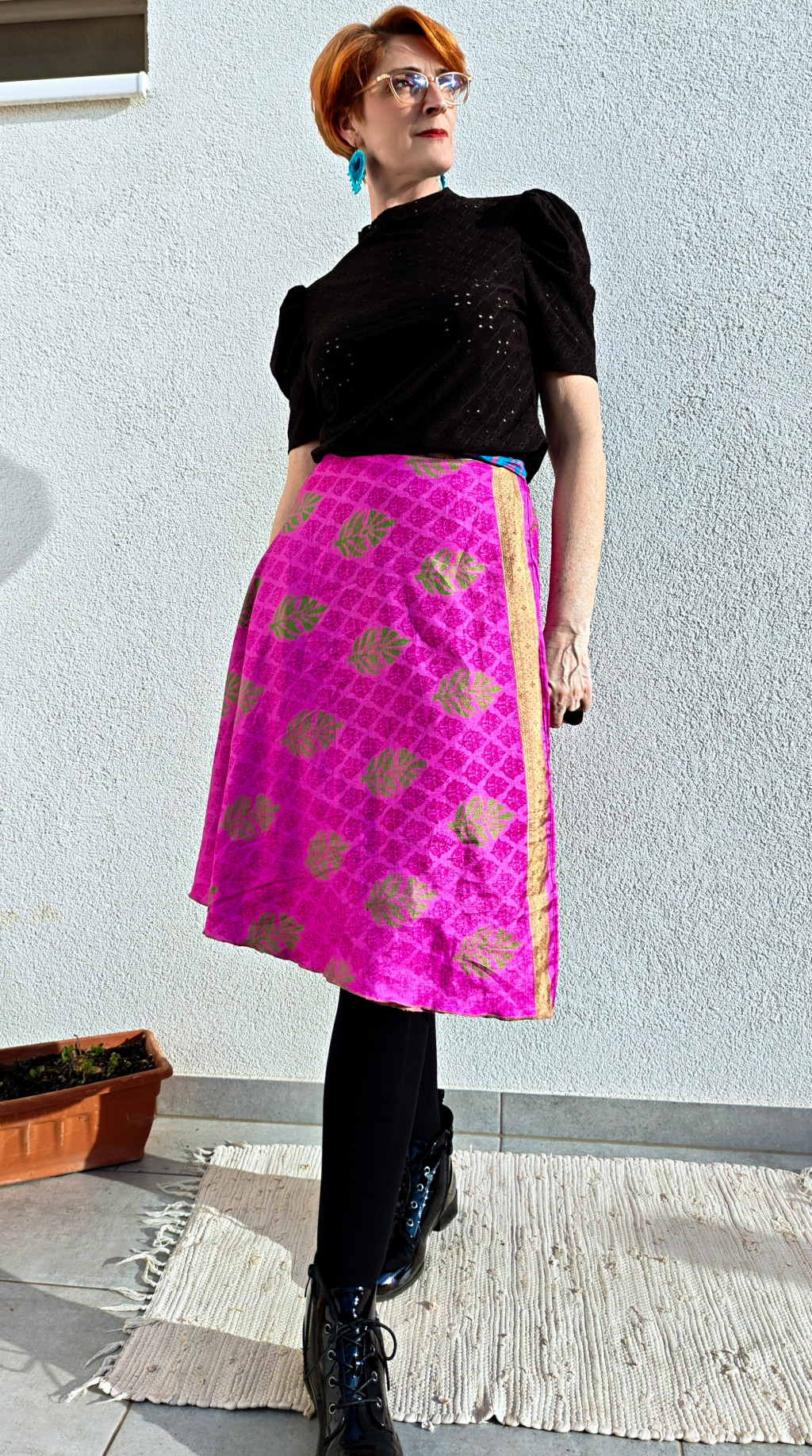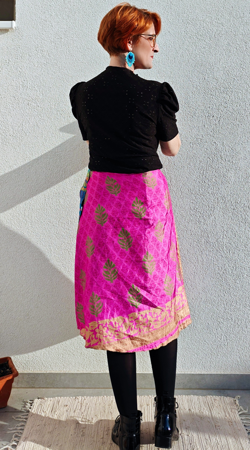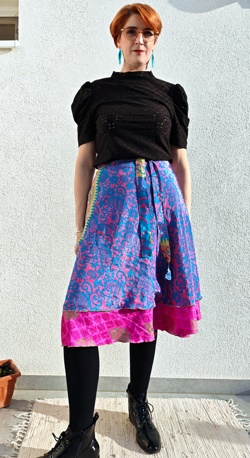 Lapszoknyáink újrahasznosított szárikból készülnek Indiában, egy hosszabb és egy rövidebb anyag derékban összevarrva! Két oldalú, kifordítható, mindkét oldala hordható, sokféleképpen köthető, variálható. Szoknyáinkból nincs két egyforma, mindegyikből csak EGY darab van, ha megtetszik, csapj le rá!
