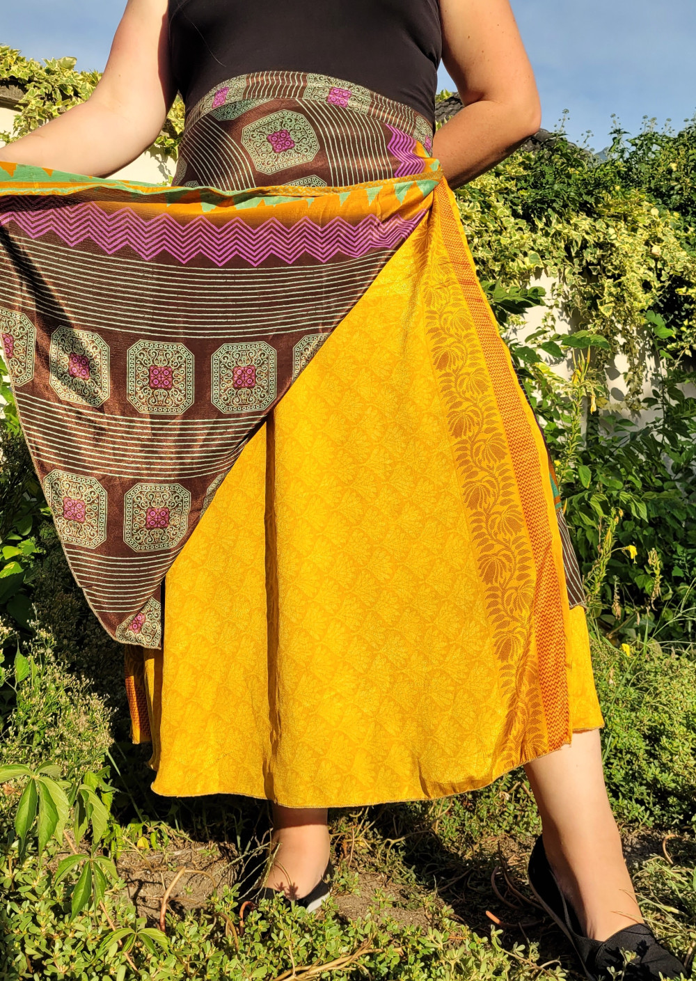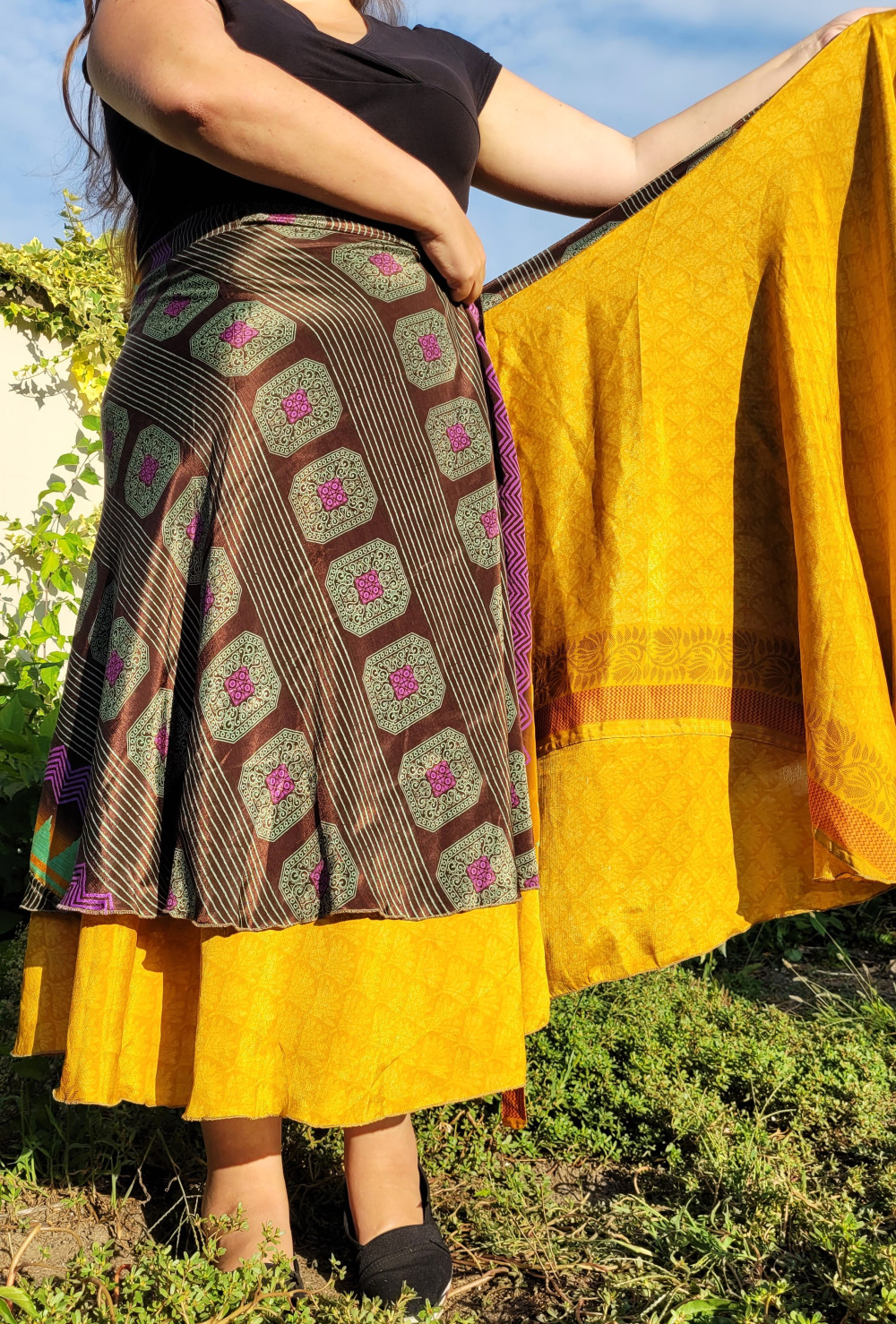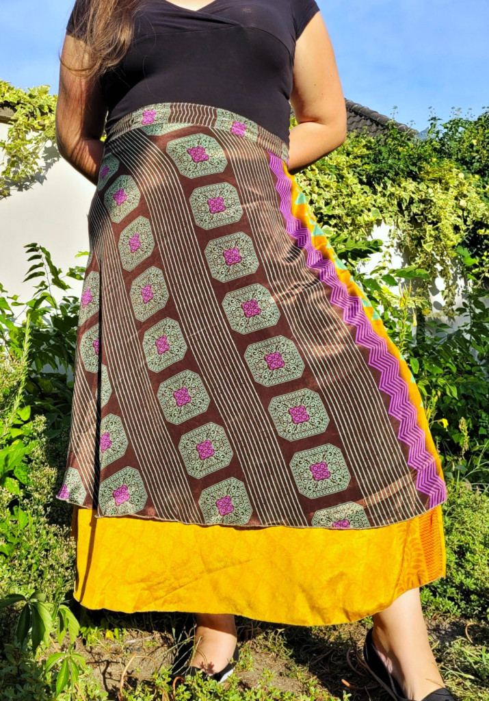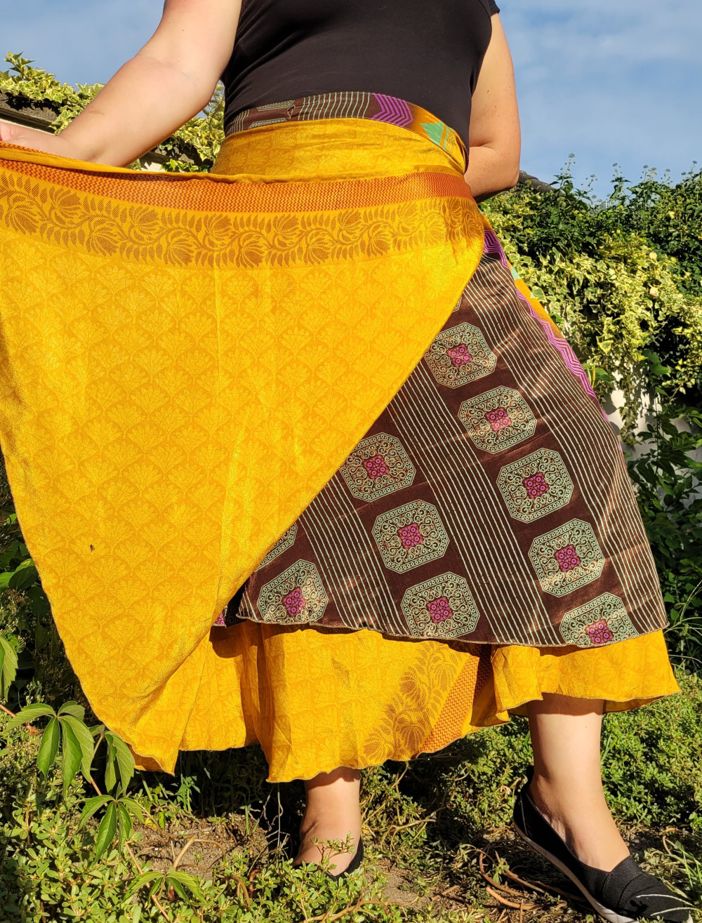 Lapszoknyáink újrahasznosított szárikból készülnek Indiában, egy hosszabb és egy rövidebb anyag derékban összevarrva! Kifordítható, mindkét oldala hordható, sokféleképpen köthető, variálható. Szoknyáinkból nincs két egyforma, mindegyikből csak EGY darab van, ha megtetszik, csapj le rá!