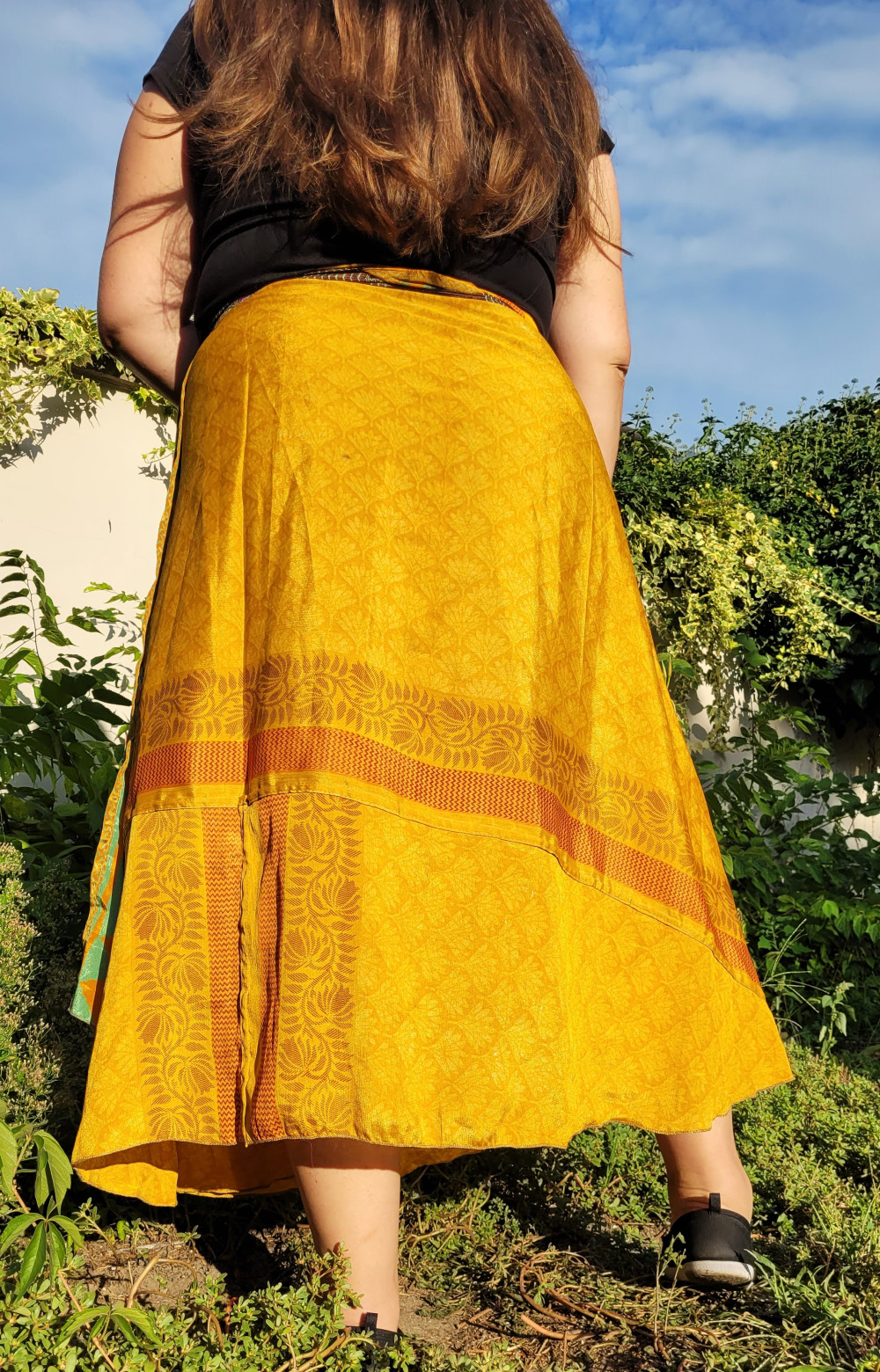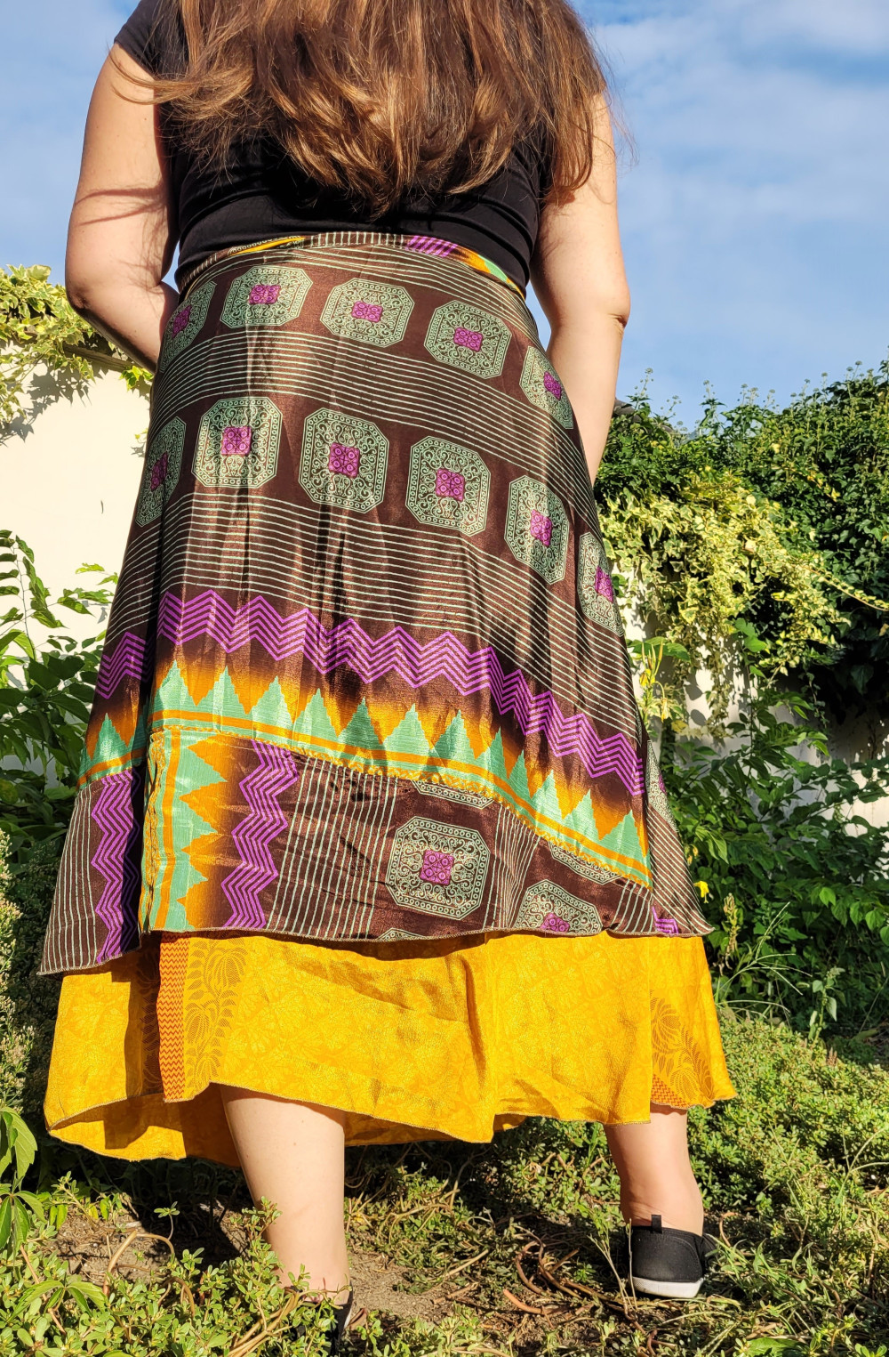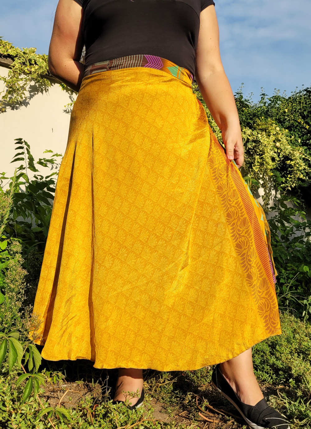Lapszoknyáink újrahasznosított szárikból készülnek Indiában, egy hosszabb és egy rövidebb anyag derékban összevarrva! Kifordítható, mindkét oldala hordható, sokféleképpen köthető, variálható. Szoknyáinkból nincs két egyforma, mindegyikből csak EGY darab van, ha megtetszik, csapj le rá!