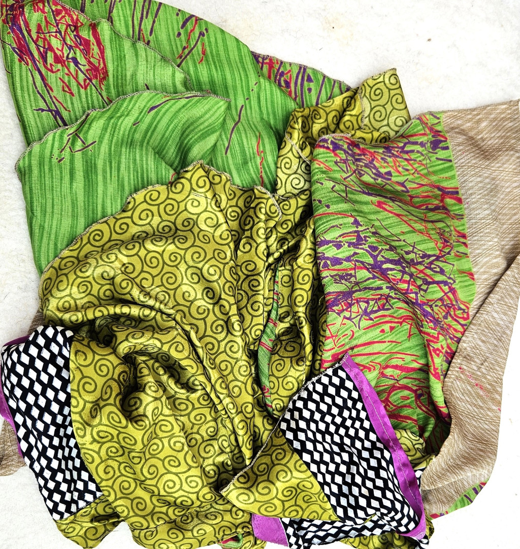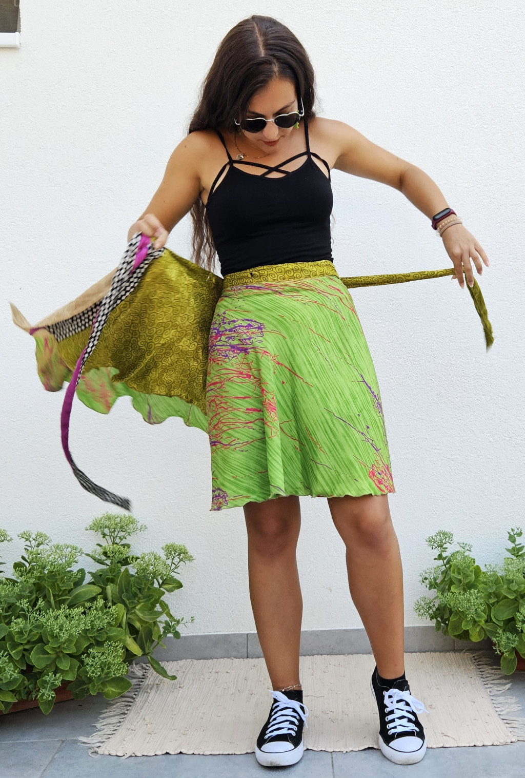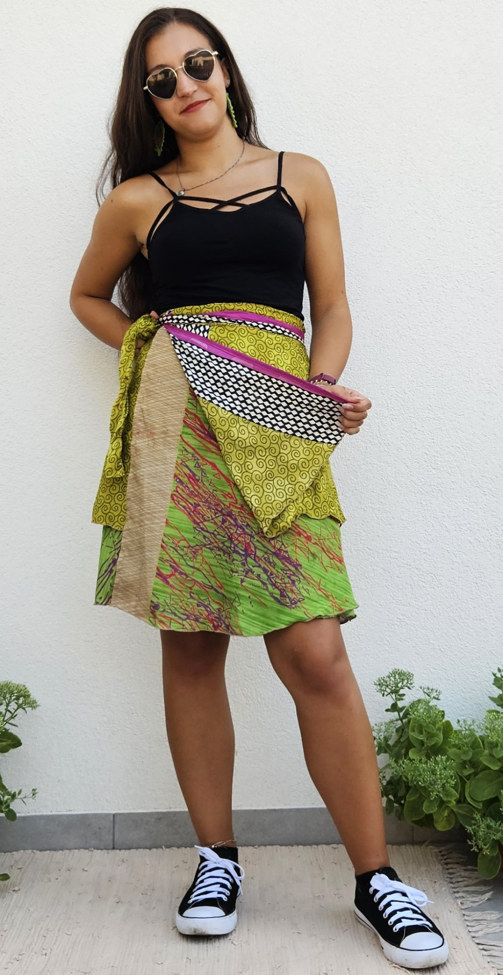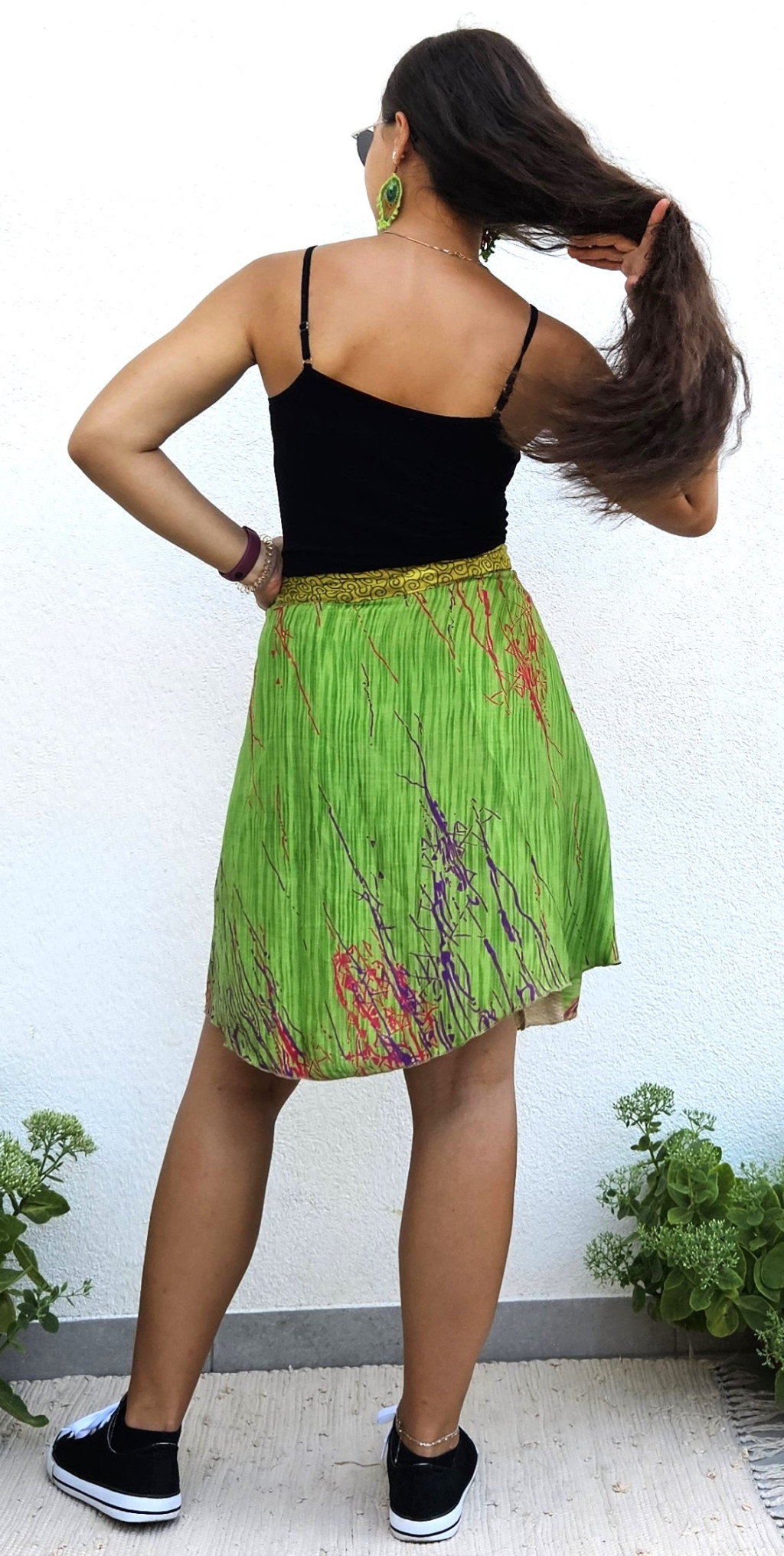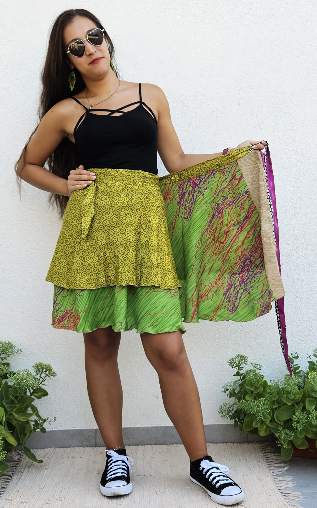 Lapszoknyáink újrahasznosított szárikból készülnek Indiában, egy hosszabb és egy rövidebb anyag derékban összevarrva! Kifordítható, mindkét oldala hordható, sokféleképpen köthető, variálható. Szoknyáinkból nincs két egyforma, mindegyikből csak EGY darab van, ha megtetszik, csapj le rá!