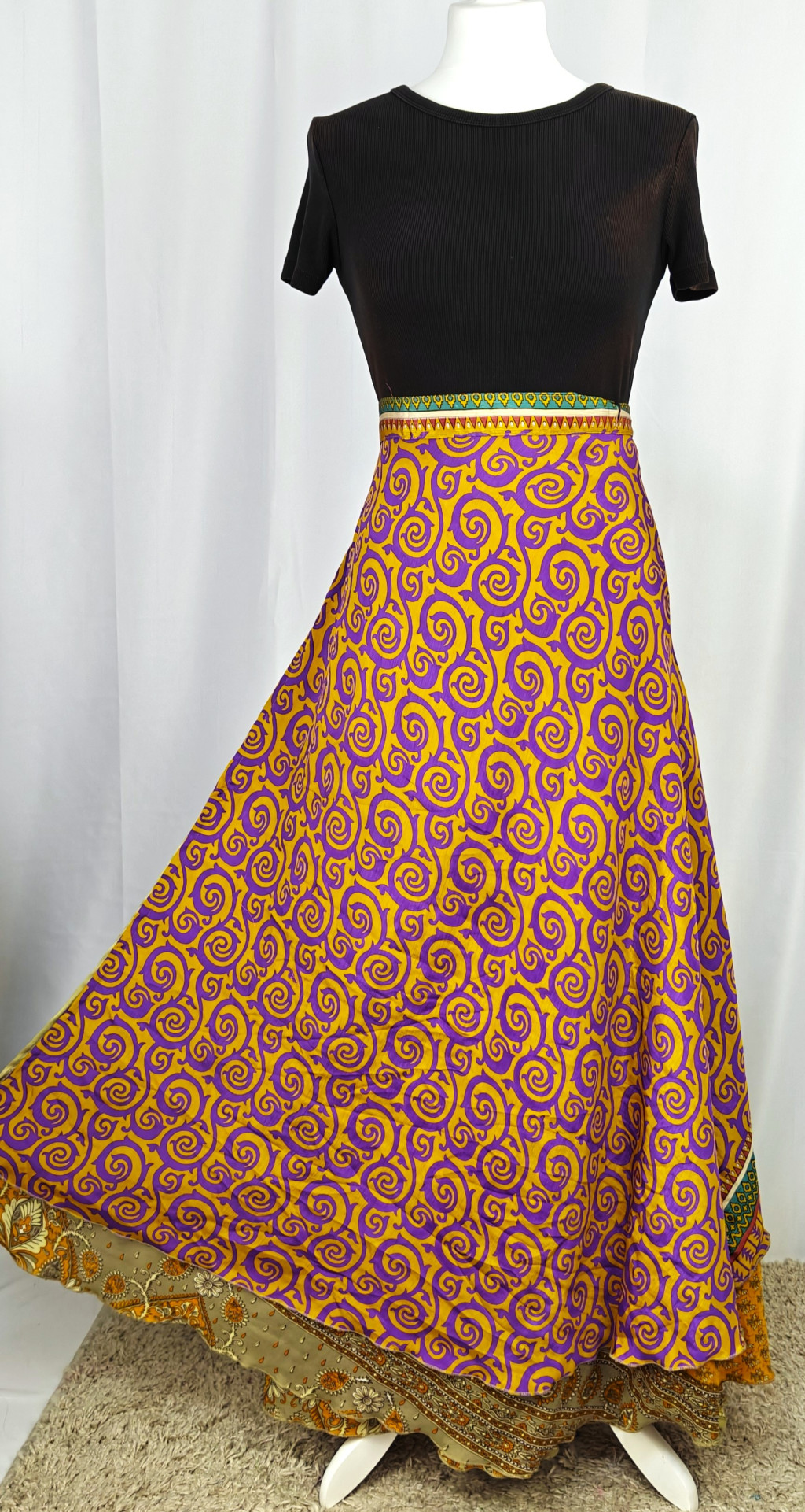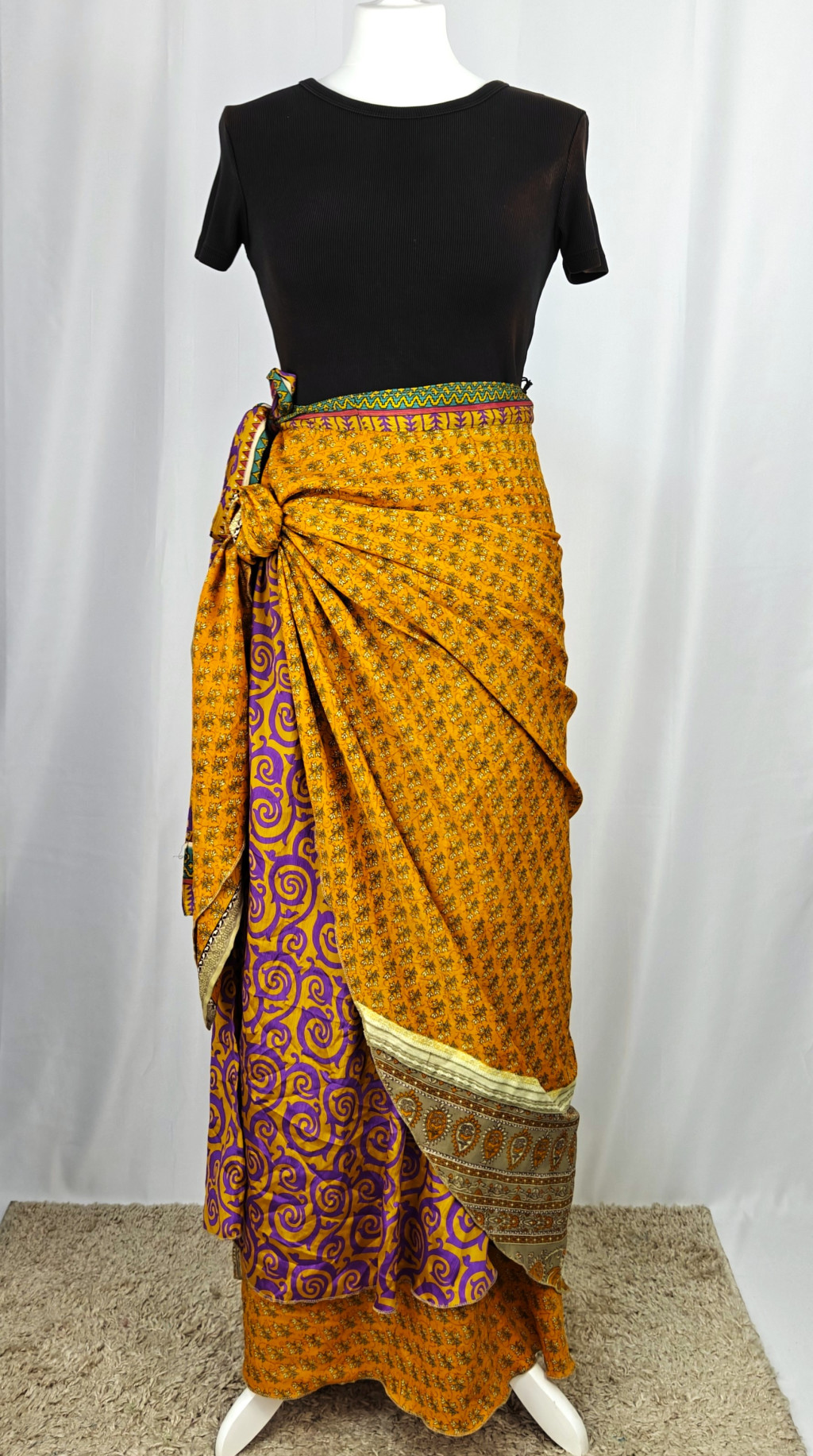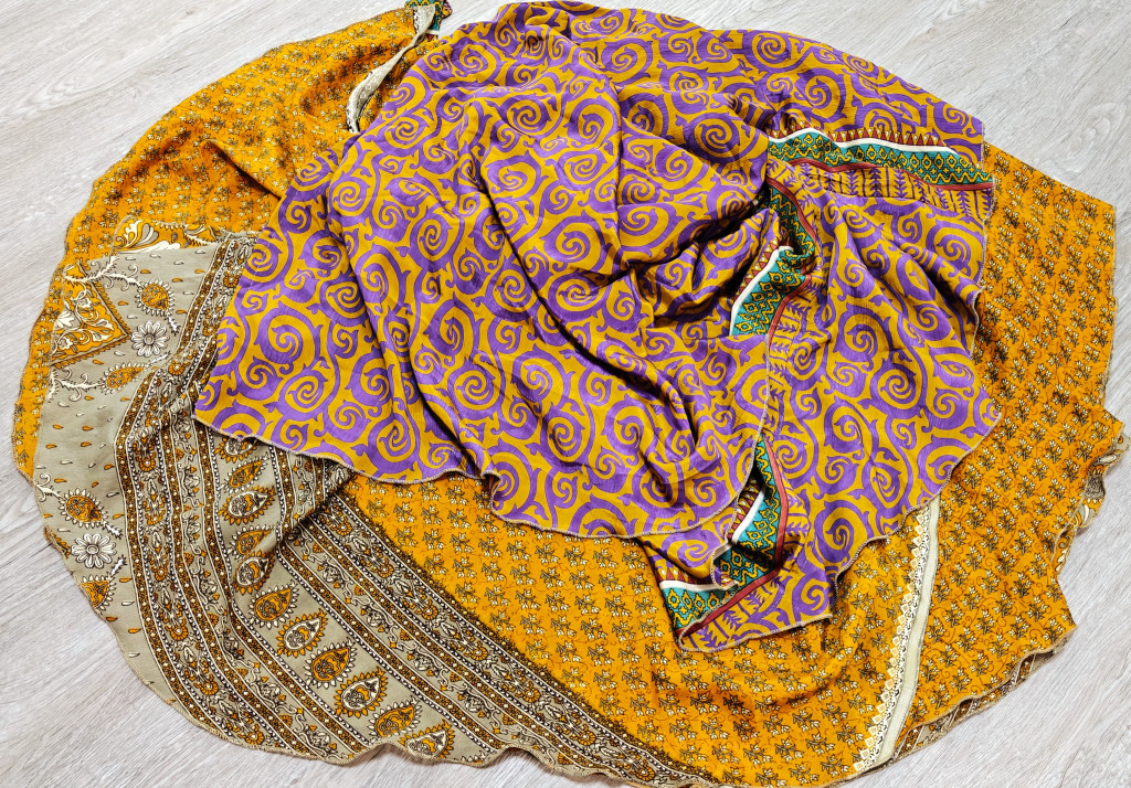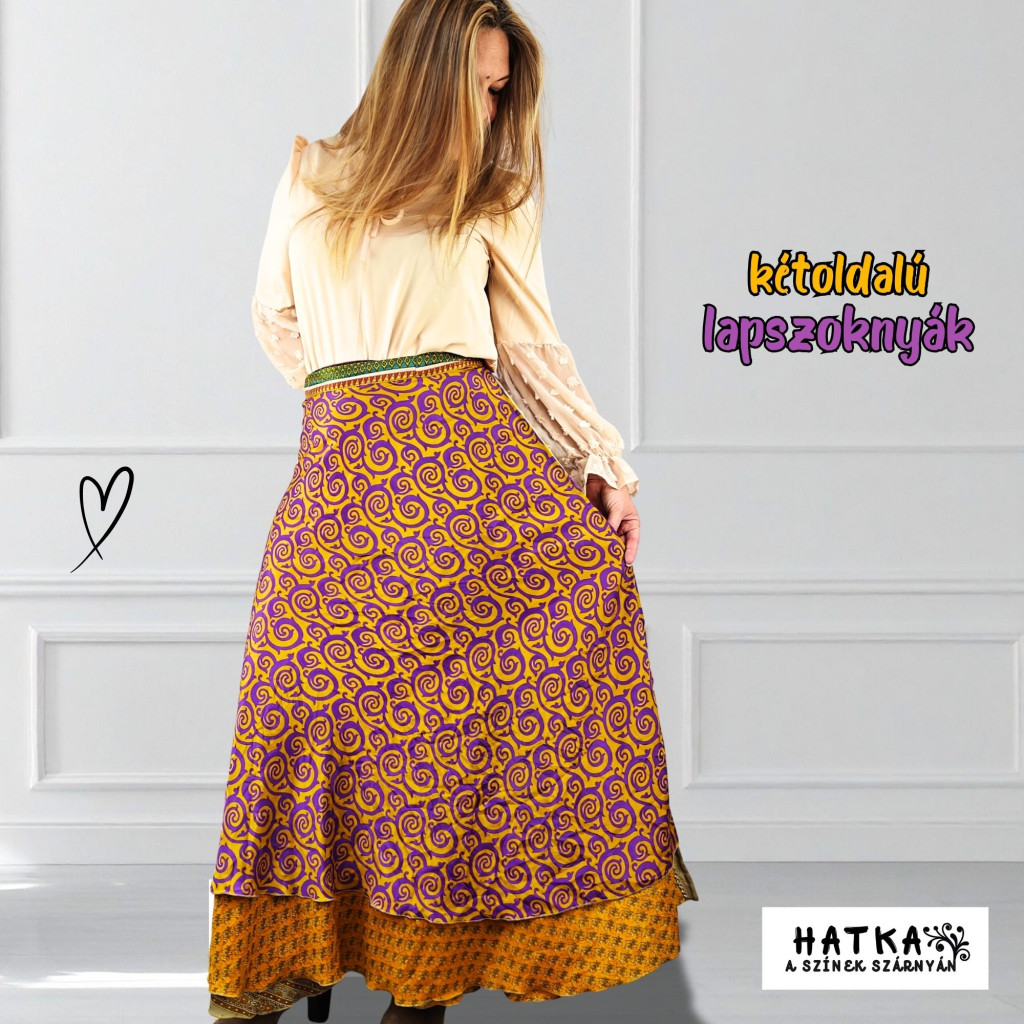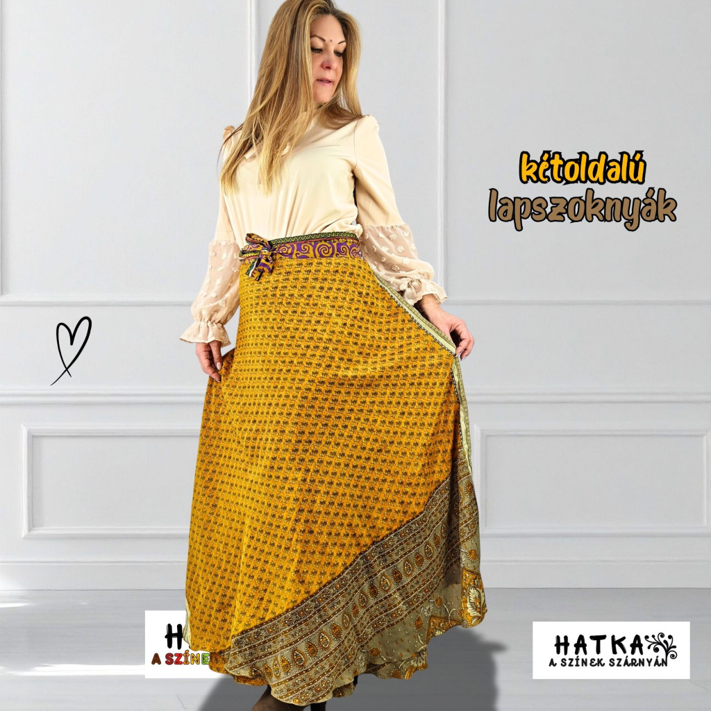 Lapszoknyáink újrahasznosított szárikból készülnek Indiában, egy hosszabb és egy rövidebb anyag derékban összevarrva! Két oldalú, kifordítható, mindkét oldala hordható, sokféleképpen köthető, variálható. Szoknyáinkból nincs két egyforma, mindegyikből csak EGY darab van, ha megtetszik, csapj le rá!