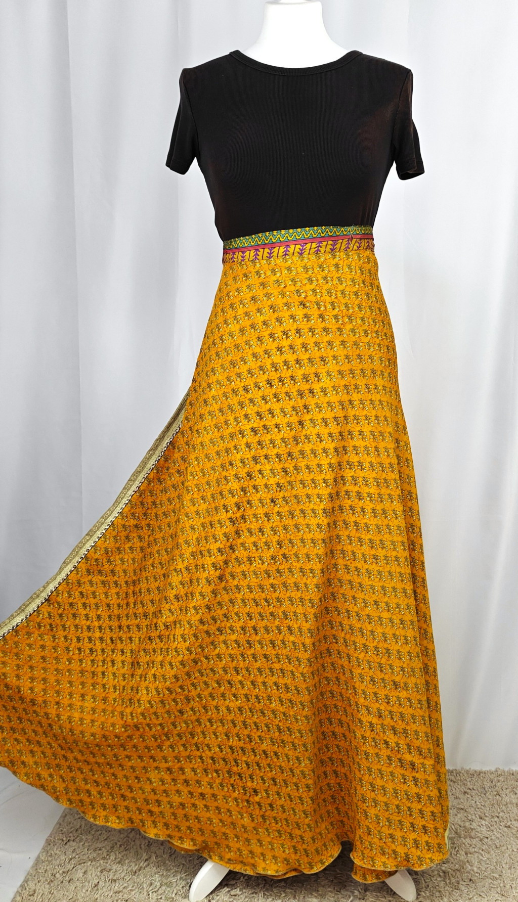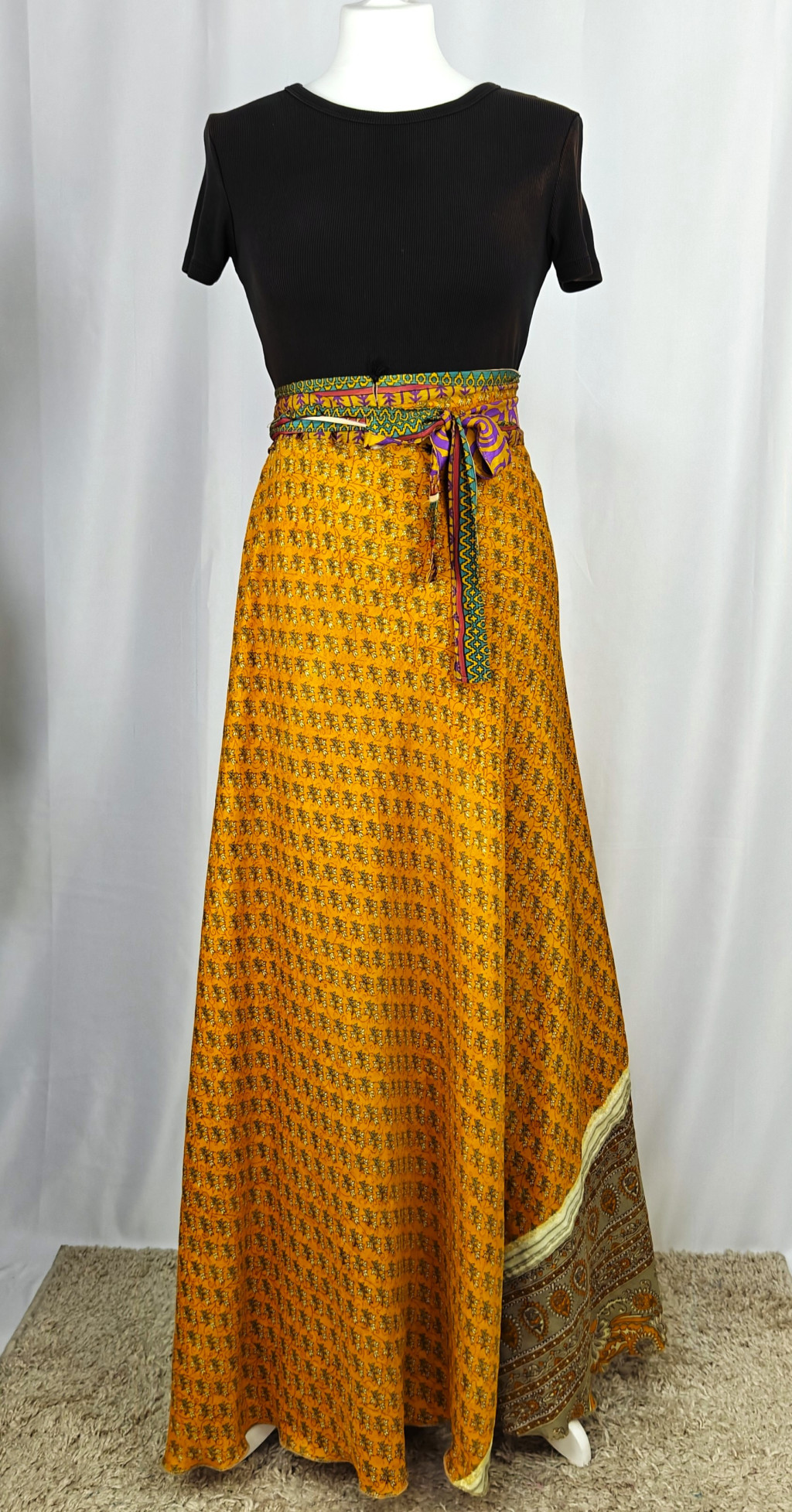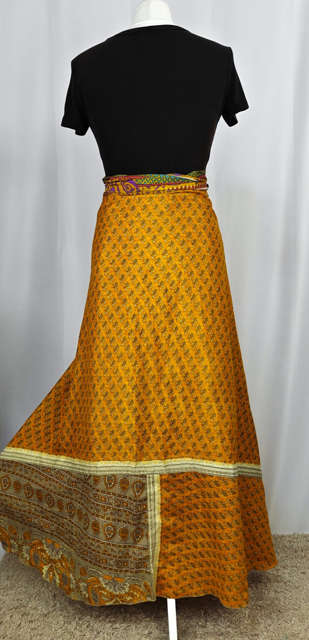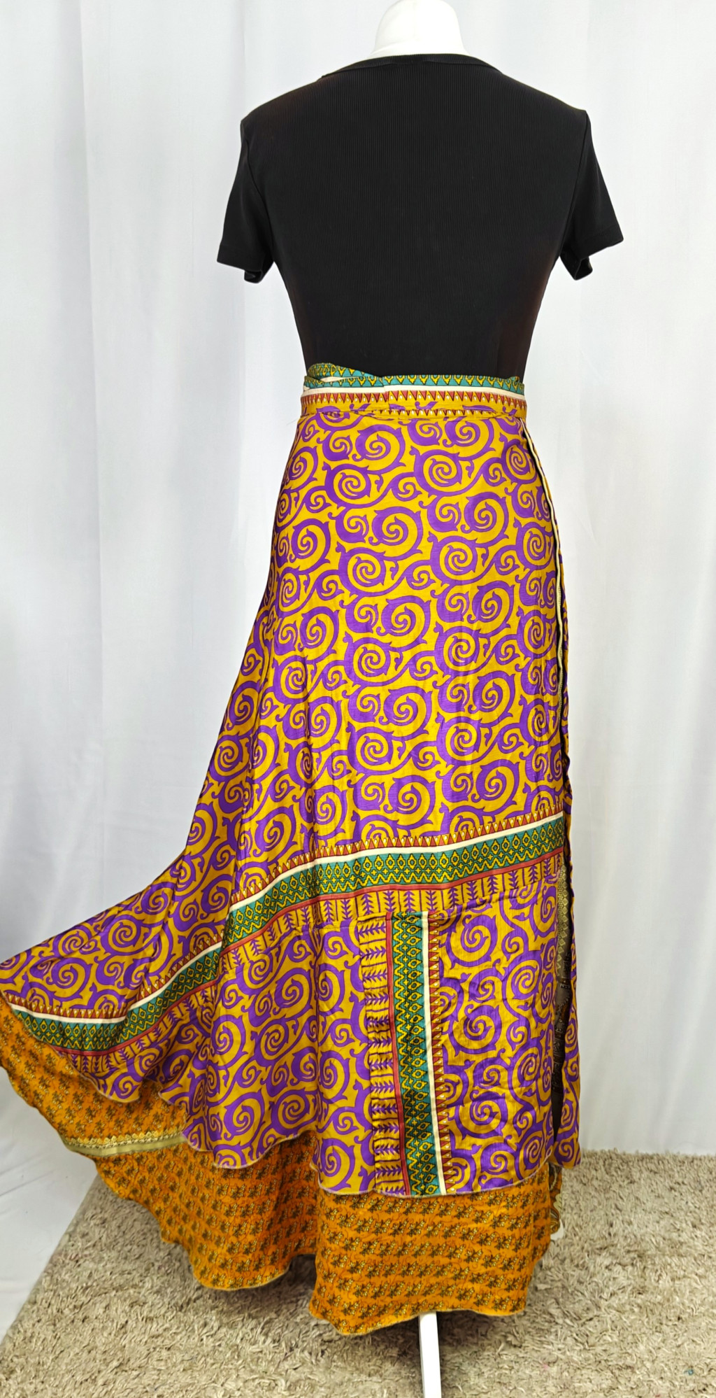 Lapszoknyáink újrahasznosított szárikból készülnek Indiában, egy hosszabb és egy rövidebb anyag derékban összevarrva! Két oldalú, kifordítható, mindkét oldala hordható, sokféleképpen köthető, variálható. Szoknyáinkból nincs két egyforma, mindegyikből csak EGY darab van, ha megtetszik, csapj le rá!