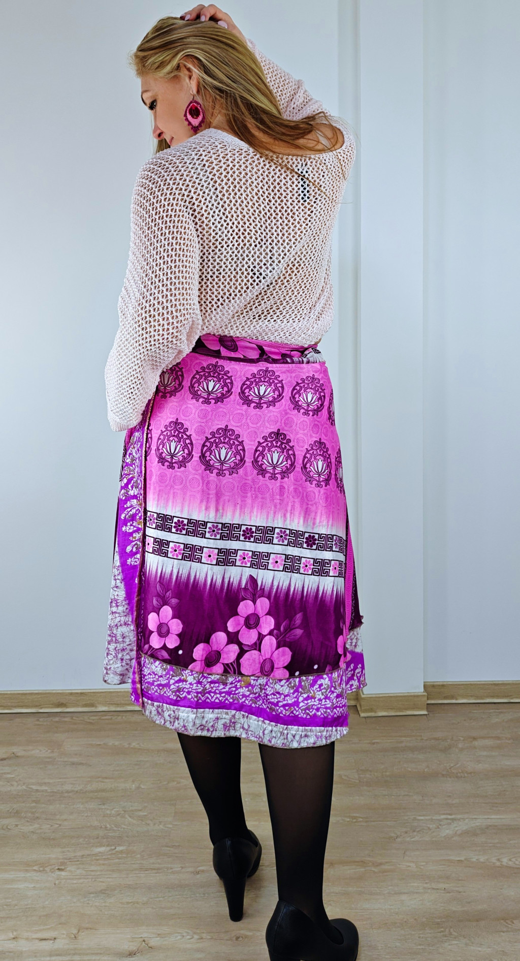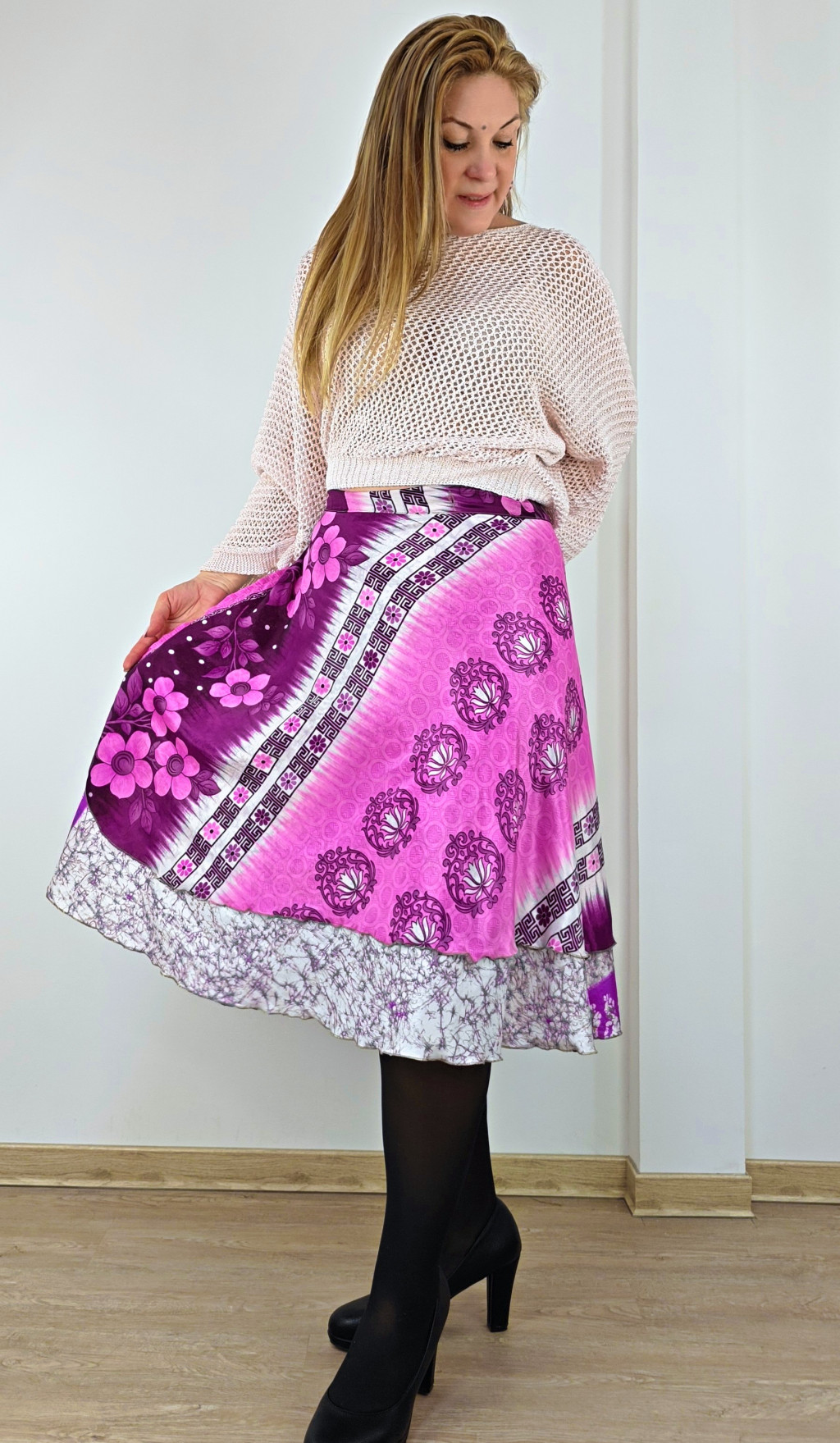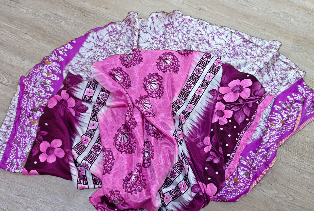 Lapszoknyáink újrahasznosított szárikból készülnek Indiában, egy hosszabb és egy rövidebb anyag derékban összevarrva! Két oldalú, kifordítható, mindkét oldala hordható, sokféleképpen köthető, variálható. Szoknyáinkból nincs két egyforma, mindegyikből csak EGY darab van, ha megtetszik, csapj le rá!