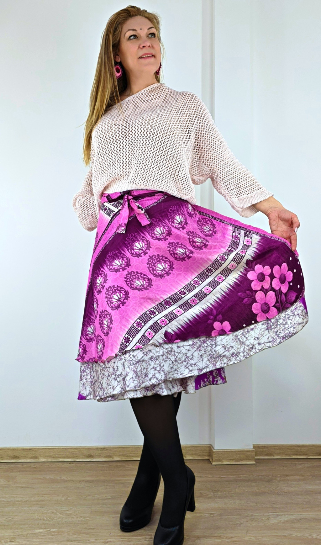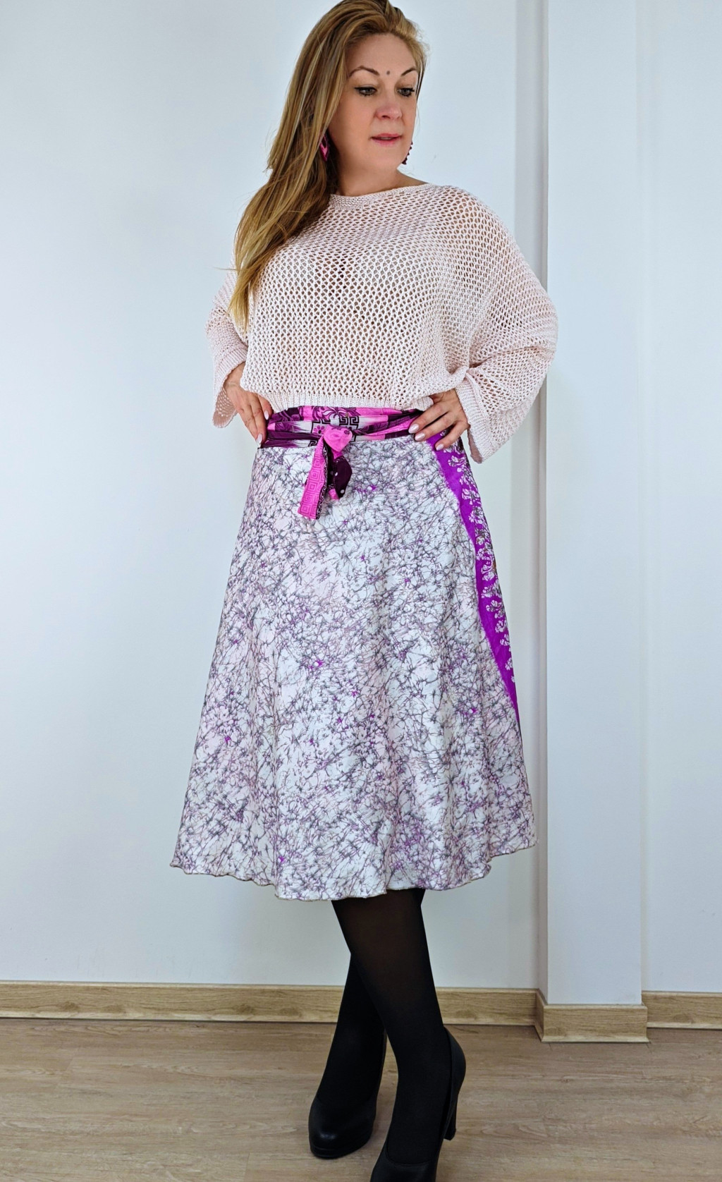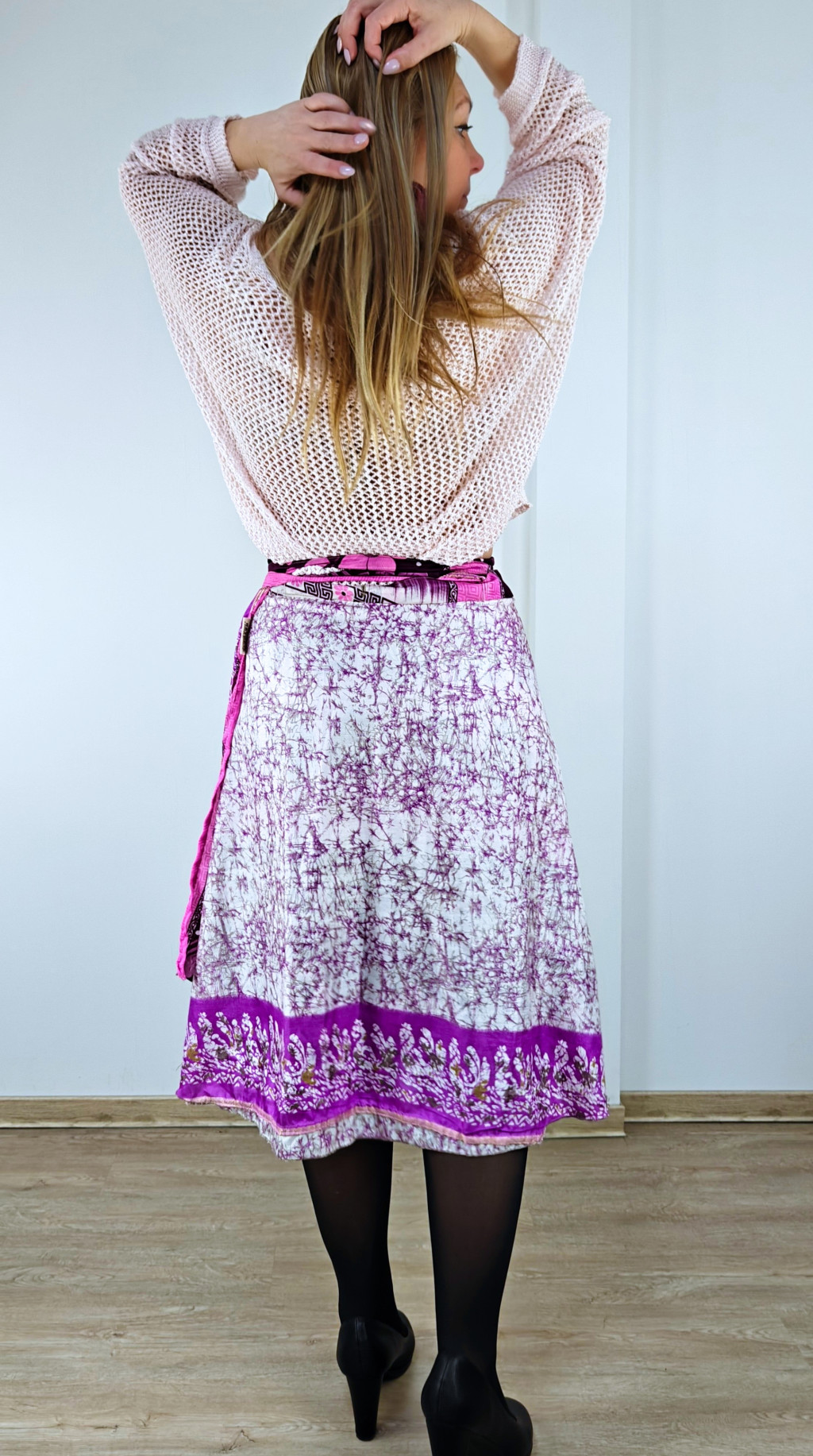 Lapszoknyáink újrahasznosított szárikból készülnek Indiában, egy hosszabb és egy rövidebb anyag derékban összevarrva! Két oldalú, kifordítható, mindkét oldala hordható, sokféleképpen köthető, variálható. Szoknyáinkból nincs két egyforma, mindegyikből csak EGY darab van, ha megtetszik, csapj le rá!