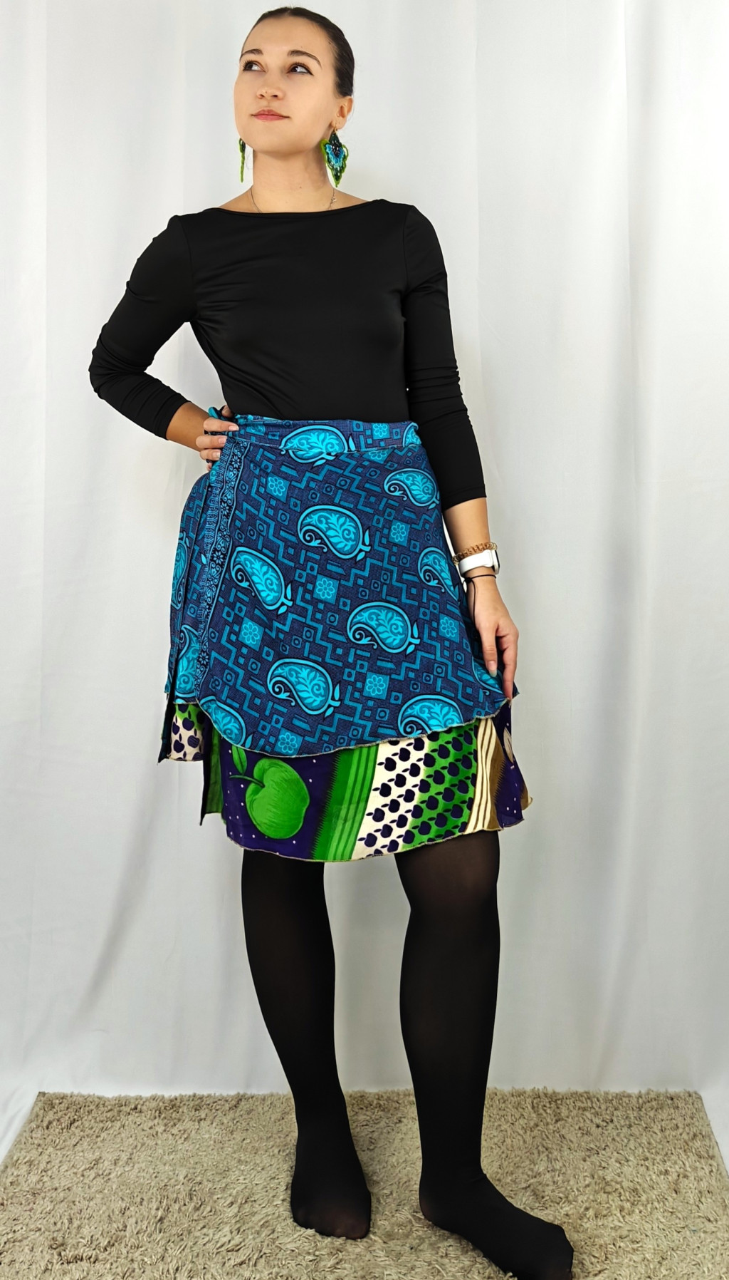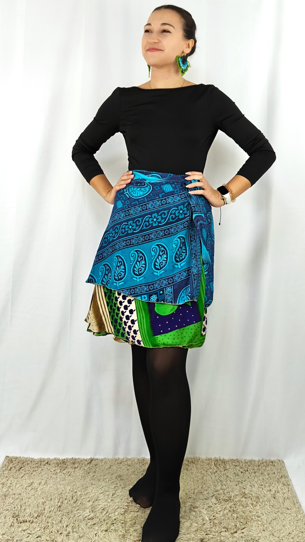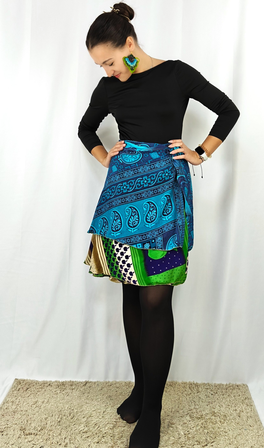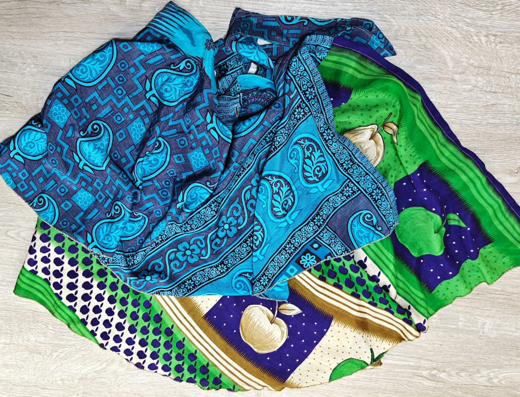 Lapszoknyáink újrahasznosított szárikból készülnek Indiában, egy hosszabb és egy rövidebb anyag derékban összevarrva! Két oldalú, kifordítható, mindkét oldala hordható, sokféleképpen köthető, variálható. Szoknyáinkból nincs két egyforma, mindegyikből csak EGY darab van, ha megtetszik, csapj le rá!