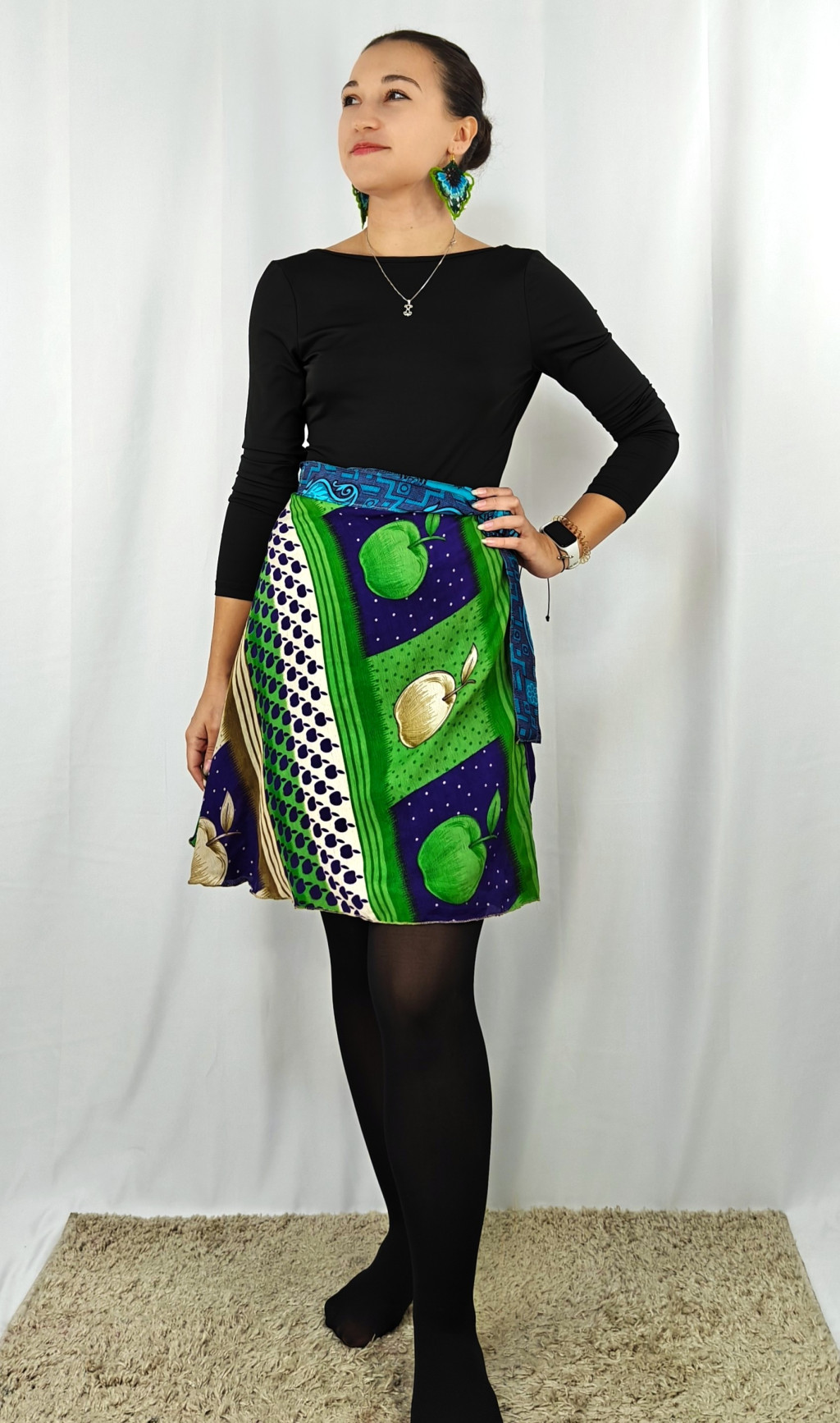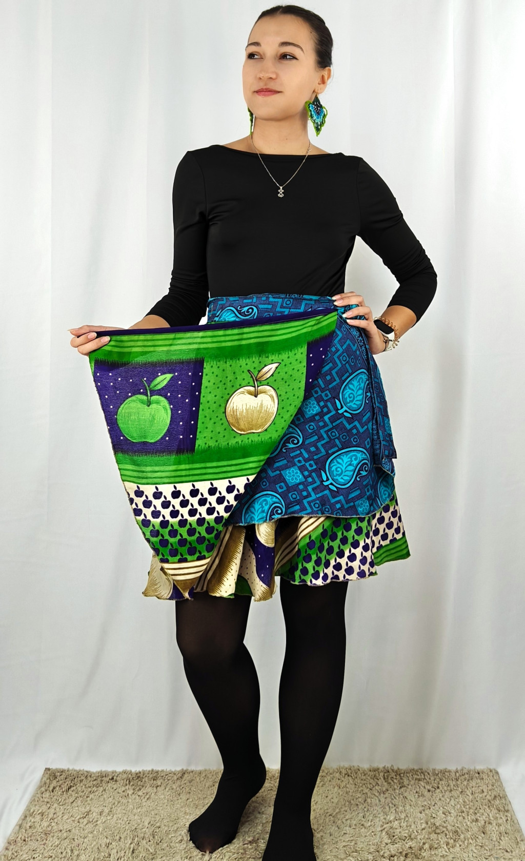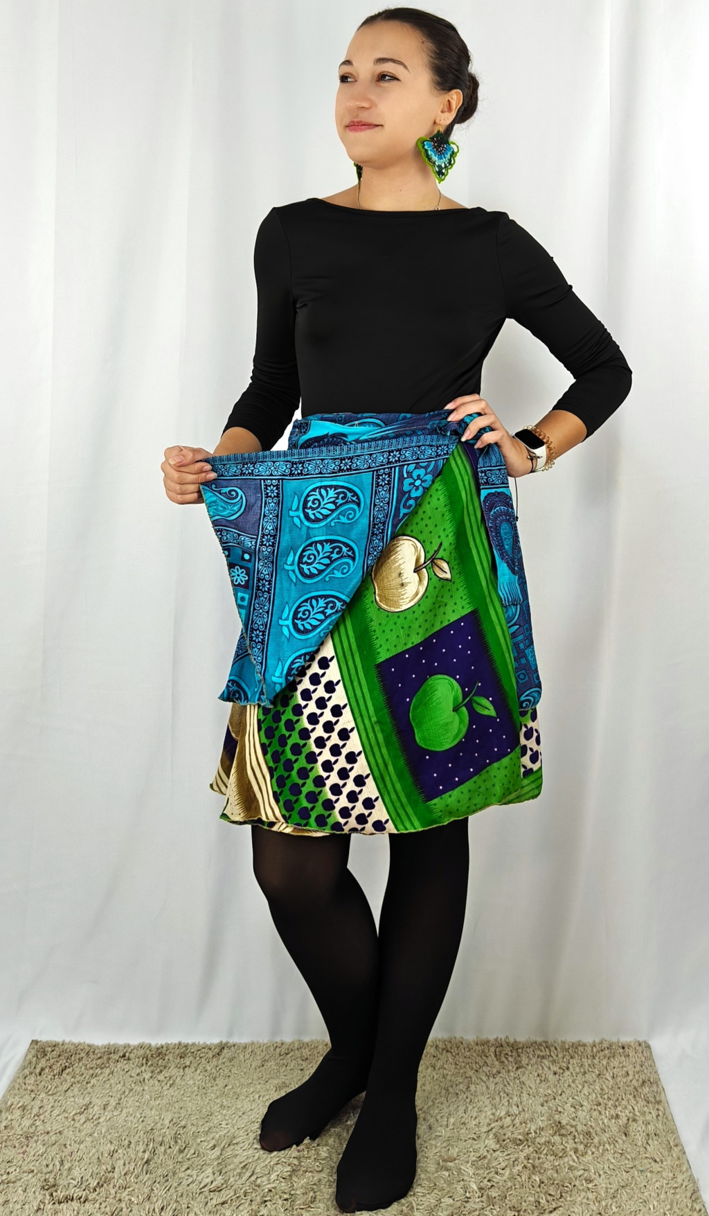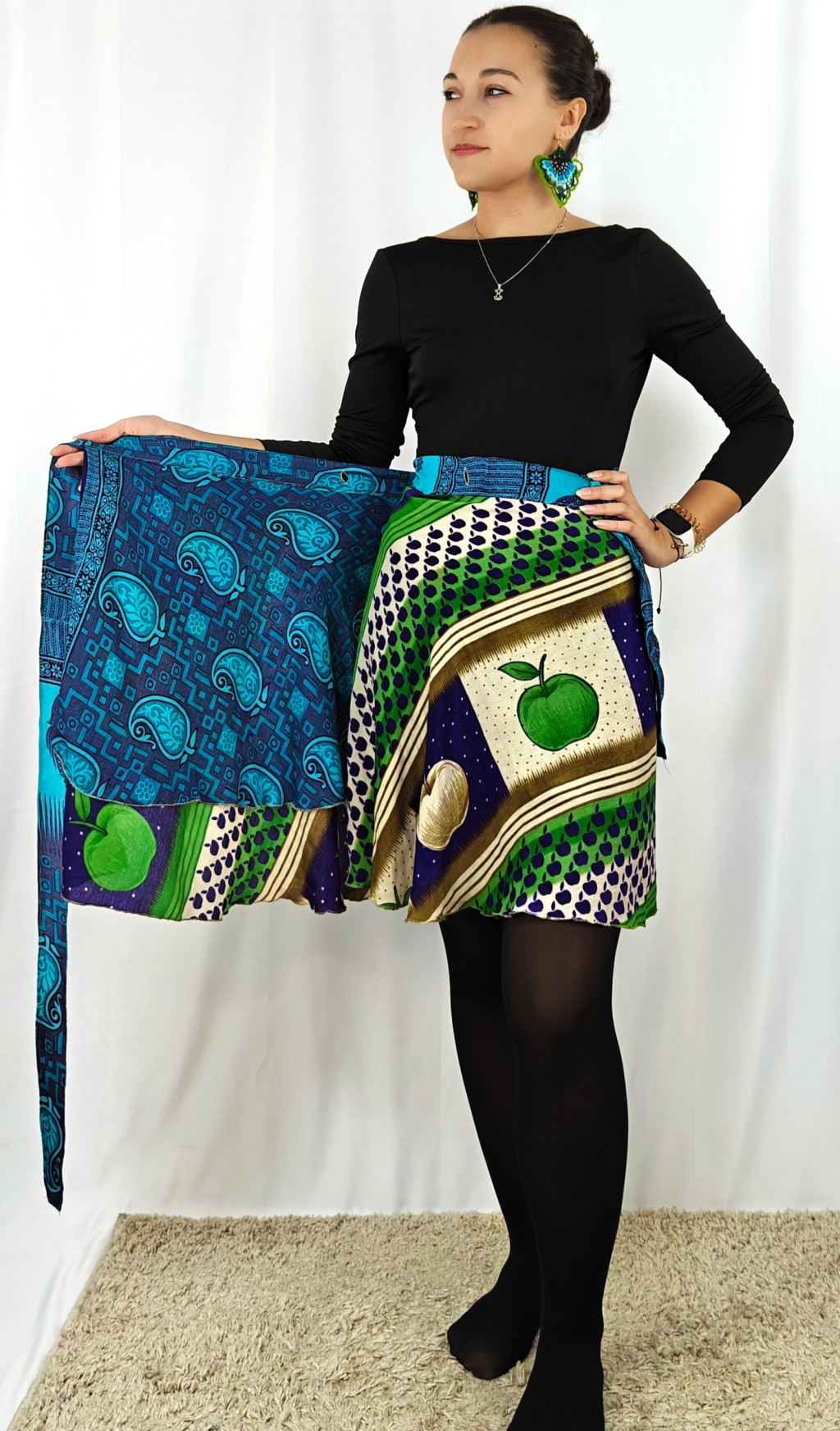 Lapszoknyáink újrahasznosított szárikból készülnek Indiában, egy hosszabb és egy rövidebb anyag derékban összevarrva! Két oldalú, kifordítható, mindkét oldala hordható, sokféleképpen köthető, variálható. Szoknyáinkból nincs két egyforma, mindegyikből csak EGY darab van, ha megtetszik, csapj le rá!