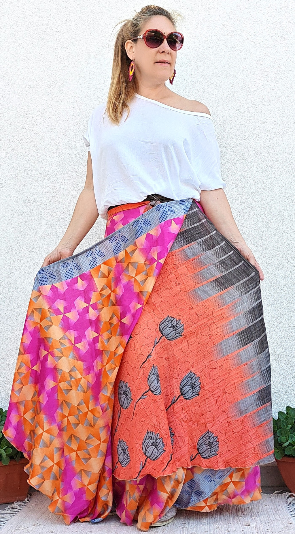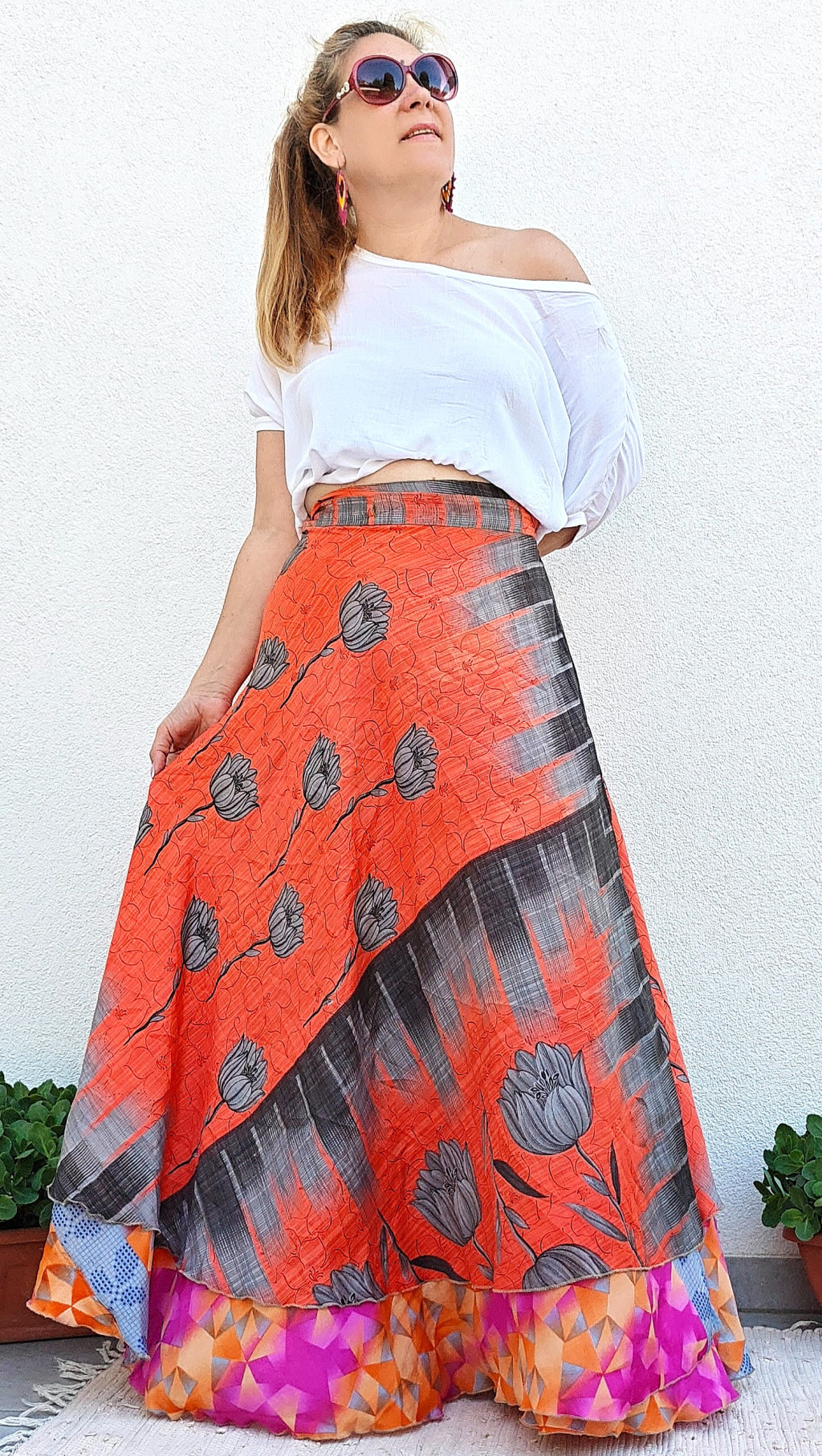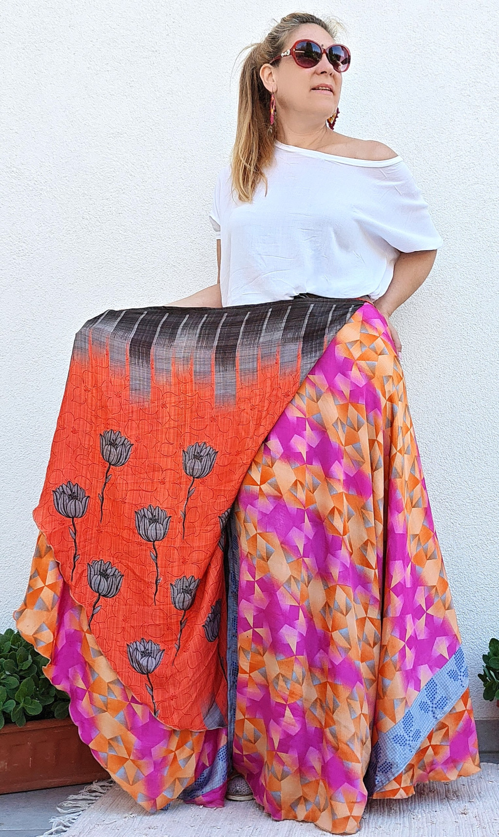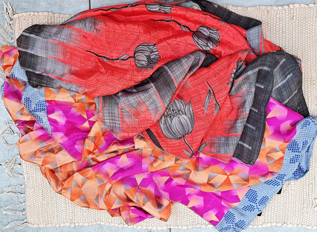 Lapszoknyáink újrahasznosított szárikból készülnek Indiában, egy hosszabb és egy rövidebb anyag derékban összevarrva! Kifordítható, mindkét oldala hordható, sokféleképpen köthető, variálható. Szoknyáinkból nincs két egyforma, mindegyikből csak EGY darab van, ha megtetszik, csapj le rá!