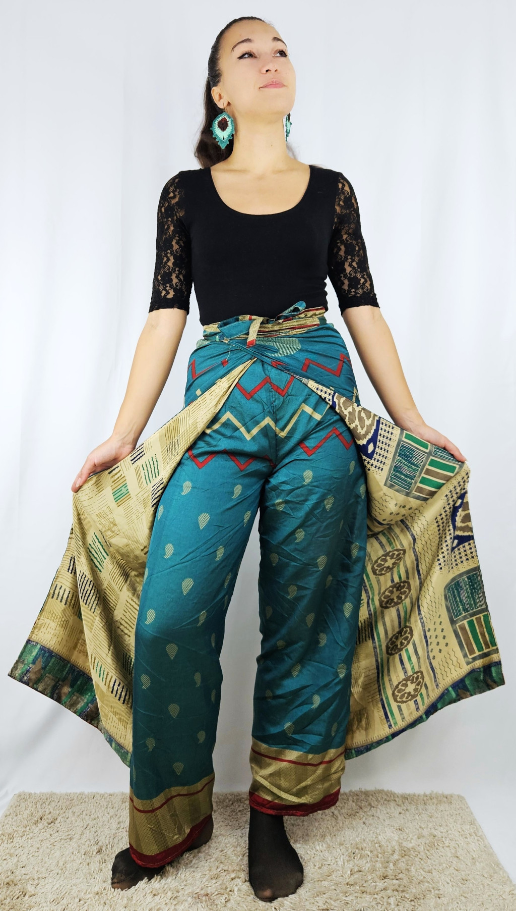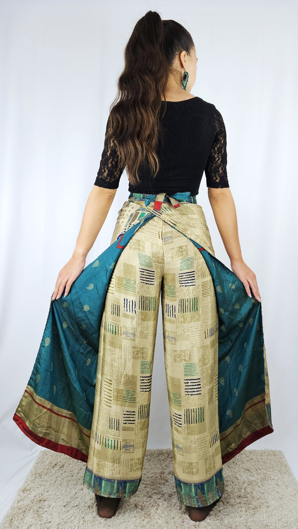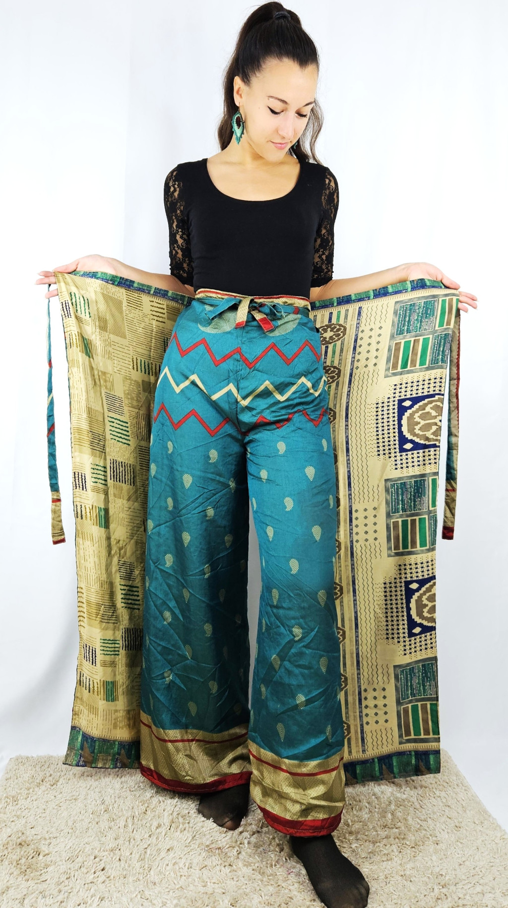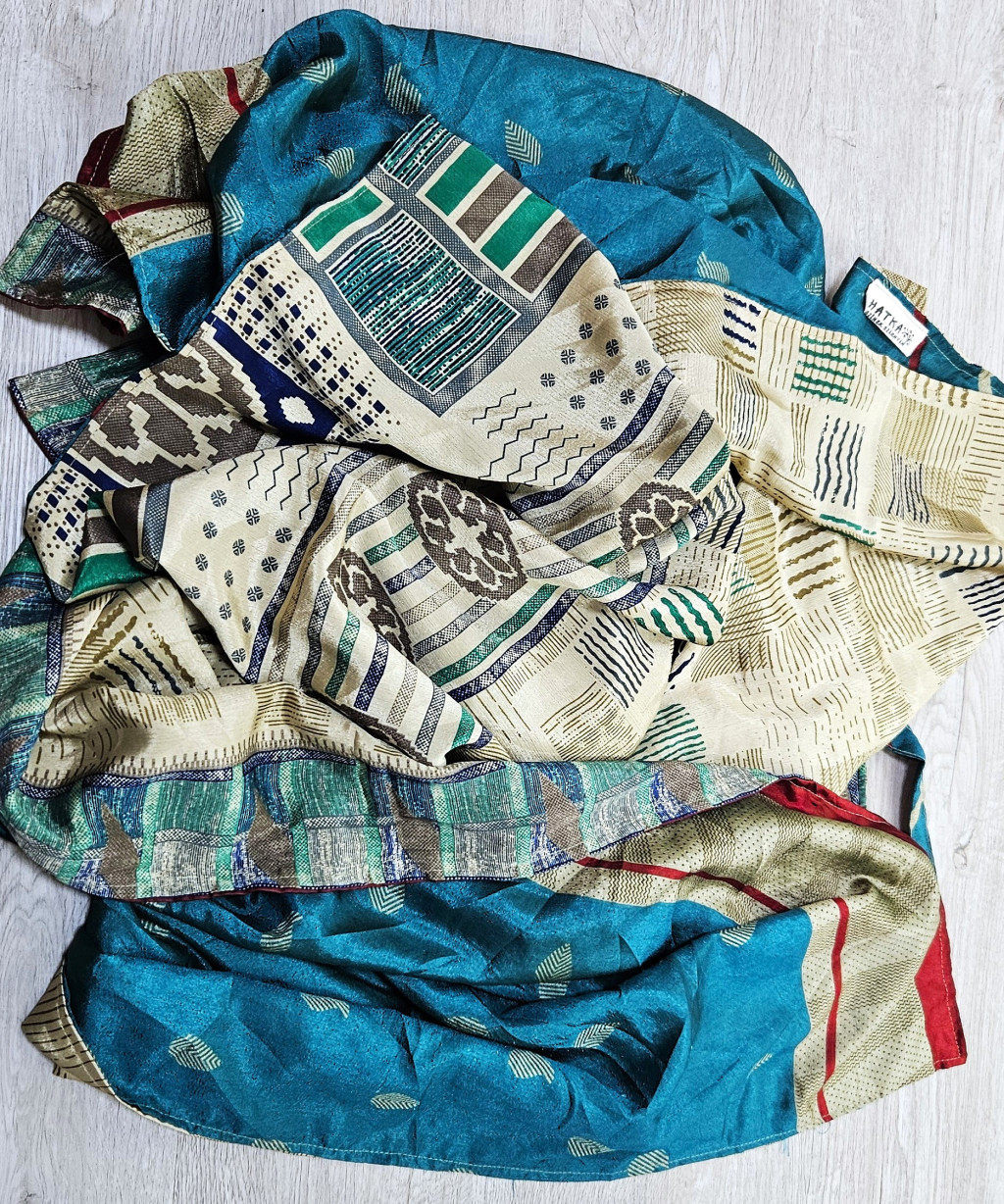 Lapnadrágjaink újrahasznosított szárikból készülnek Indiában. Két különböző csodás anyagot varrnak össze, így a külső és belső fele is hordható!