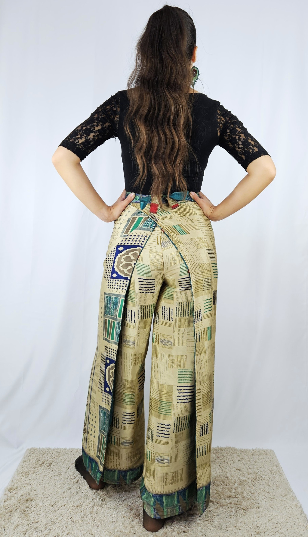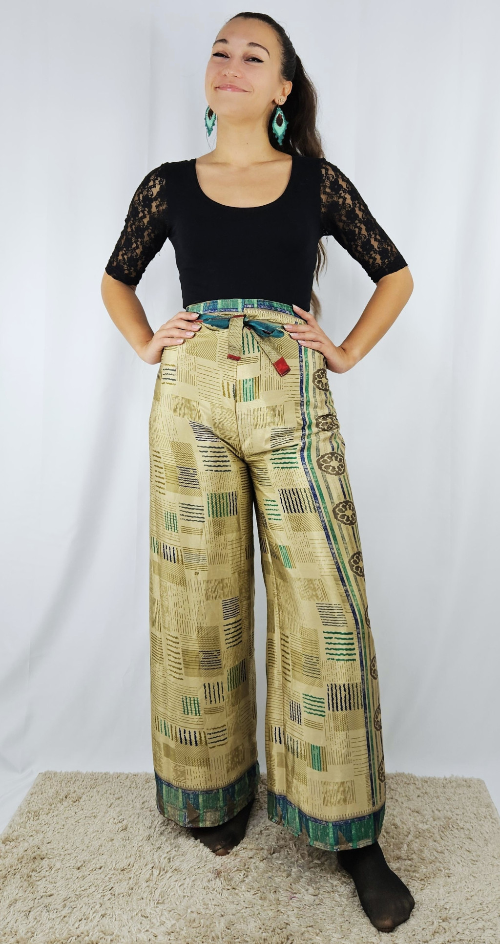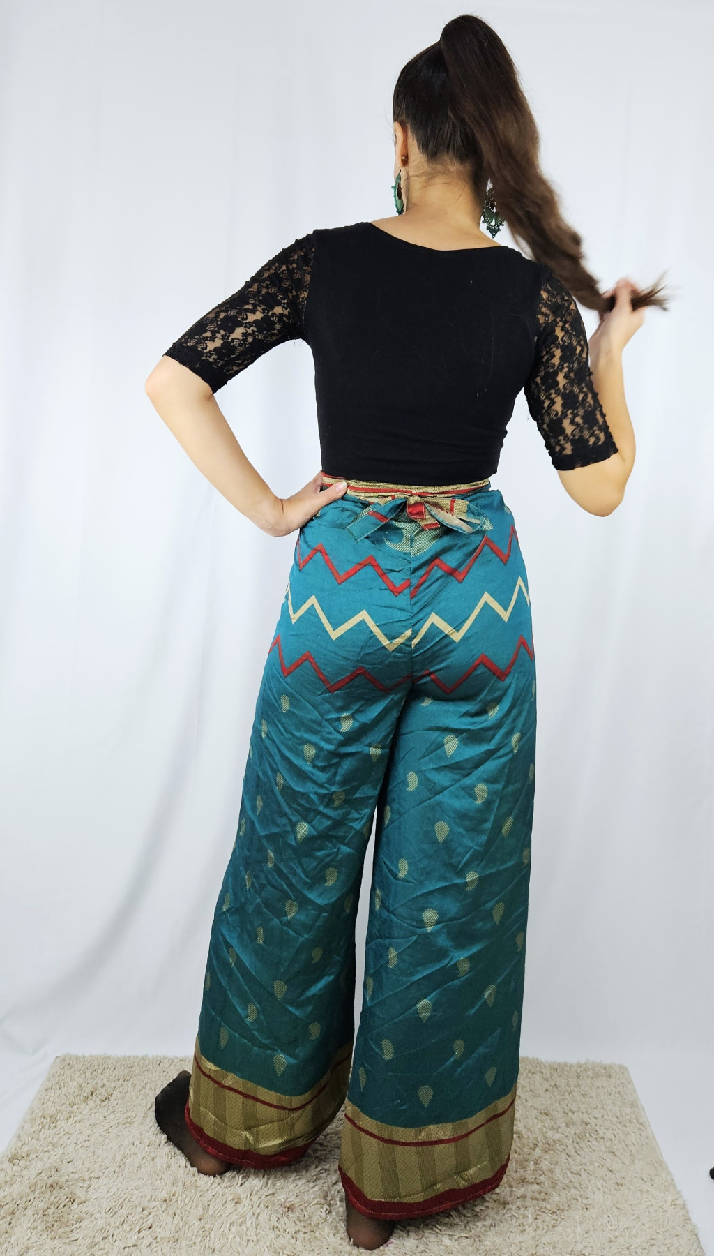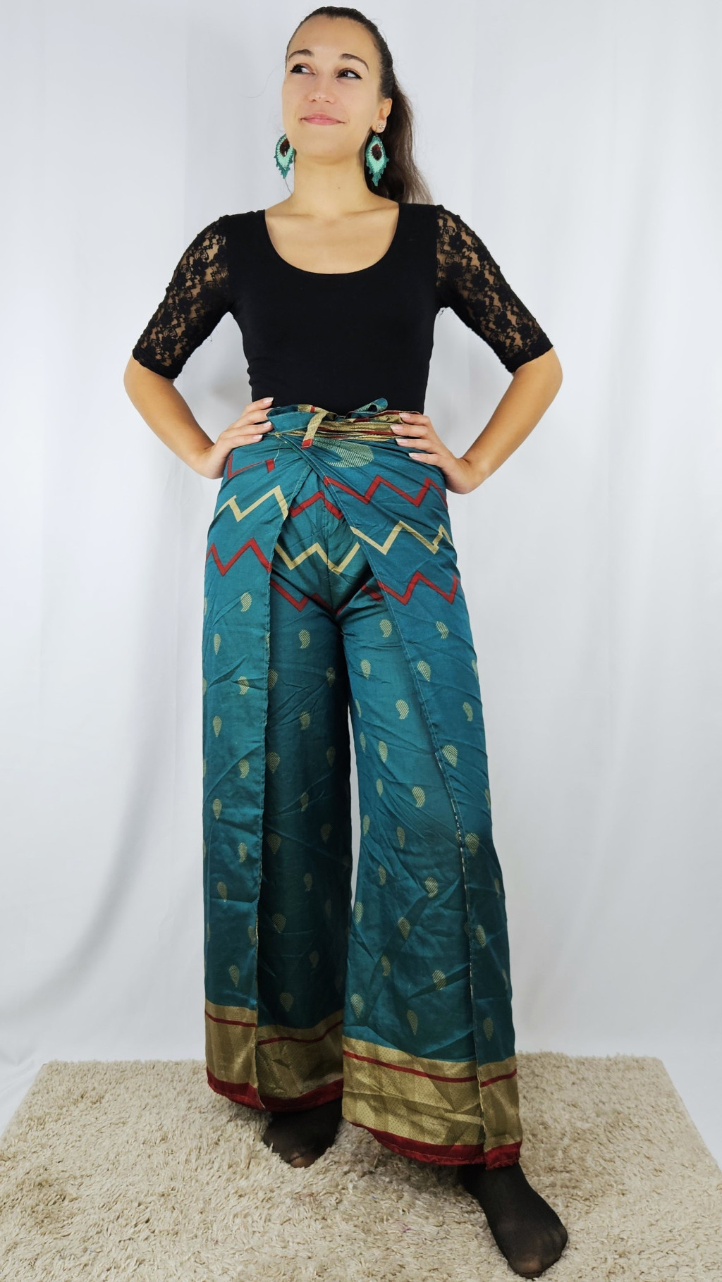 Lapnadrágjaink újrahasznosított szárikból készülnek Indiában. Két különböző csodás anyagot varrnak össze, így a külső és belső fele is hordható!