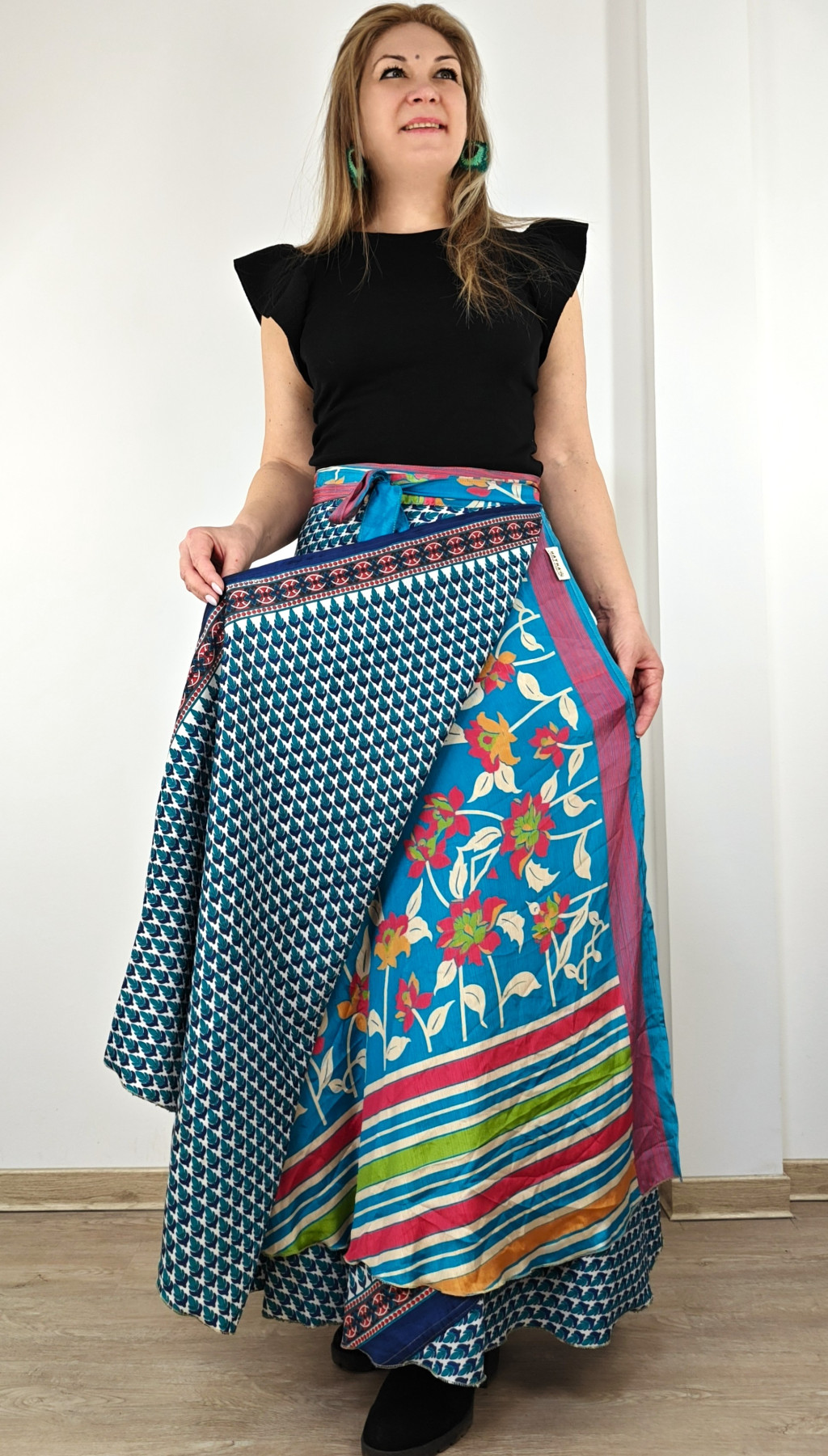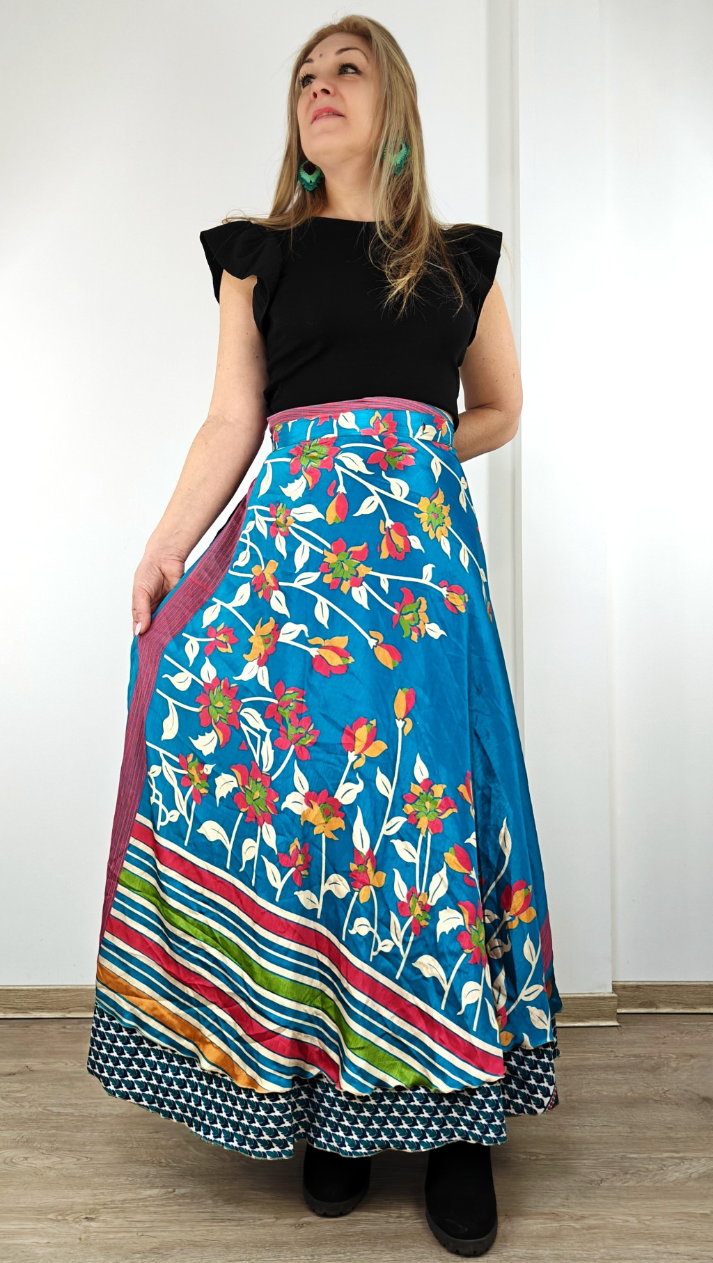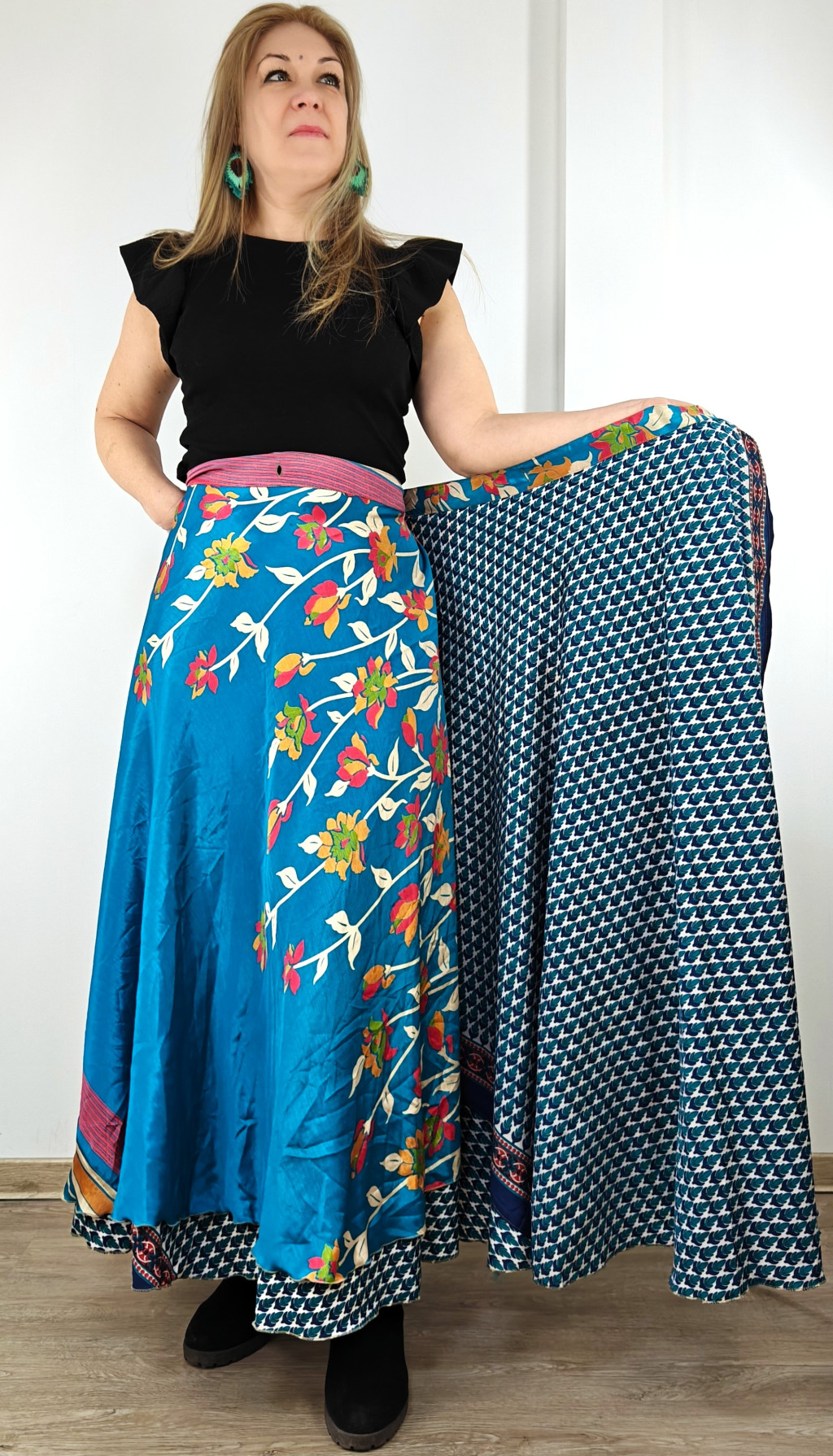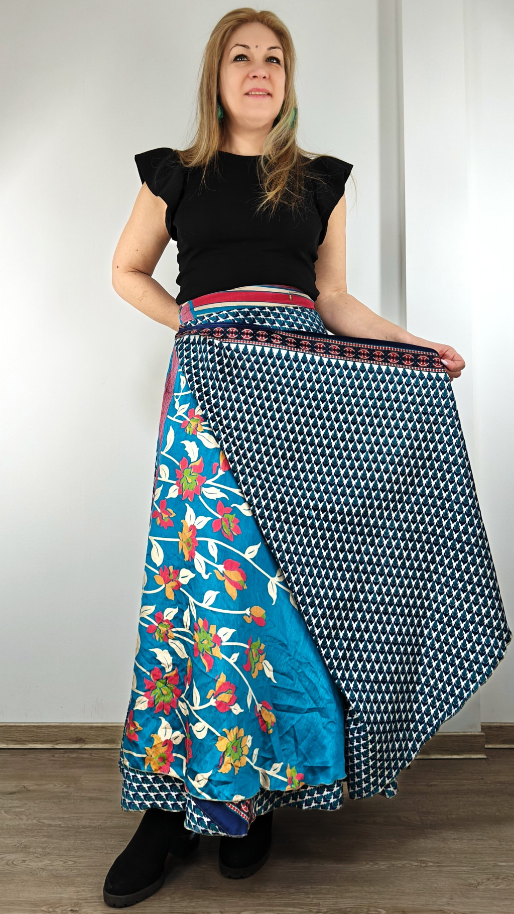Lapszoknyáink újrahasznosított szárikból készülnek Indiában, egy hosszabb és egy rövidebb anyag derékban összevarrva! Két oldalú, kifordítható, mindkét oldala hordható, sokféleképpen köthető, variálható. Szoknyáinkból nincs két egyforma, mindegyikből csak EGY darab van, ha megtetszik, csapj le rá!