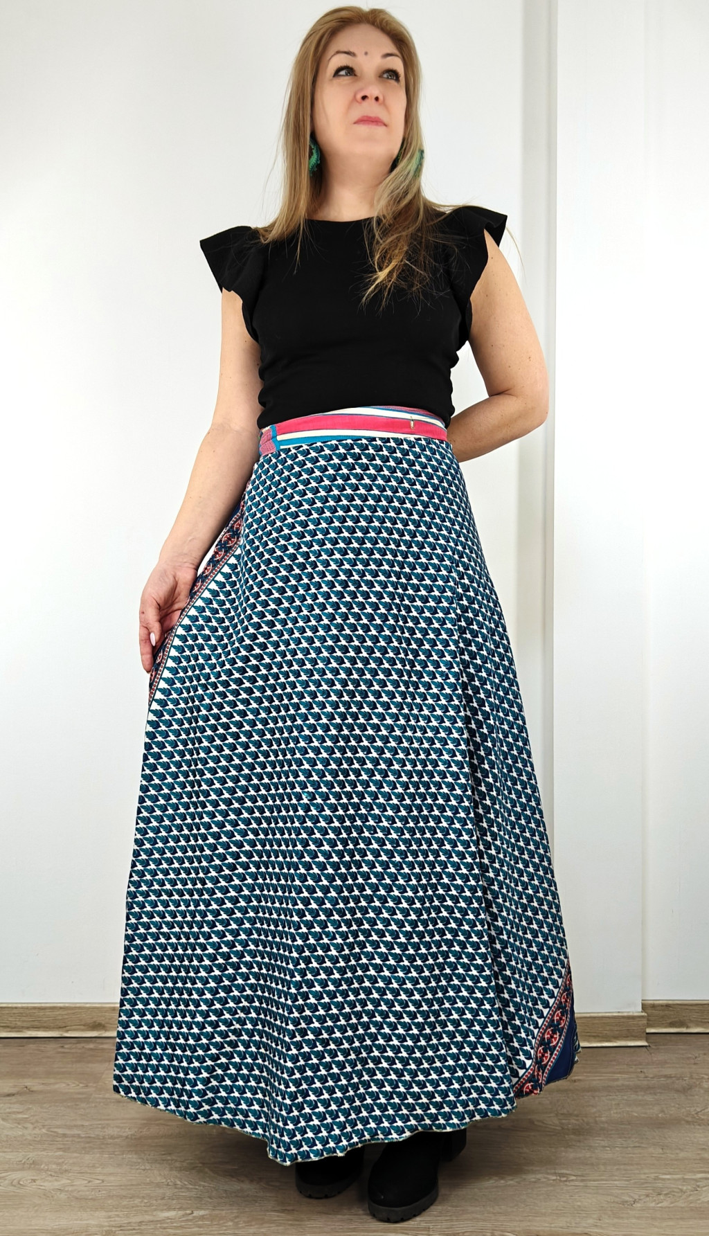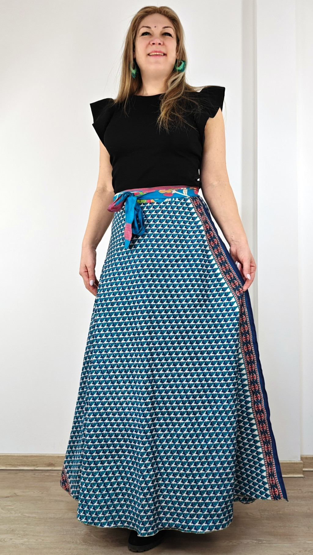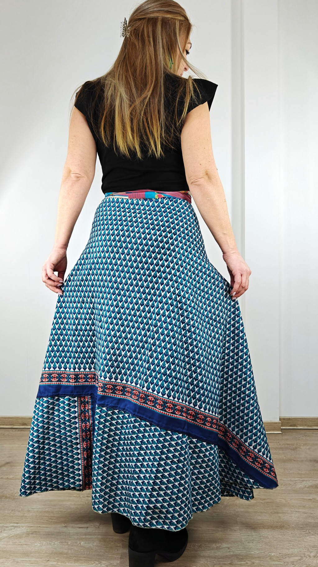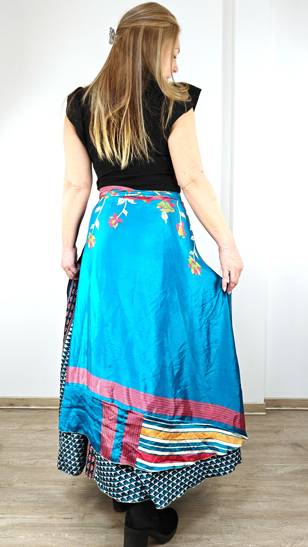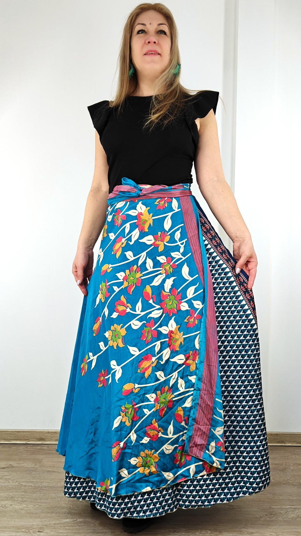 Lapszoknyáink újrahasznosított szárikból készülnek Indiában, egy hosszabb és egy rövidebb anyag derékban összevarrva! Két oldalú, kifordítható, mindkét oldala hordható, sokféleképpen köthető, variálható. Szoknyáinkból nincs két egyforma, mindegyikből csak EGY darab van, ha megtetszik, csapj le rá!