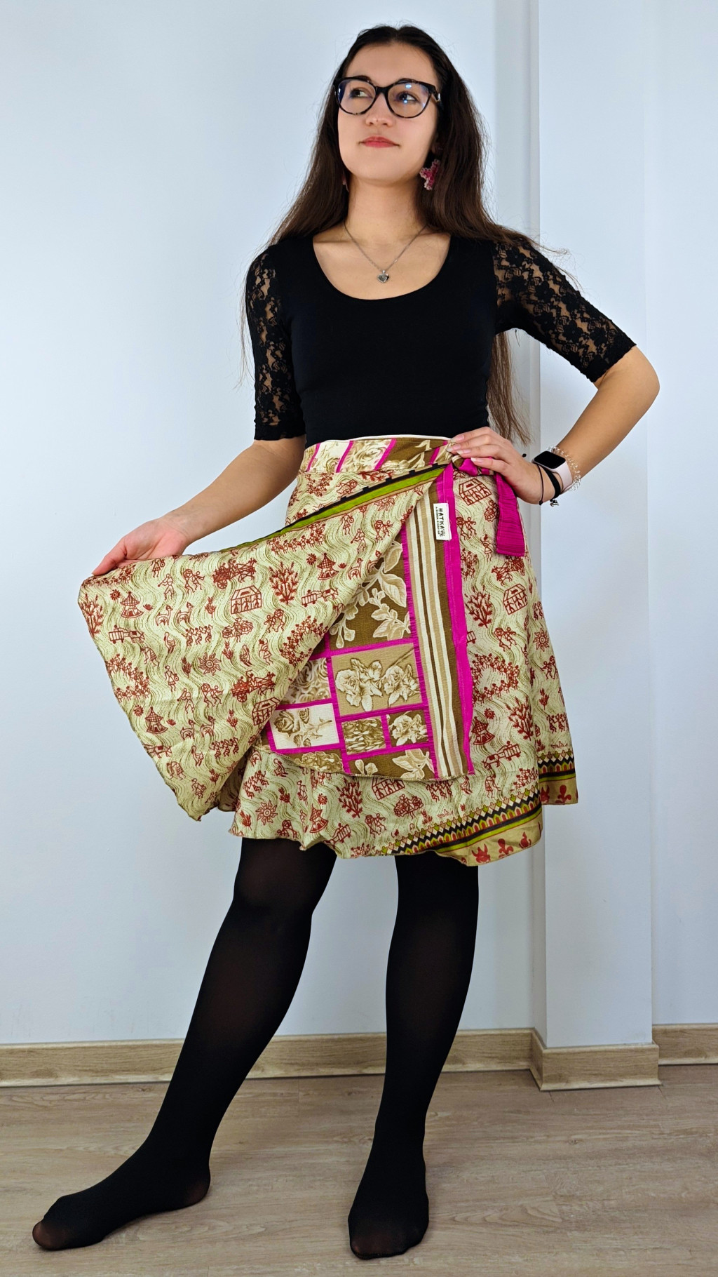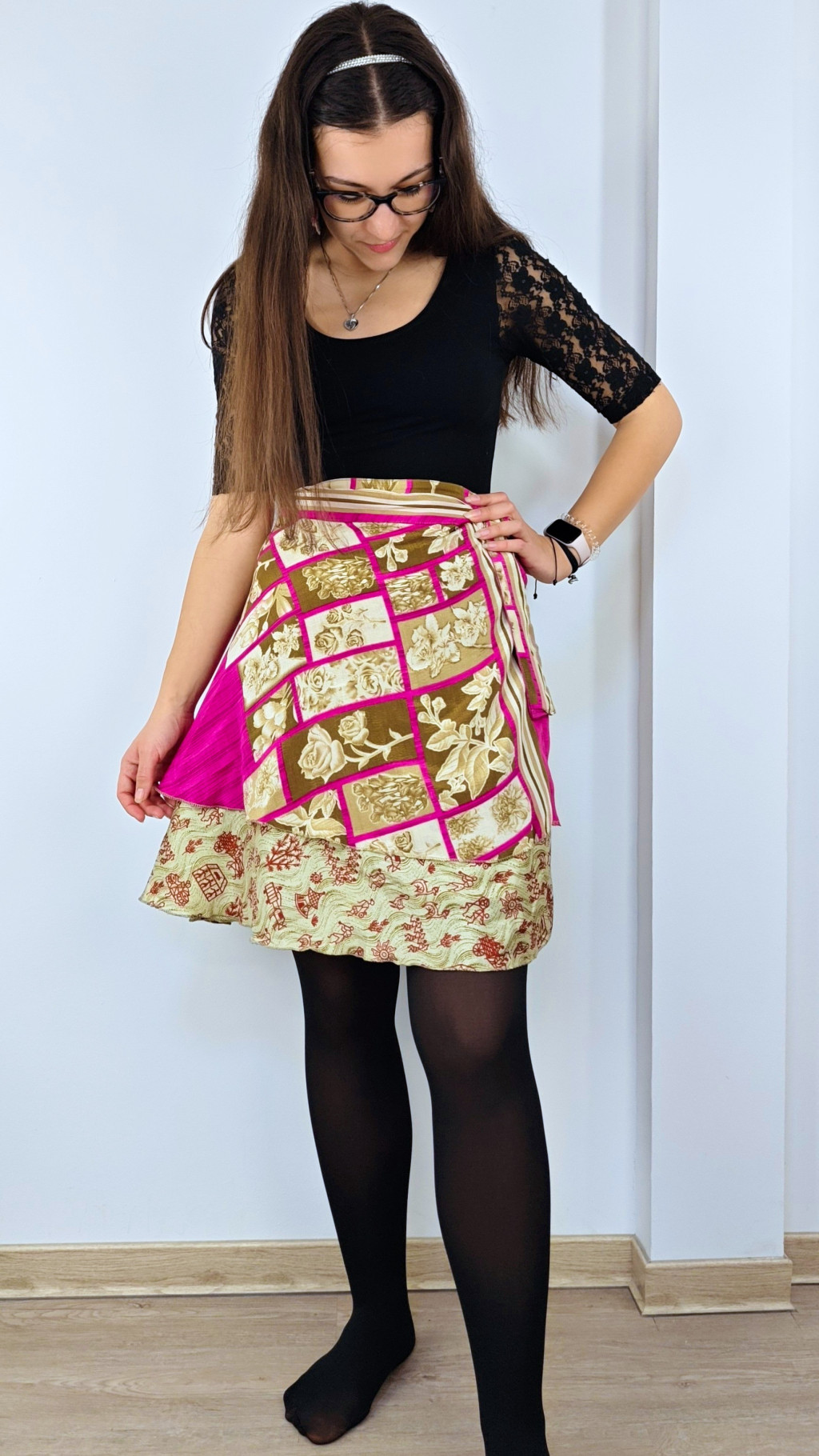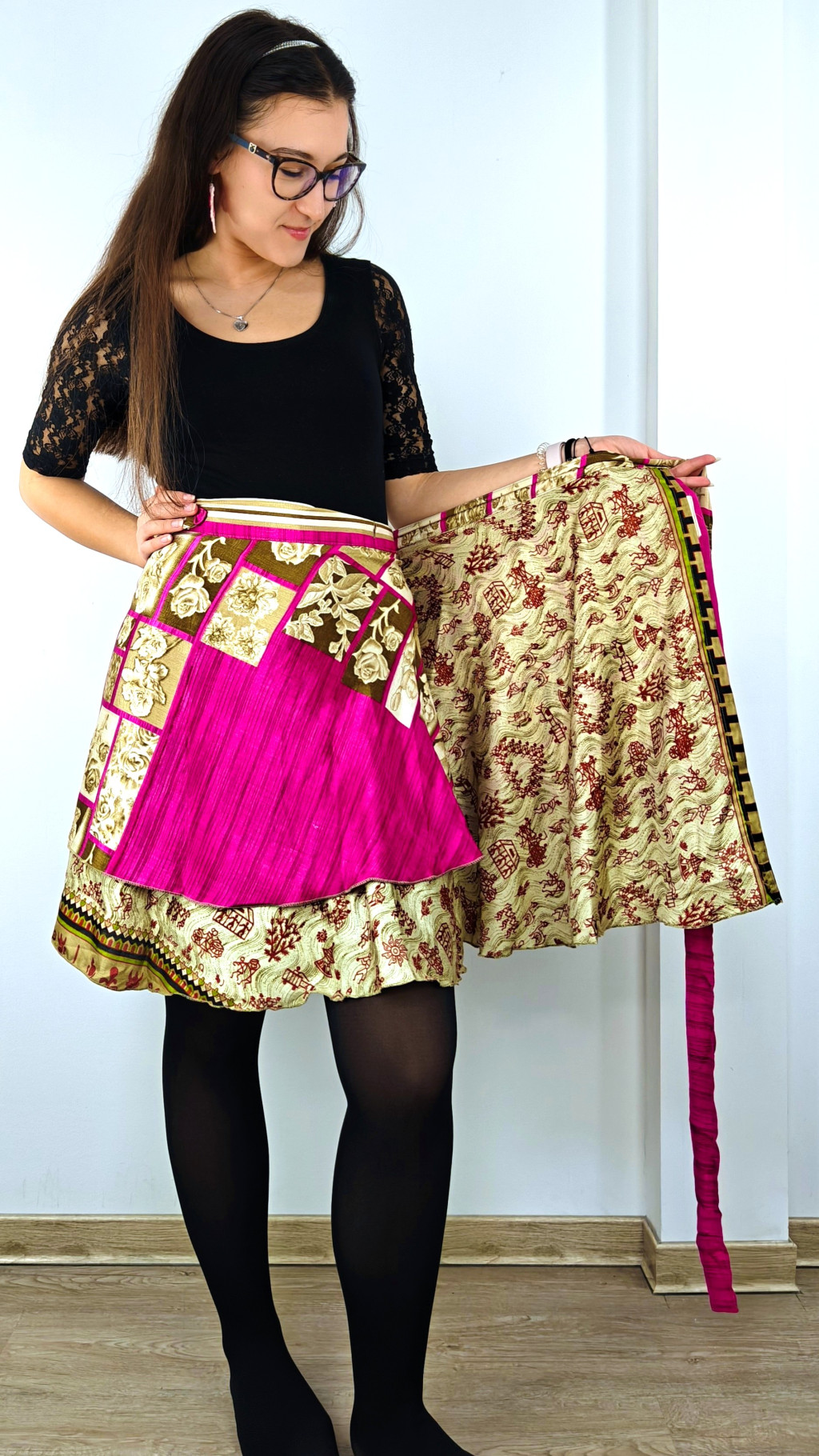 Lapszoknyáink újrahasznosított szárikból készülnek Indiában, egy hosszabb és egy rövidebb anyag derékban összevarrva! Két oldalú, kifordítható, mindkét oldala hordható, sokféleképpen köthető, variálható. Szoknyáinkból nincs két egyforma, mindegyikből csak EGY darab van, ha megtetszik, csapj le rá!