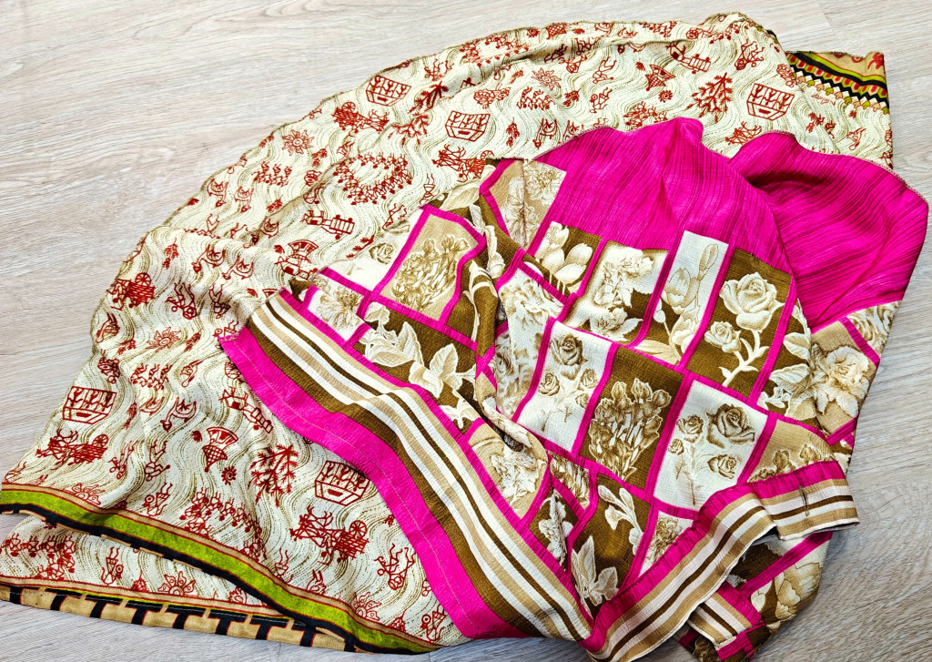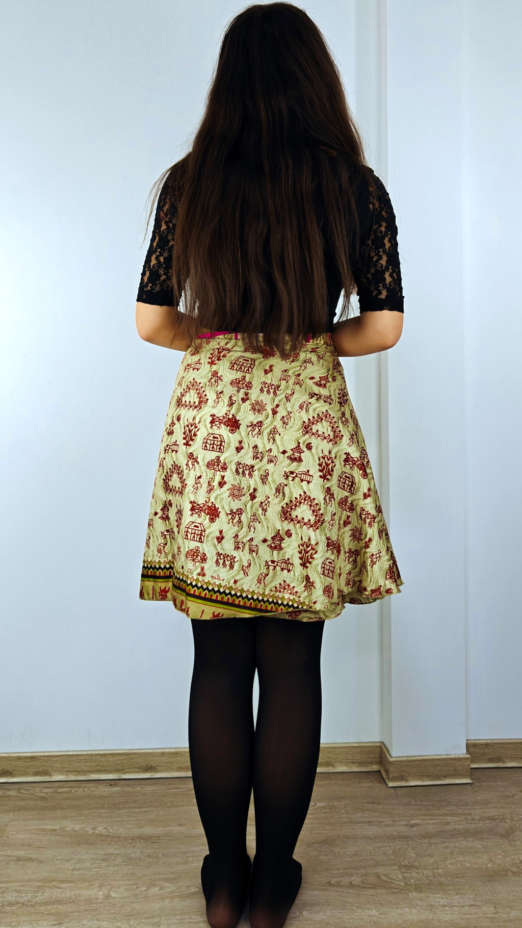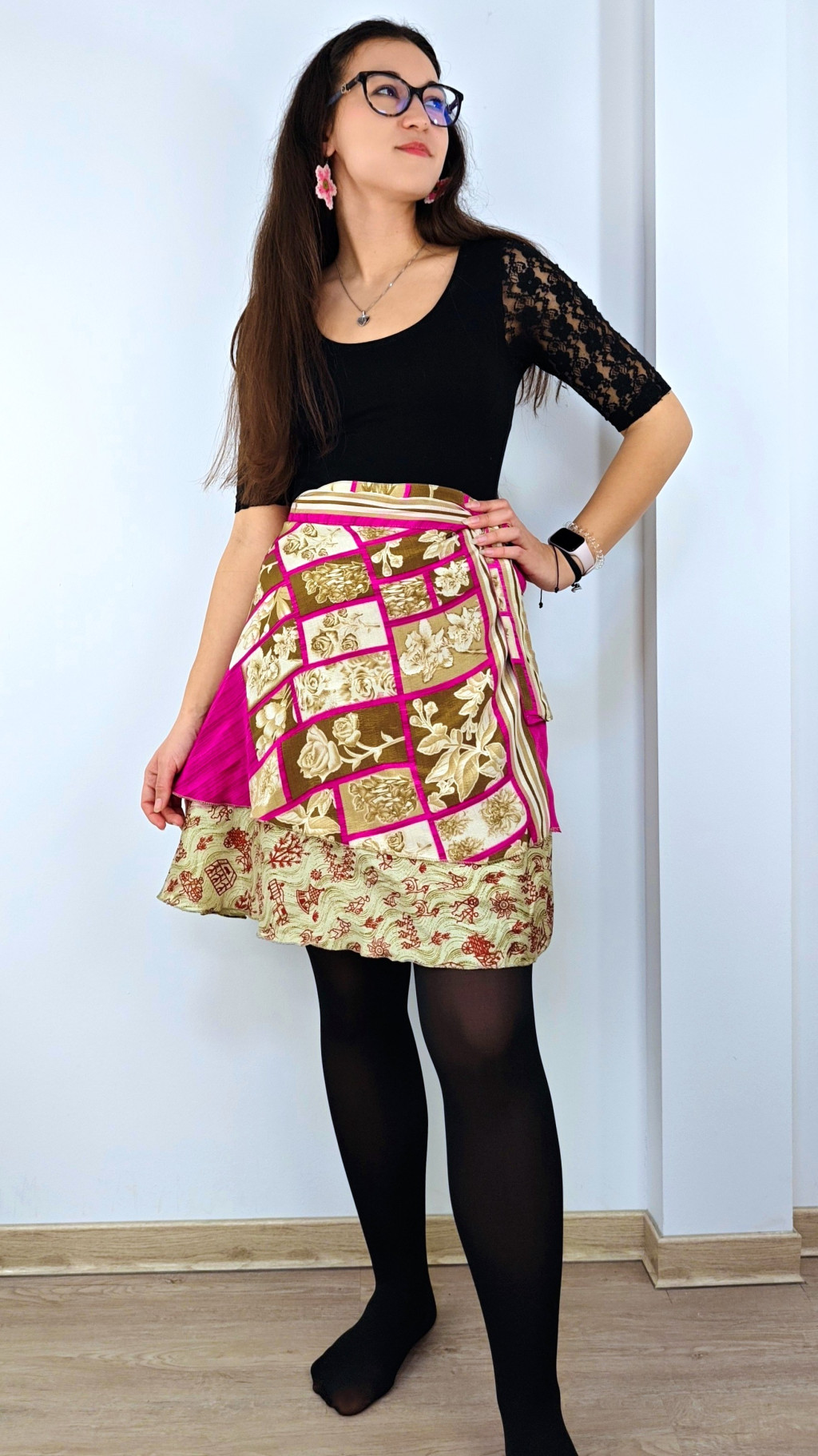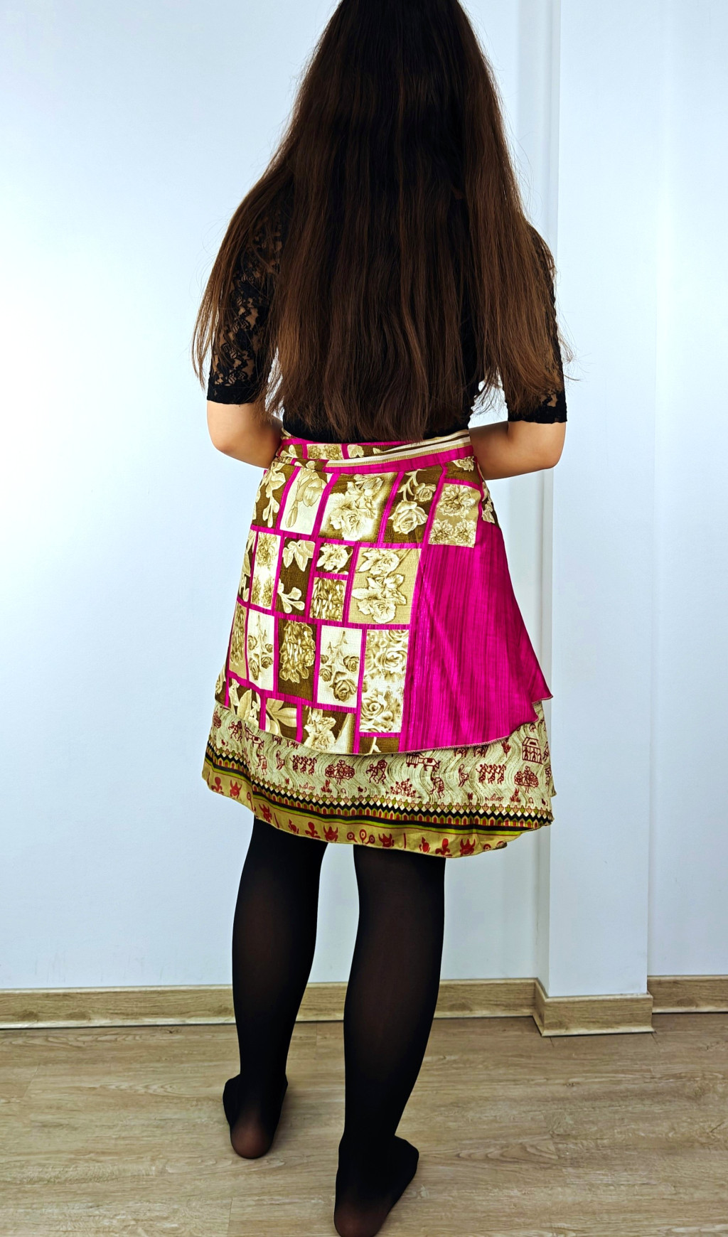 Lapszoknyáink újrahasznosított szárikból készülnek Indiában, egy hosszabb és egy rövidebb anyag derékban összevarrva! Két oldalú, kifordítható, mindkét oldala hordható, sokféleképpen köthető, variálható. Szoknyáinkból nincs két egyforma, mindegyikből csak EGY darab van, ha megtetszik, csapj le rá!