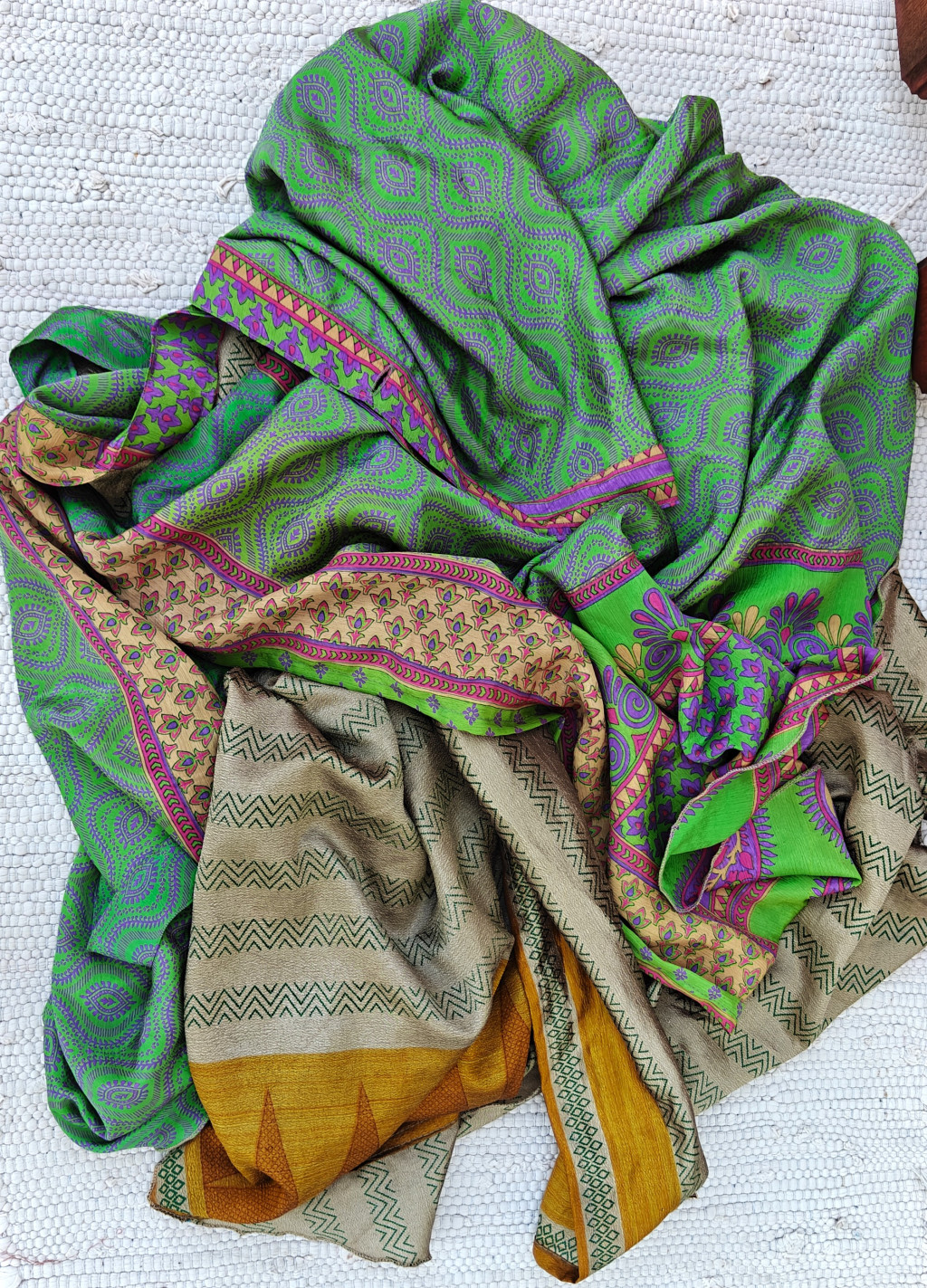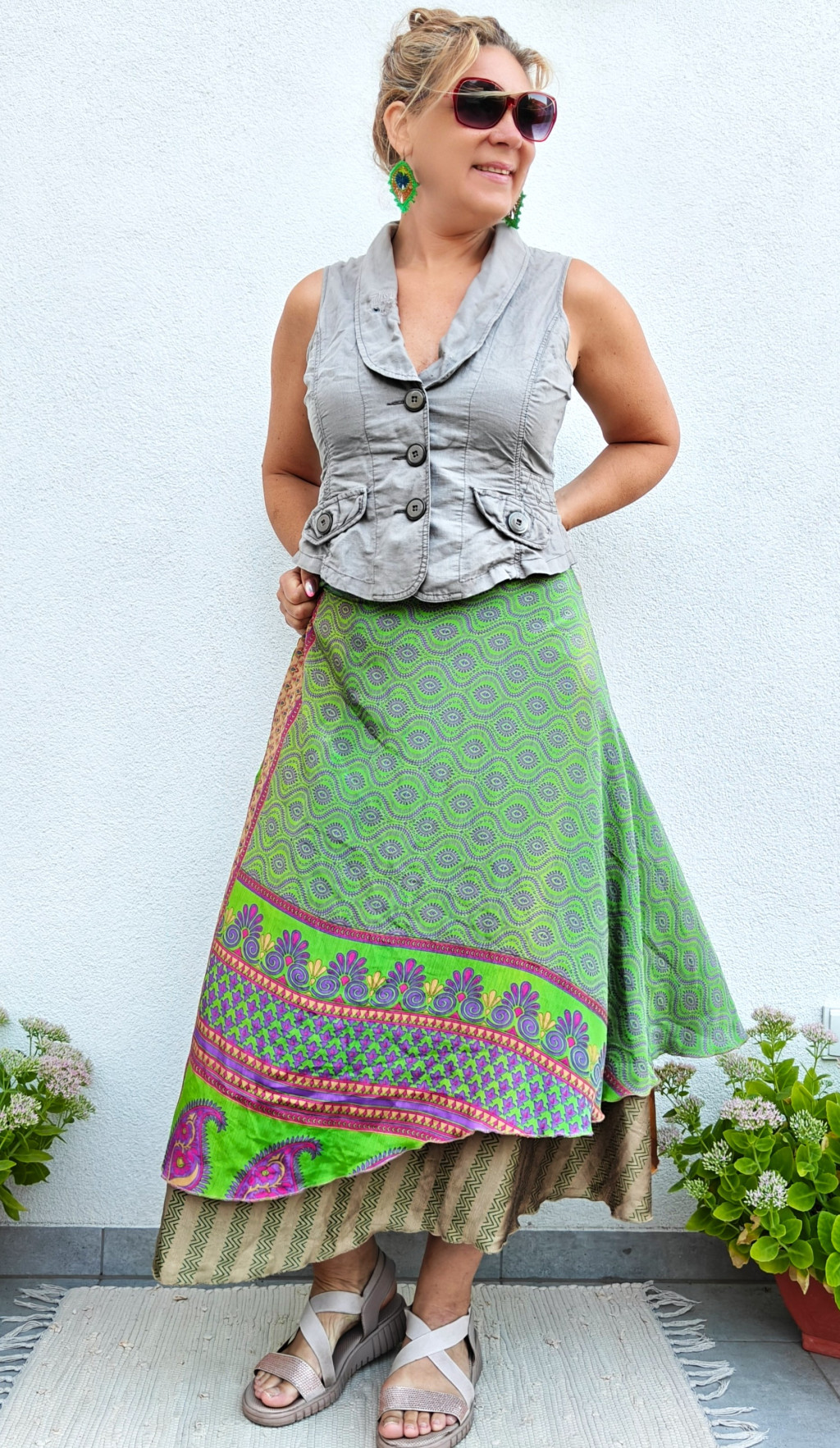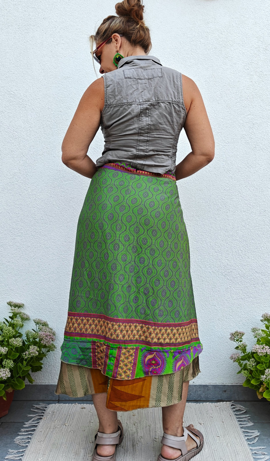 Lapszoknyáink újrahasznosított szárikból készülnek Indiában, egy hosszabb és egy rövidebb anyag derékban összevarrva! Két oldalú, kifordítható, mindkét oldala hordható, sokféleképpen köthető, variálható. Szoknyáinkból nincs két egyforma, mindegyikből csak EGY darab van, ha megtetszik, csapj le rá!
