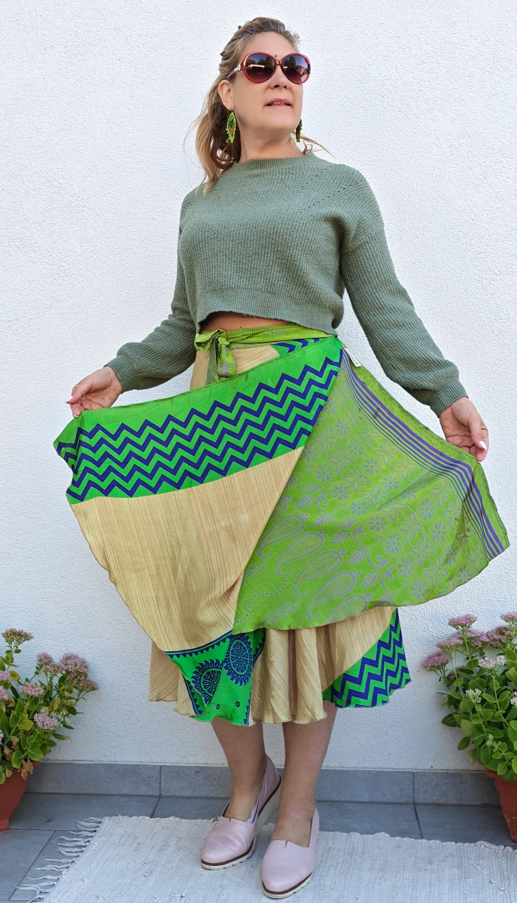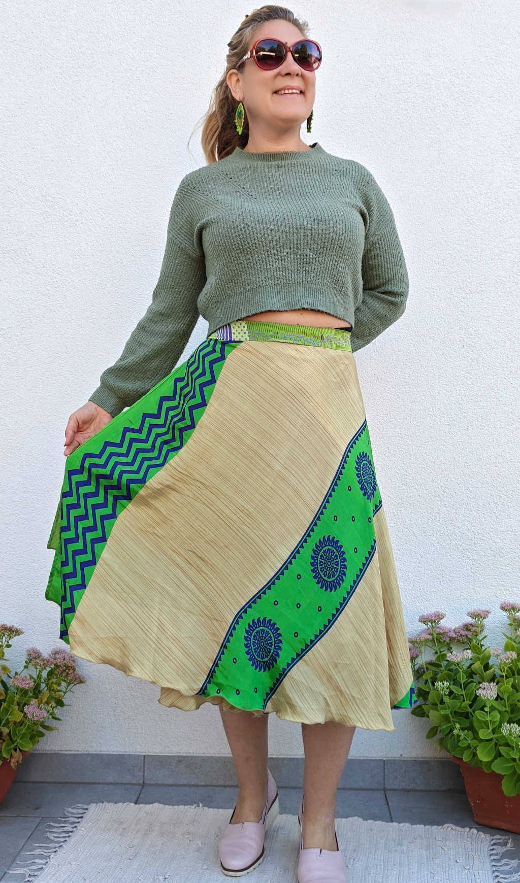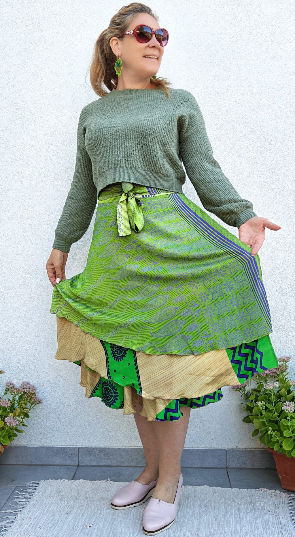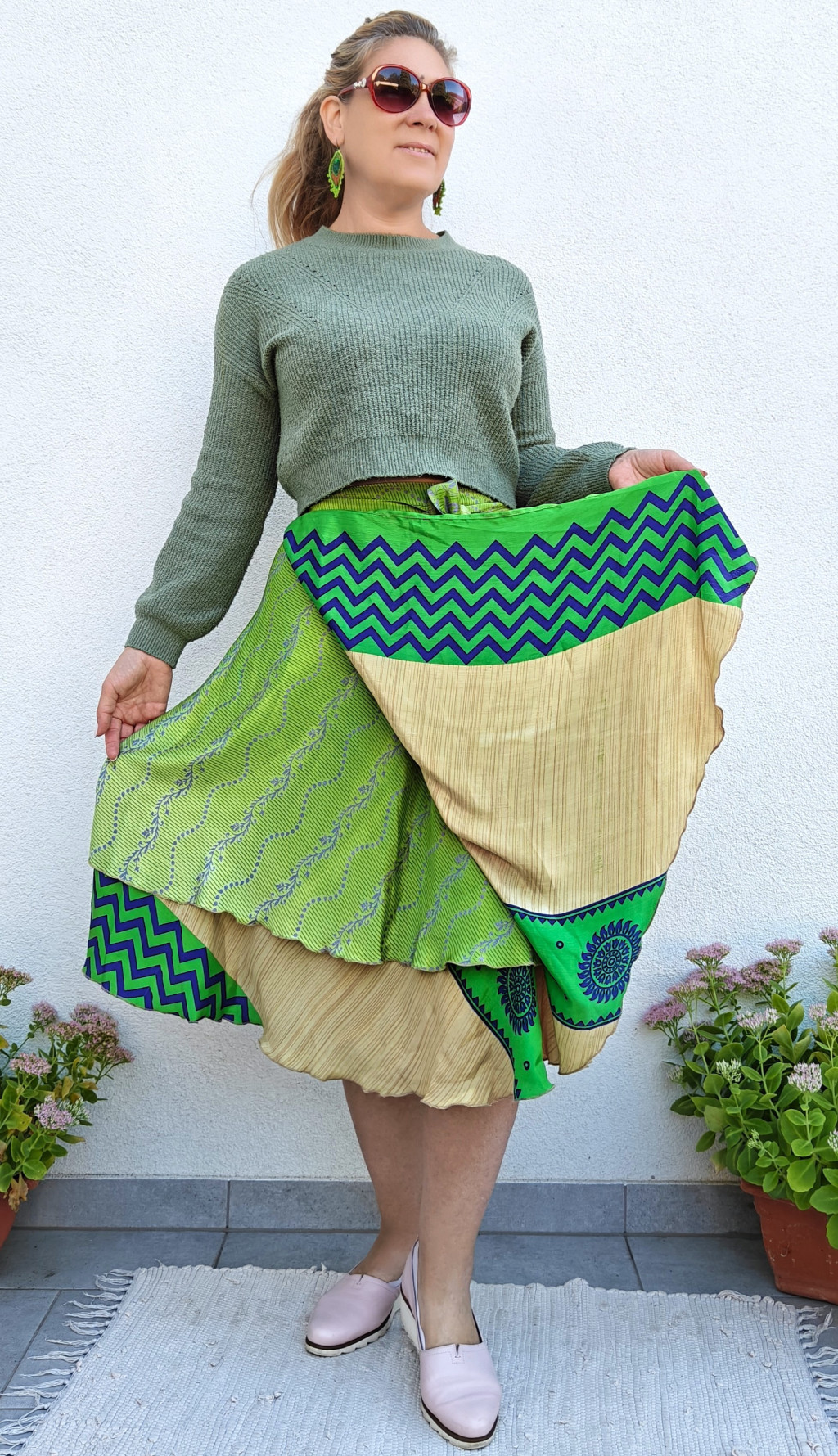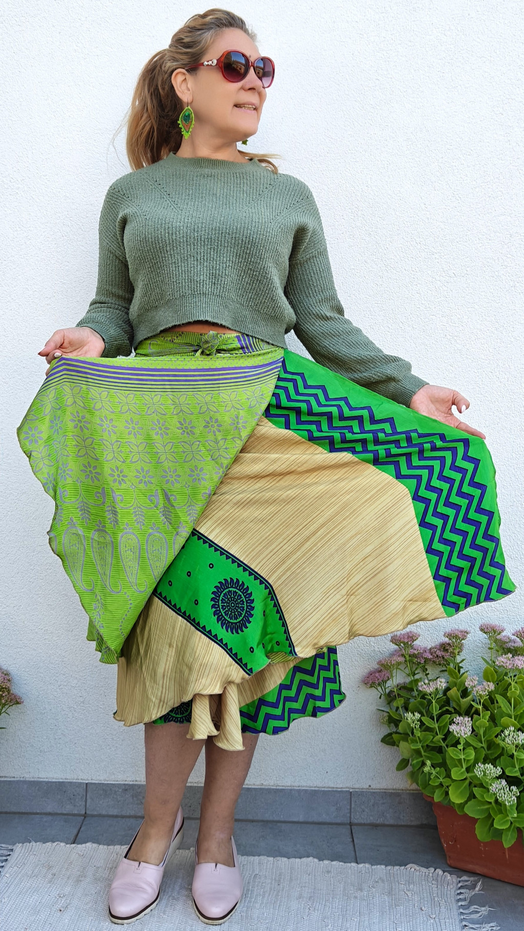 Lapszoknyáink újrahasznosított szárikból készülnek Indiában, egy hosszabb és egy rövidebb anyag derékban összevarrva! Két oldalú, kifordítható, mindkét oldala hordható, sokféleképpen köthető, variálható. Szoknyáinkból nincs két egyforma, mindegyikből csak EGY darab van, ha megtetszik, csapj le rá!