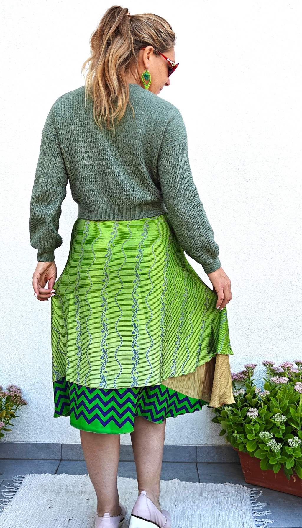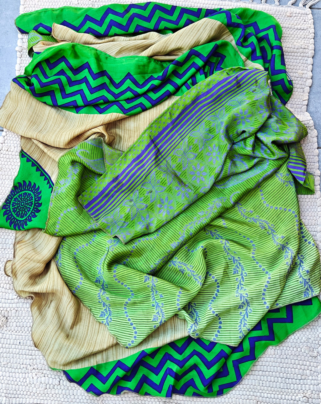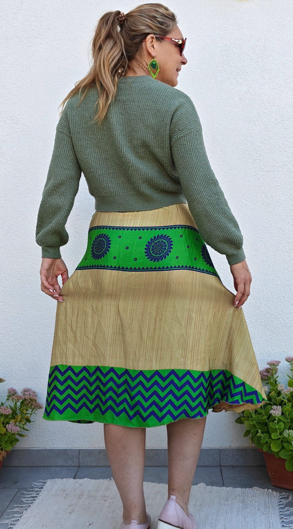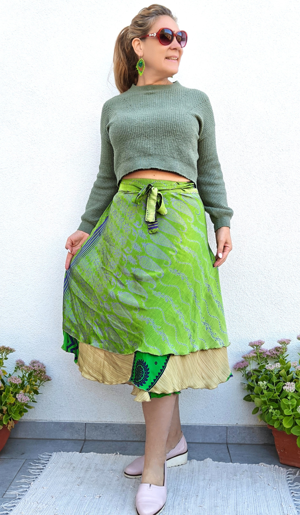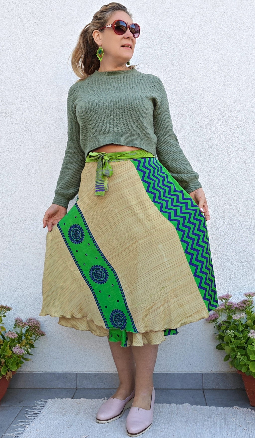 Lapszoknyáink újrahasznosított szárikból készülnek Indiában, egy hosszabb és egy rövidebb anyag derékban összevarrva! Két oldalú, kifordítható, mindkét oldala hordható, sokféleképpen köthető, variálható. Szoknyáinkból nincs két egyforma, mindegyikből csak EGY darab van, ha megtetszik, csapj le rá!