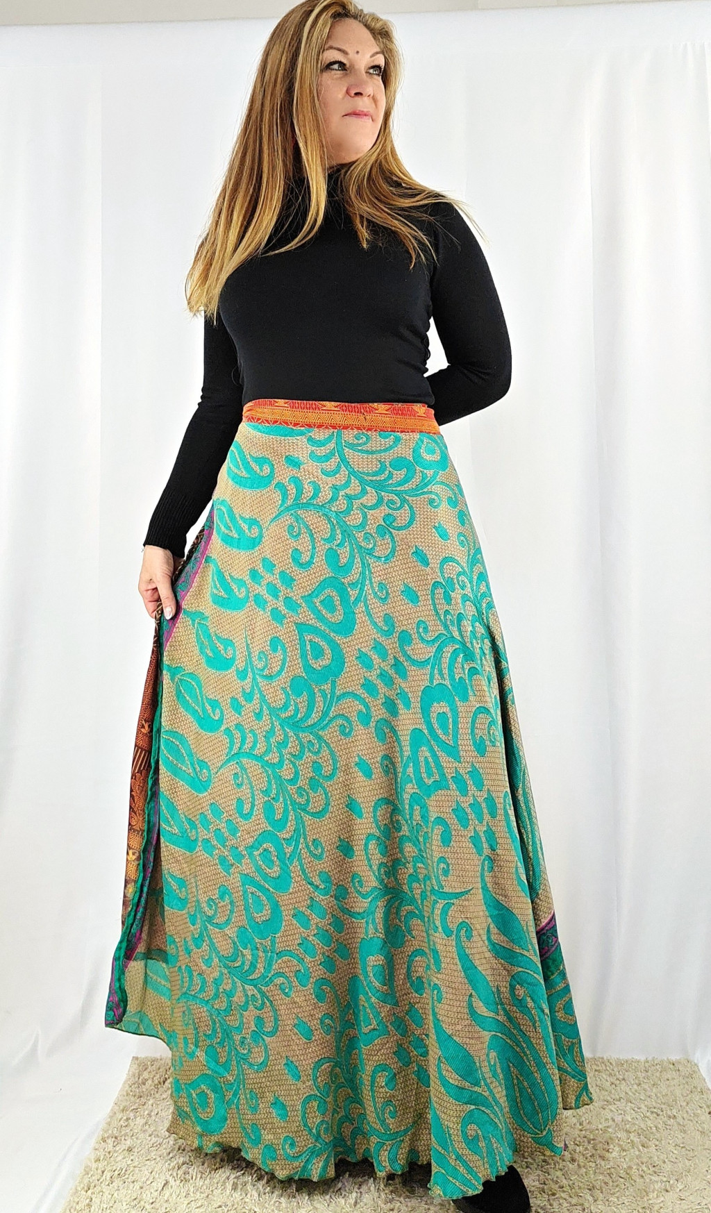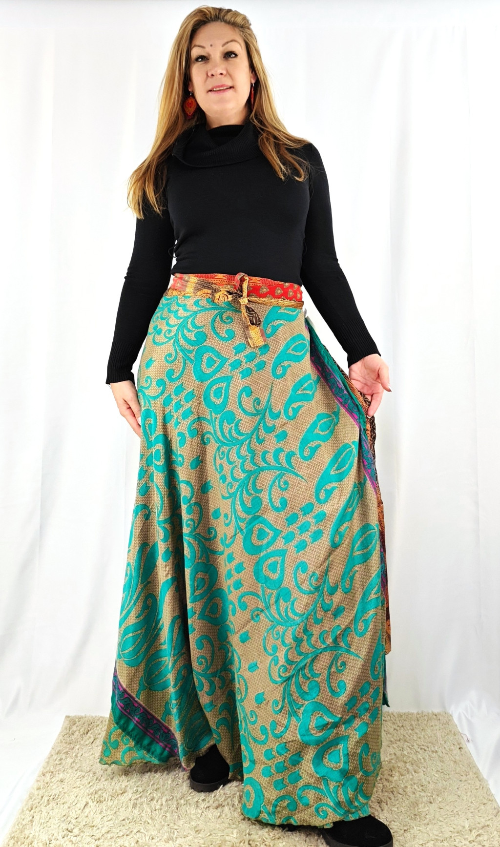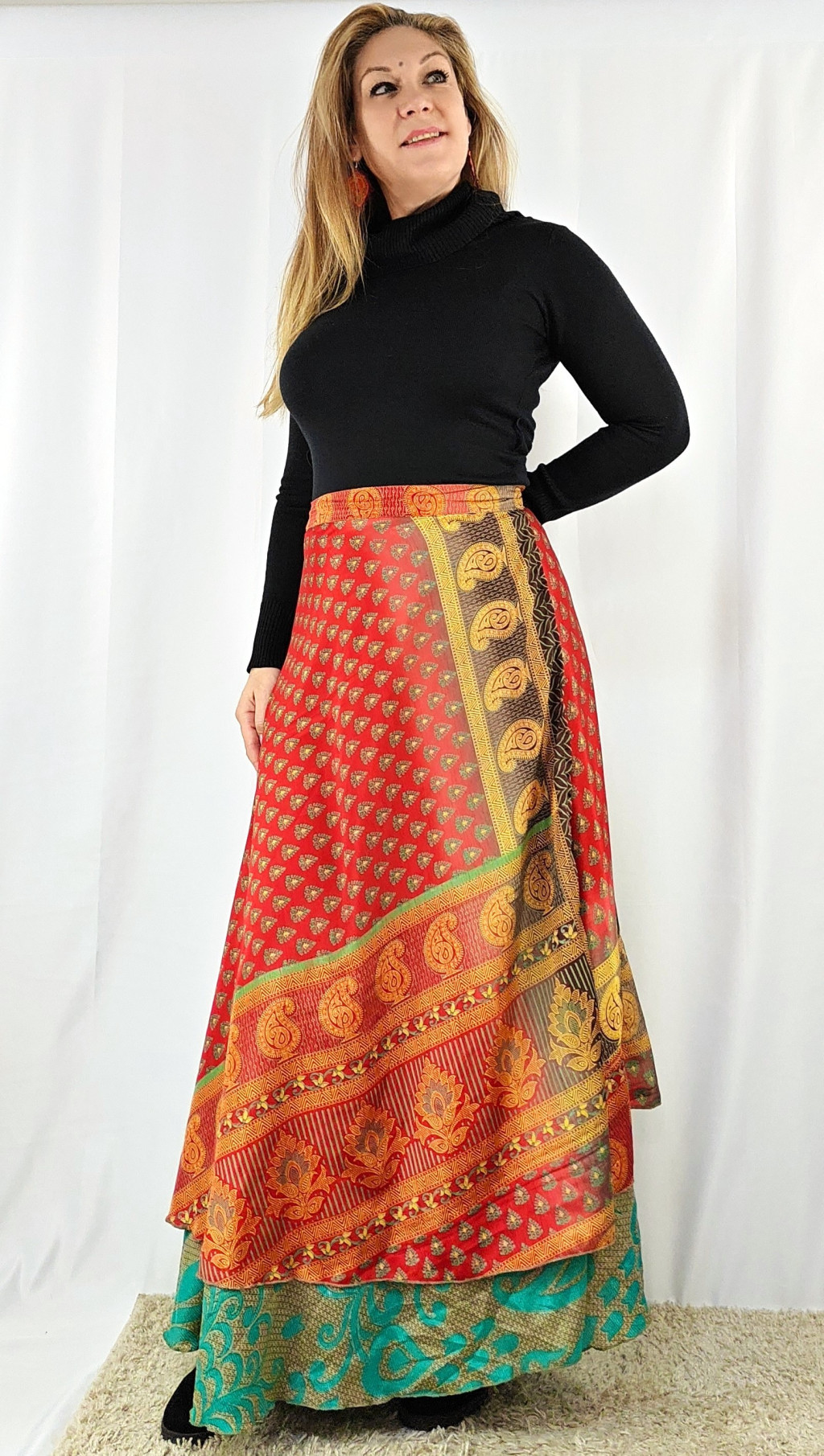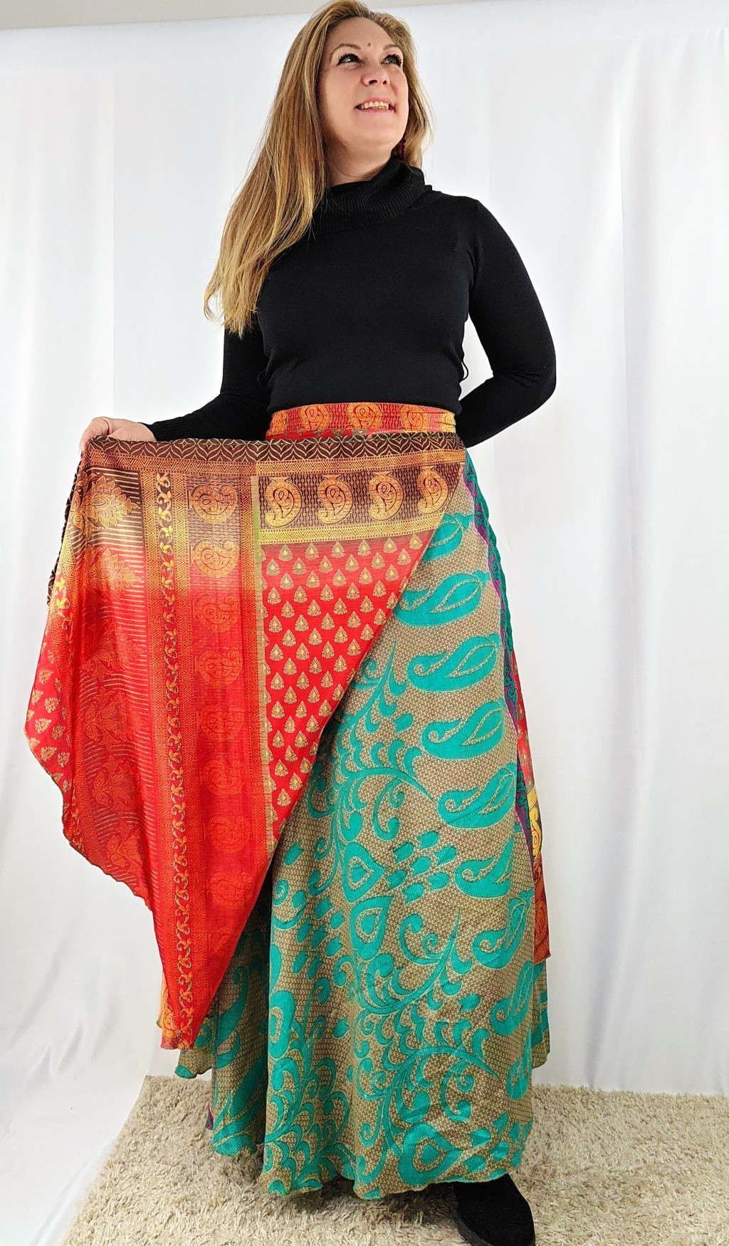 Lapszoknyáink újrahasznosított szárikból készülnek Indiában, egy hosszabb és egy rövidebb anyag derékban összevarrva! Két oldalú, kifordítható, mindkét oldala hordható, sokféleképpen köthető, variálható. Szoknyáinkból nincs két egyforma, mindegyikből csak EGY darab van, ha megtetszik, csapj le rá!