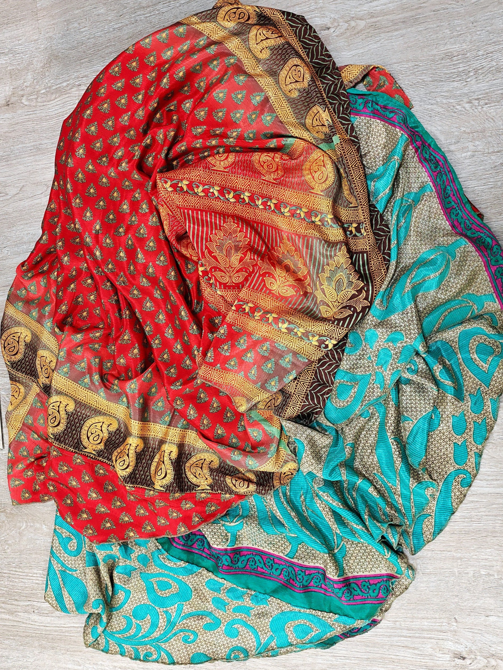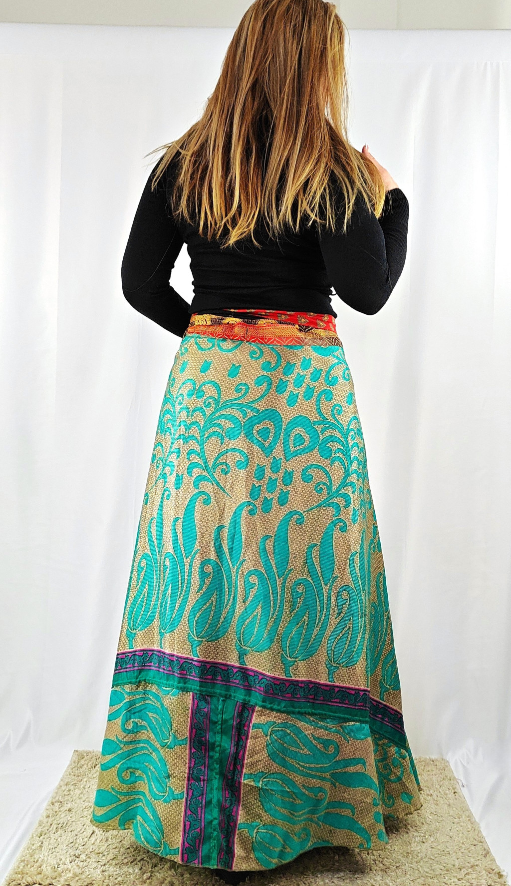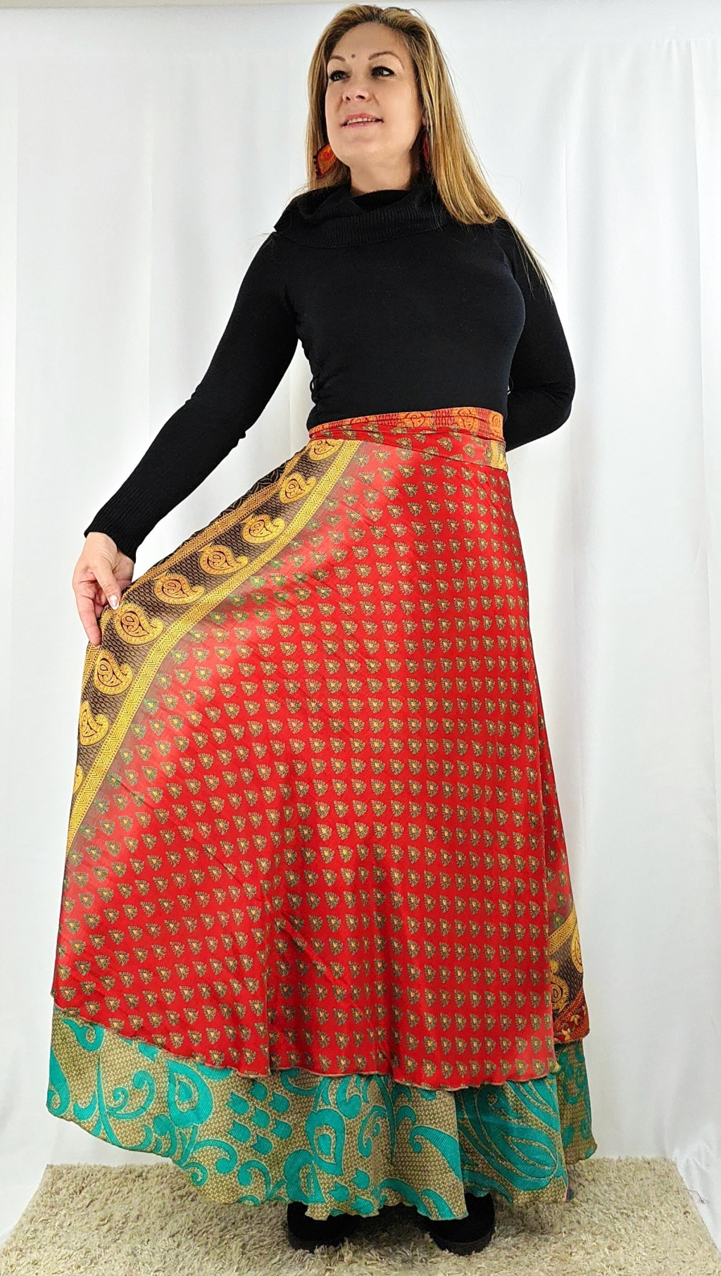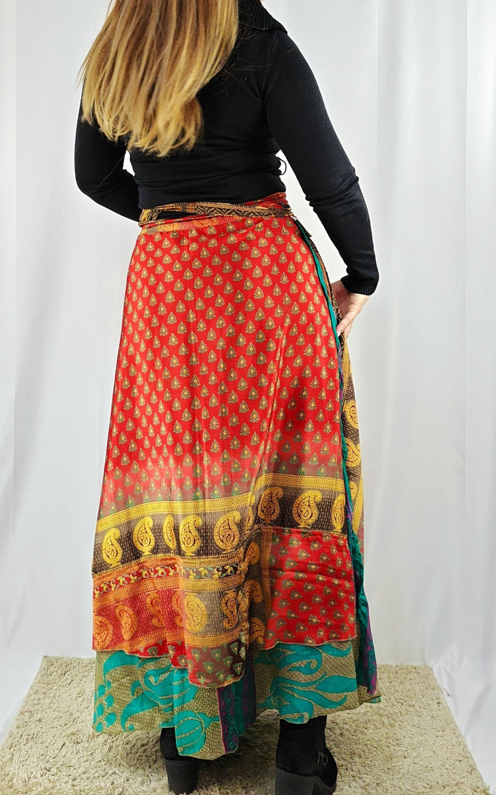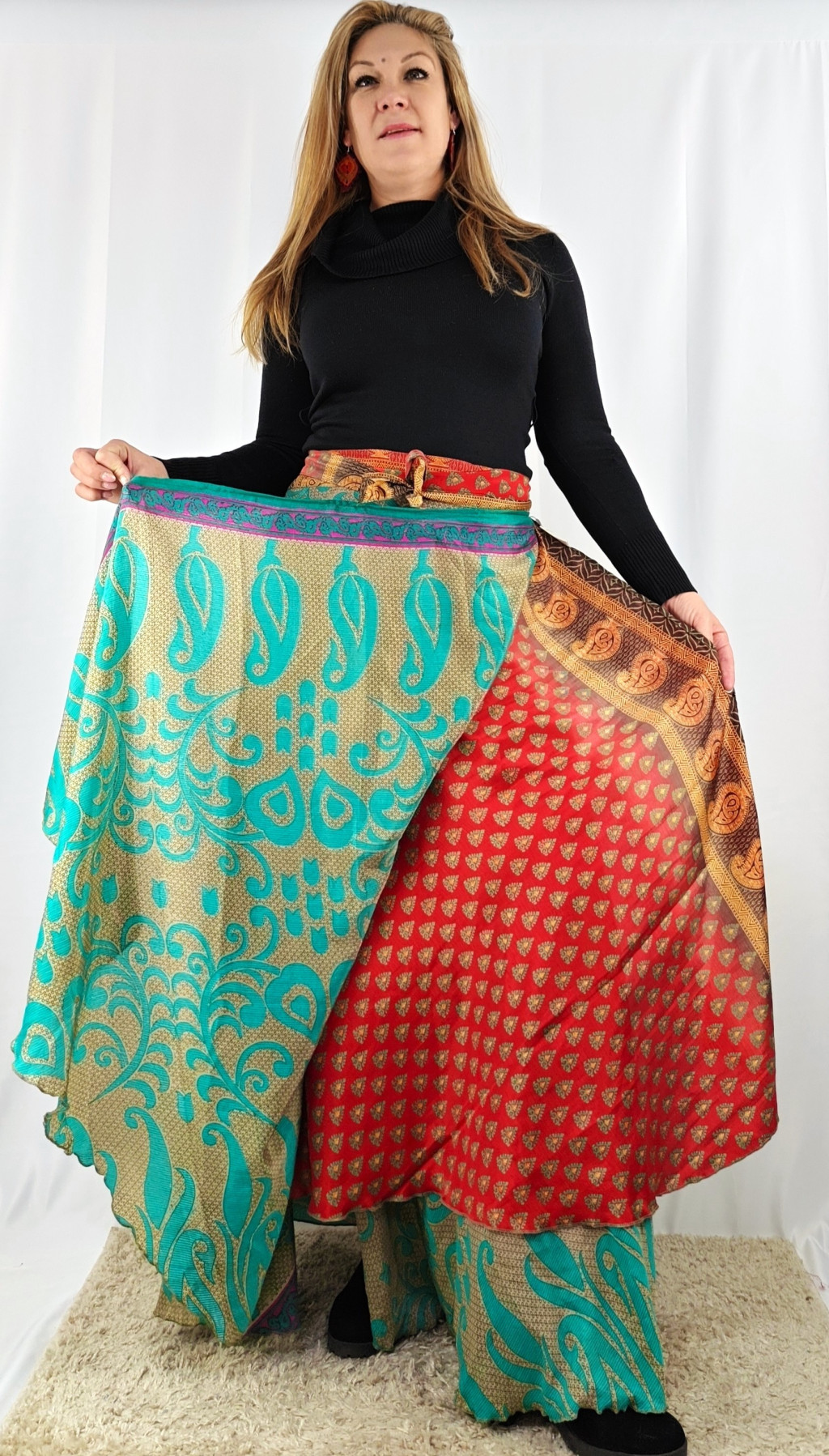 Lapszoknyáink újrahasznosított szárikból készülnek Indiában, egy hosszabb és egy rövidebb anyag derékban összevarrva! Két oldalú, kifordítható, mindkét oldala hordható, sokféleképpen köthető, variálható. Szoknyáinkból nincs két egyforma, mindegyikből csak EGY darab van, ha megtetszik, csapj le rá!