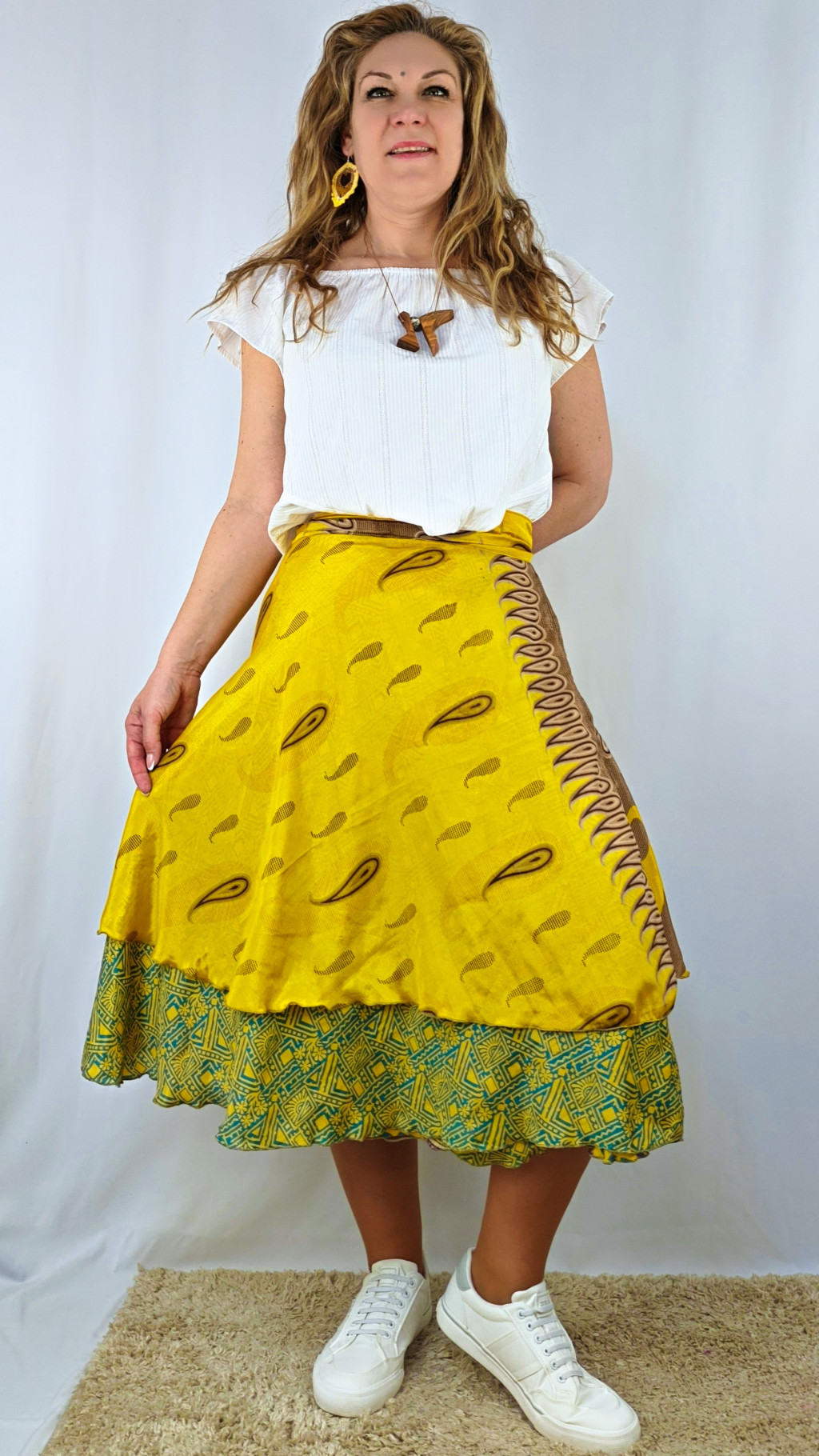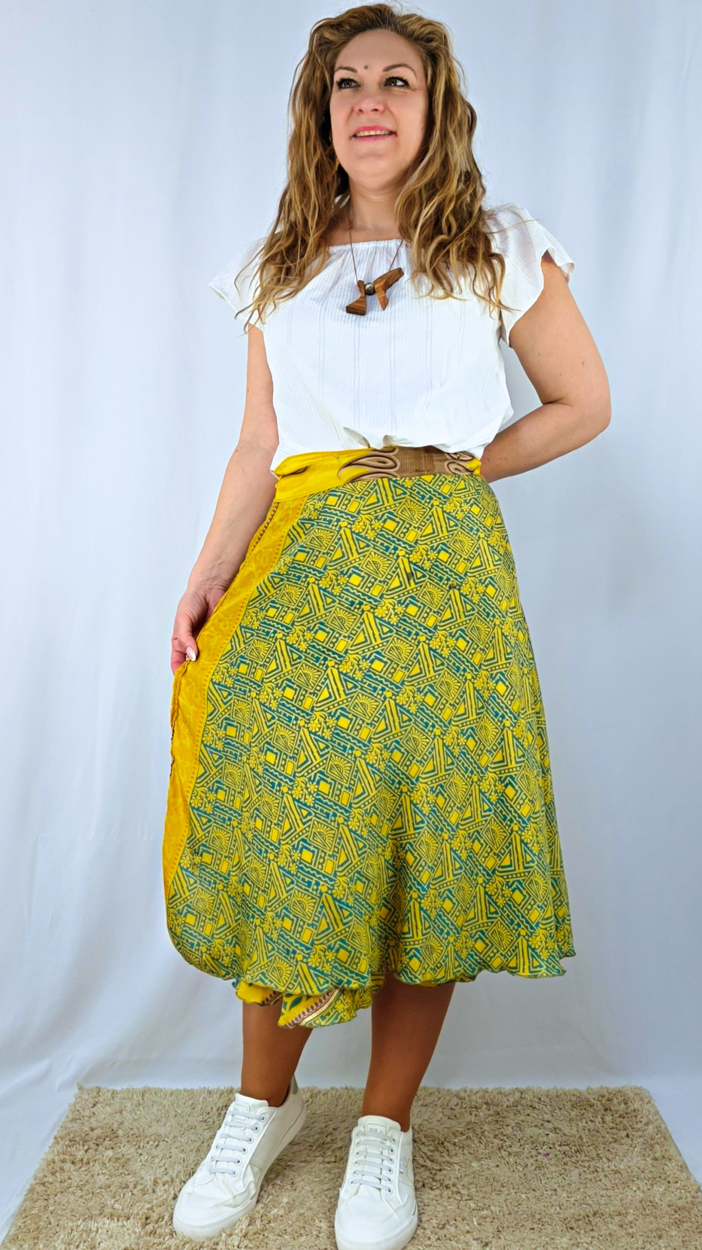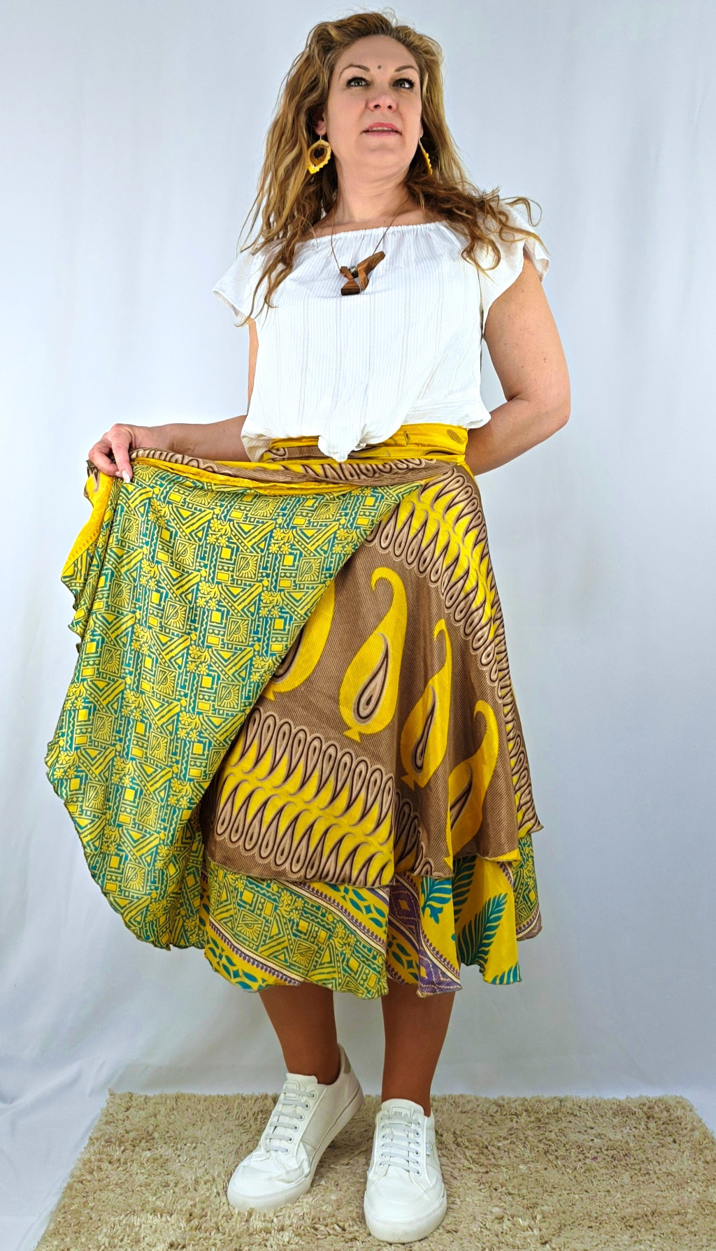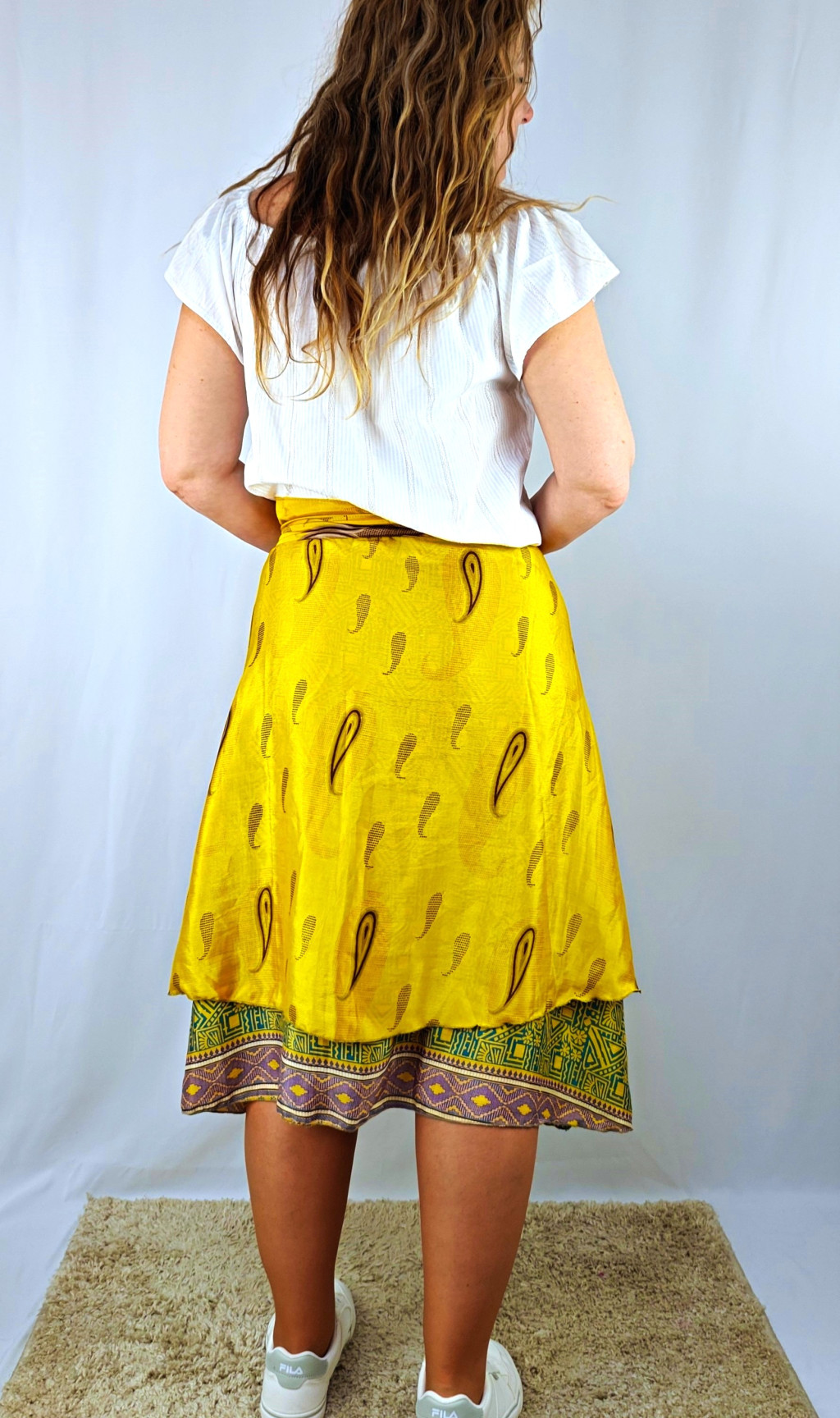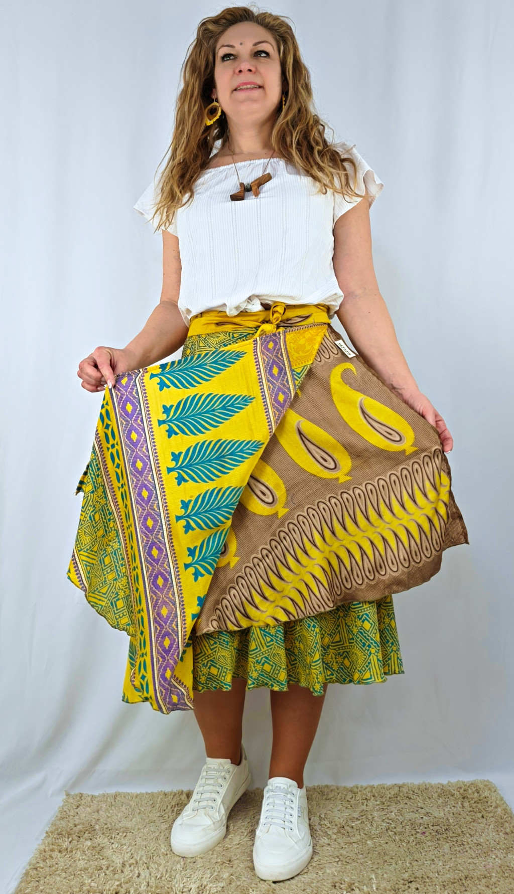 Lapszoknyáink újrahasznosított szárikból készülnek Indiában, egy hosszabb és egy rövidebb anyag derékban összevarrva! Két oldalú, kifordítható, mindkét oldala hordható, sokféleképpen köthető, variálható. Szoknyáinkból nincs két egyforma, mindegyikből csak EGY darab van, ha megtetszik, csapj le rá!
