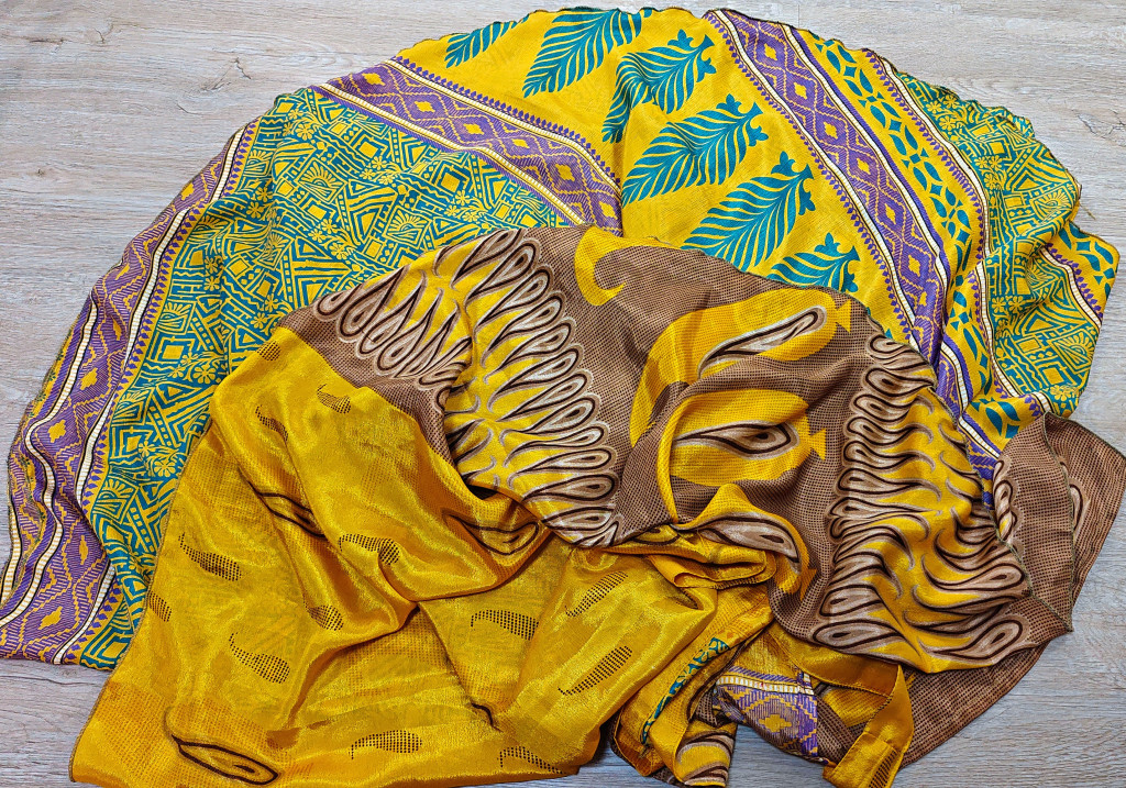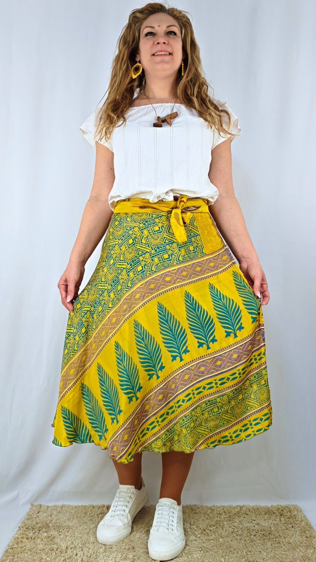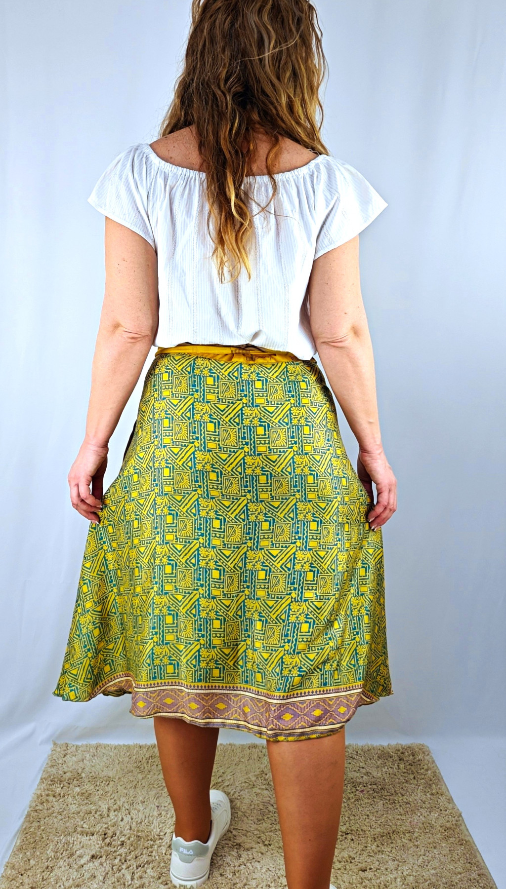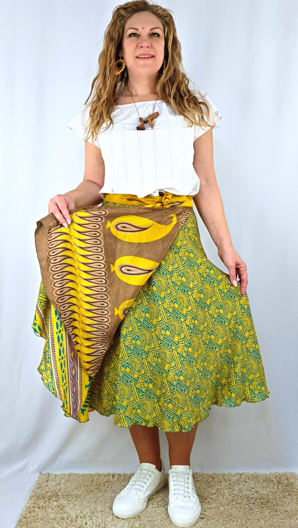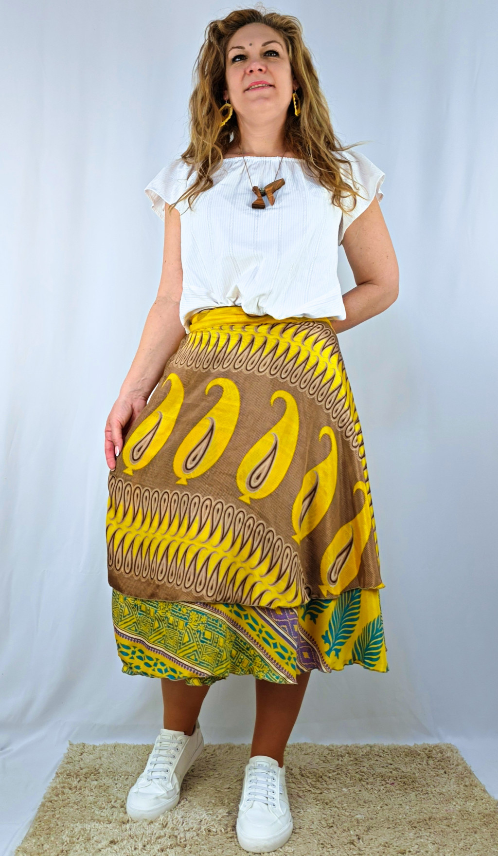 Lapszoknyáink újrahasznosított szárikból készülnek Indiában, egy hosszabb és egy rövidebb anyag derékban összevarrva! Két oldalú, kifordítható, mindkét oldala hordható, sokféleképpen köthető, variálható. Szoknyáinkból nincs két egyforma, mindegyikből csak EGY darab van, ha megtetszik, csapj le rá!
