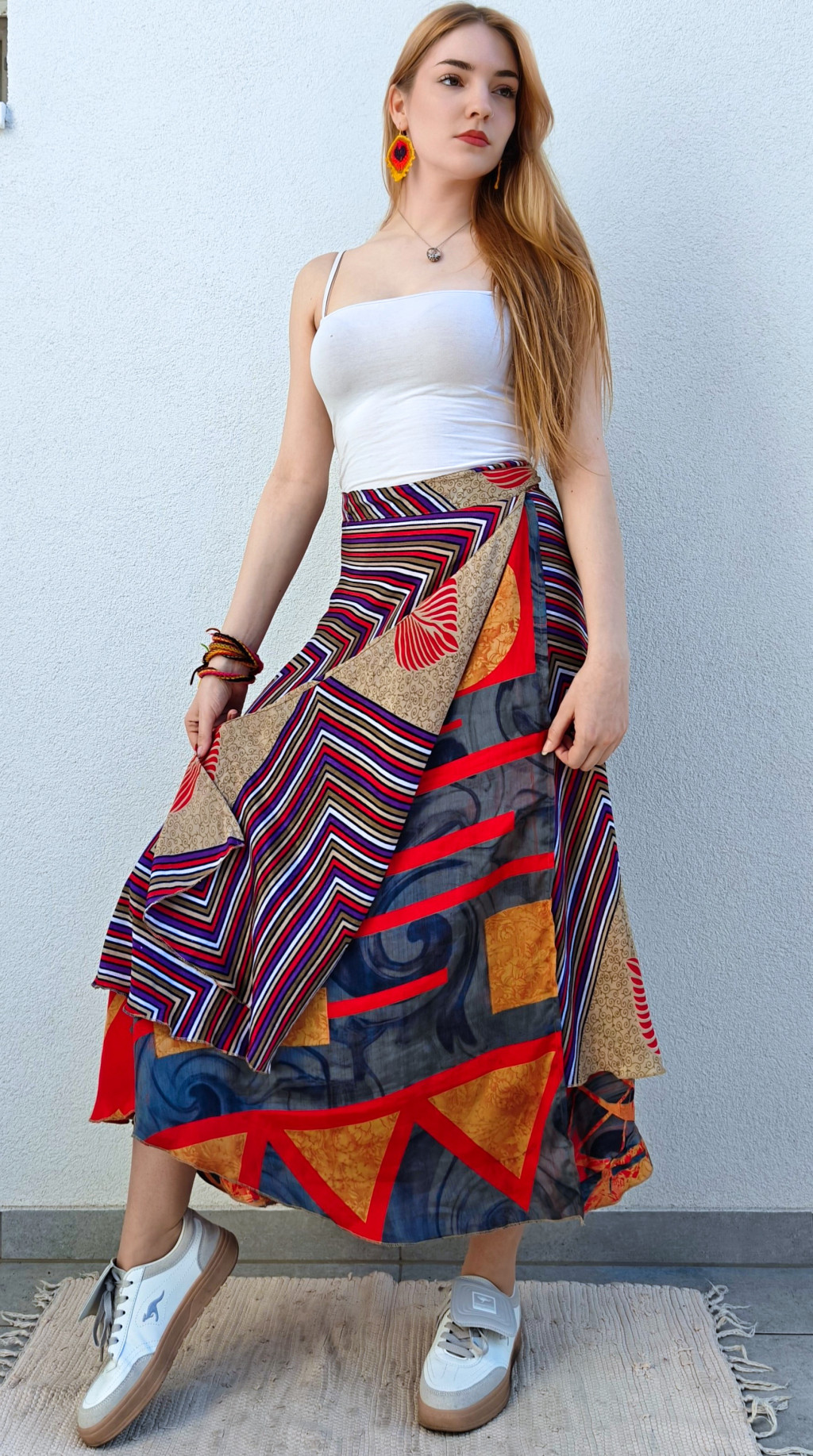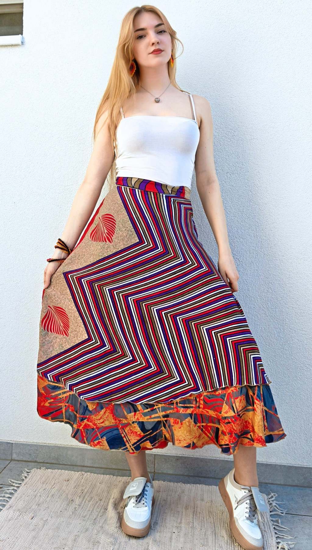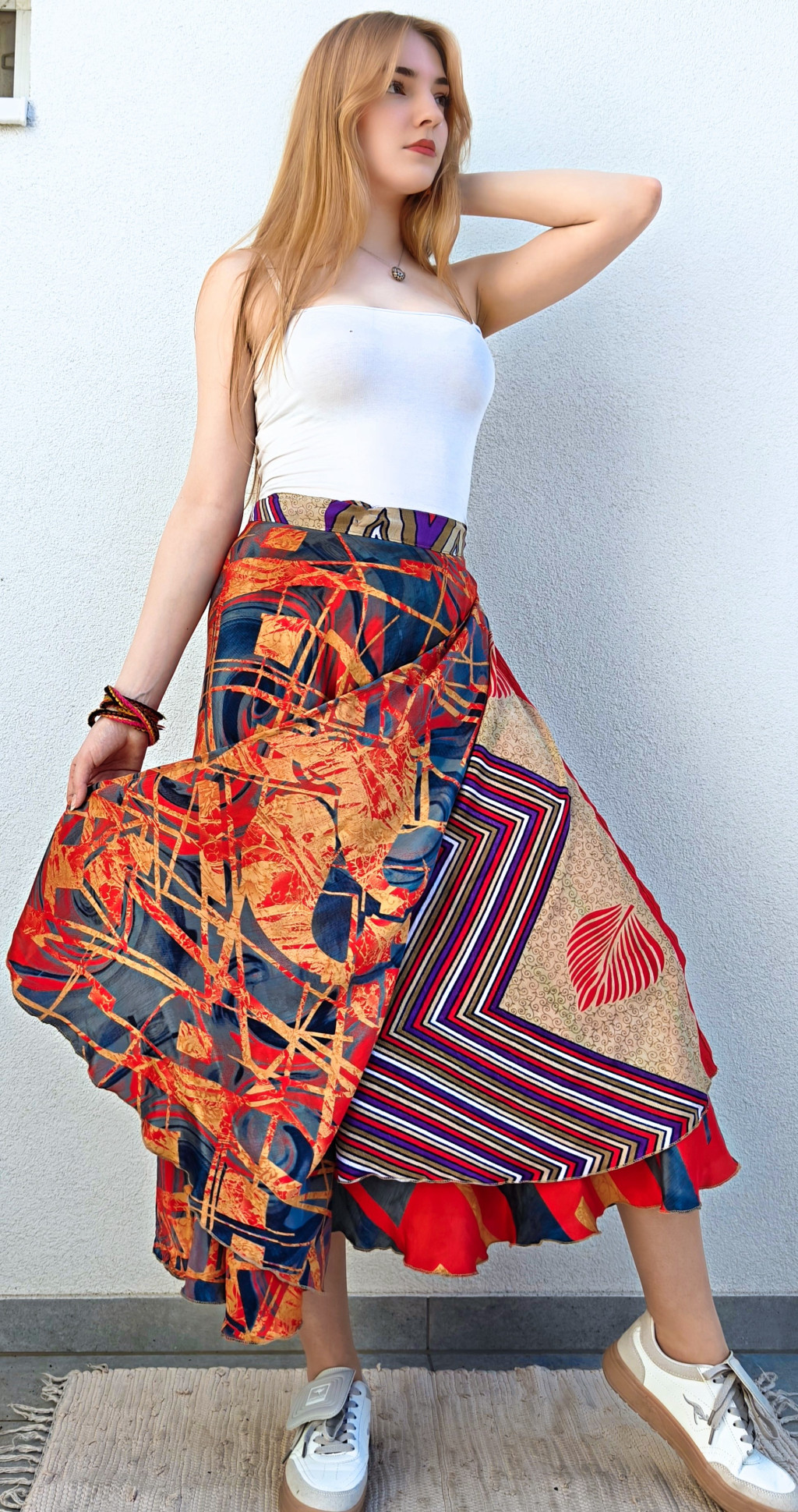 Lapszoknyáink újrahasznosított szárikból készülnek Indiában, egy hosszabb és egy rövidebb anyag derékban összevarrva! Két oldalú, kifordítható, mindkét oldala hordható, sokféleképpen köthető, variálható. Szoknyáinkból nincs két egyforma, mindegyikből csak EGY darab van, ha megtetszik, csapj le rá!