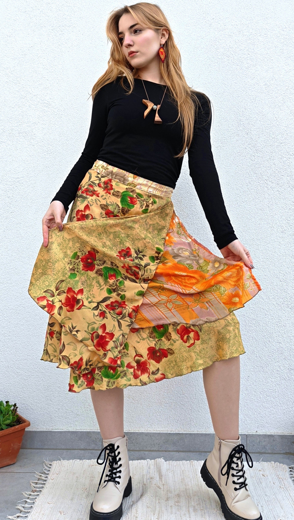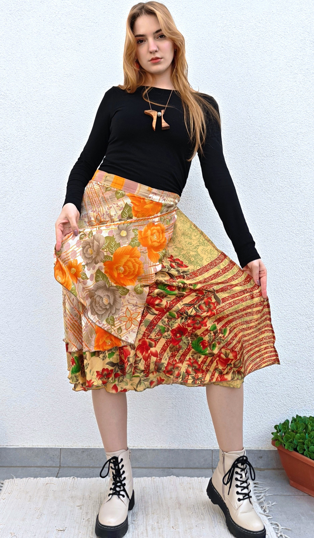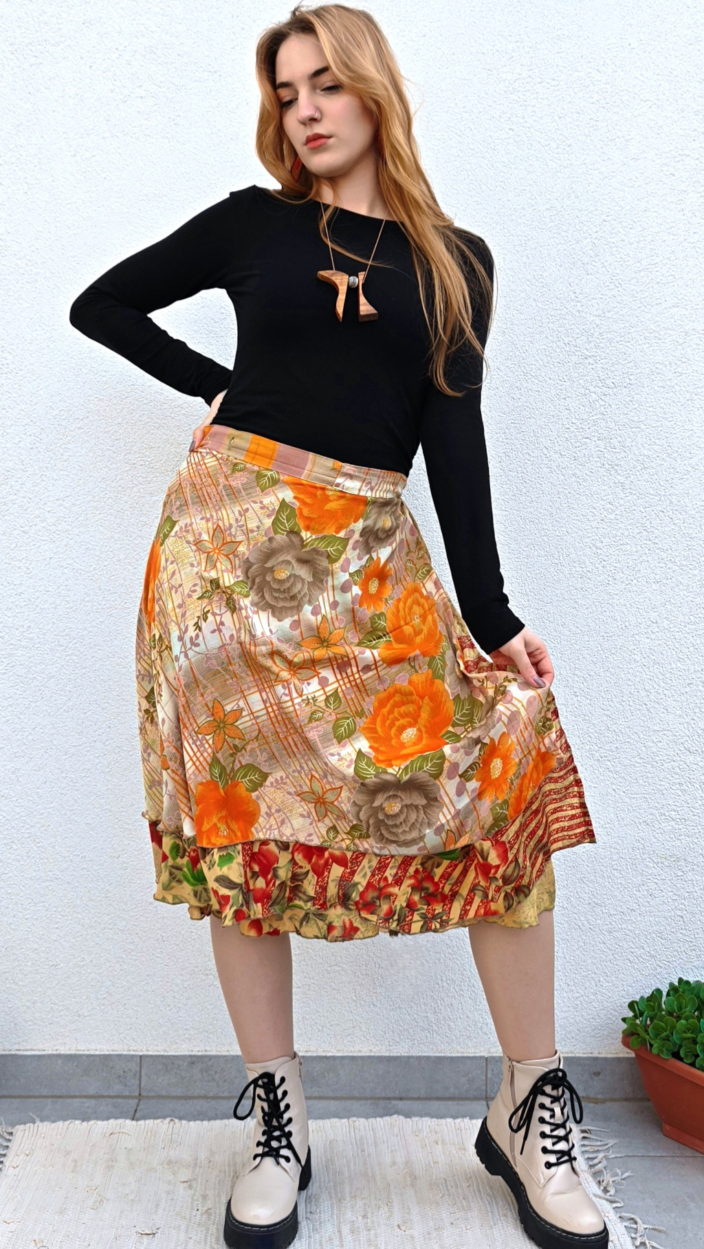 Lapszoknyáink újrahasznosított szárikból készülnek Indiában, egy hosszabb és egy rövidebb anyag derékban összevarrva! Két oldalú, kifordítható, mindkét oldala hordható, sokféleképpen köthető, variálható. Szoknyáinkból nincs két egyforma, mindegyikből csak EGY darab van, ha megtetszik, csapj le rá!