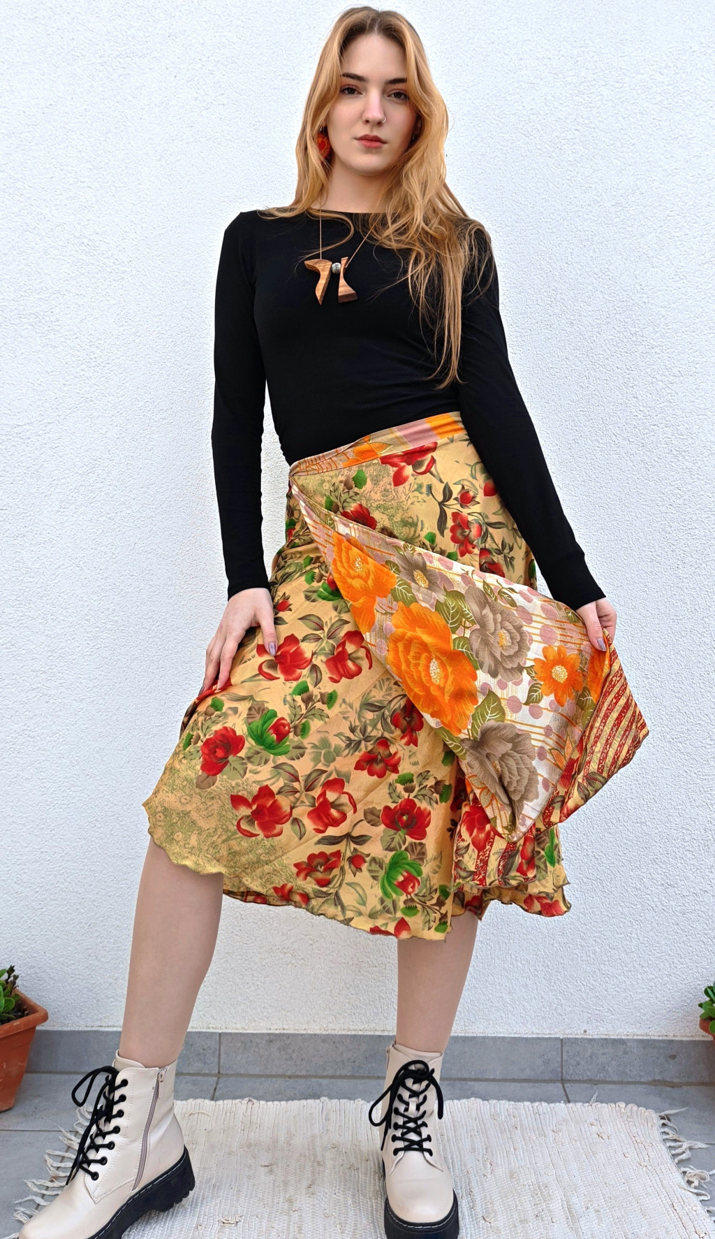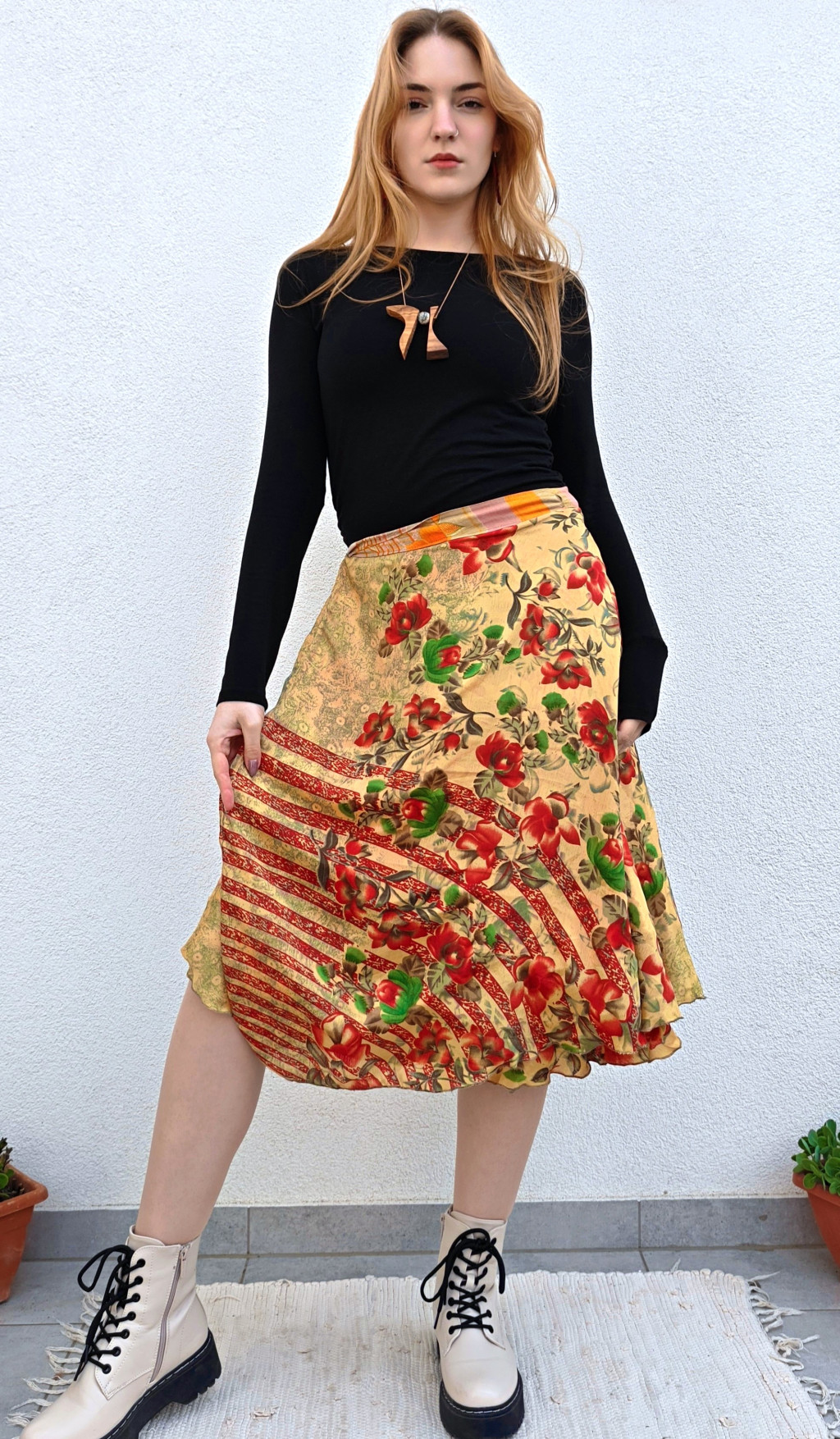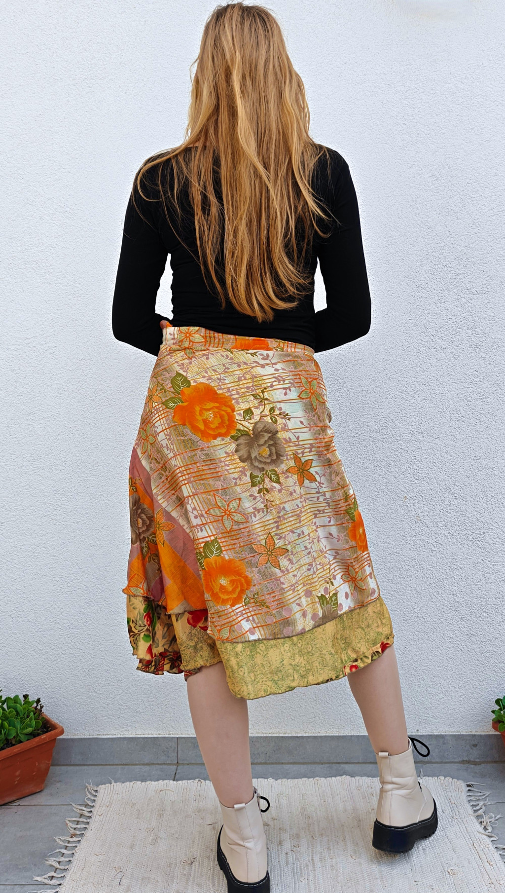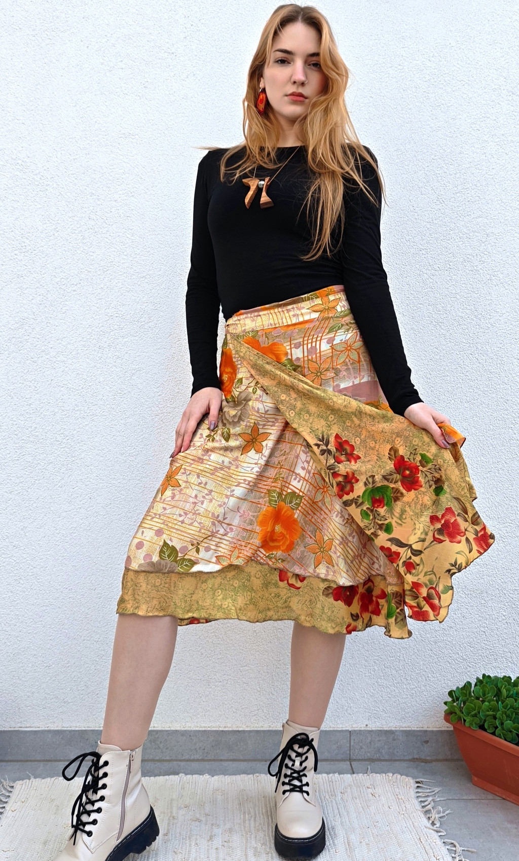 Lapszoknyáink újrahasznosított szárikból készülnek Indiában, egy hosszabb és egy rövidebb anyag derékban összevarrva! Két oldalú, kifordítható, mindkét oldala hordható, sokféleképpen köthető, variálható. Szoknyáinkból nincs két egyforma, mindegyikből csak EGY darab van, ha megtetszik, csapj le rá!