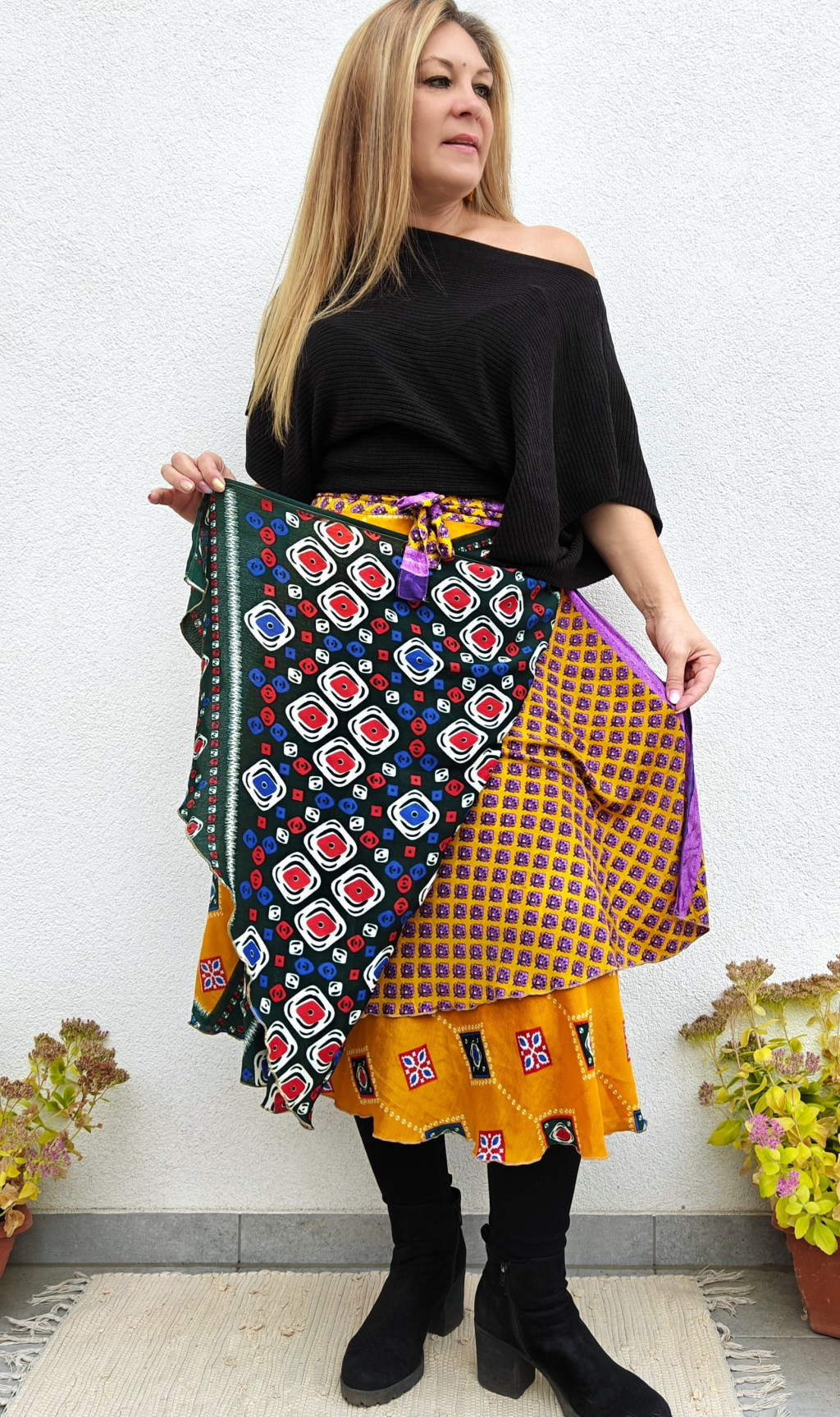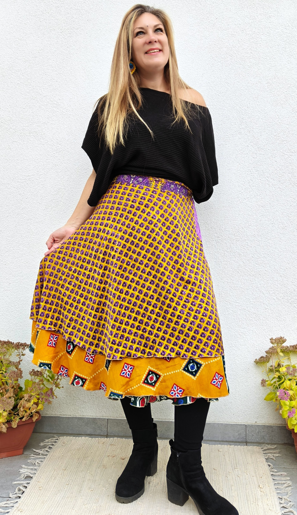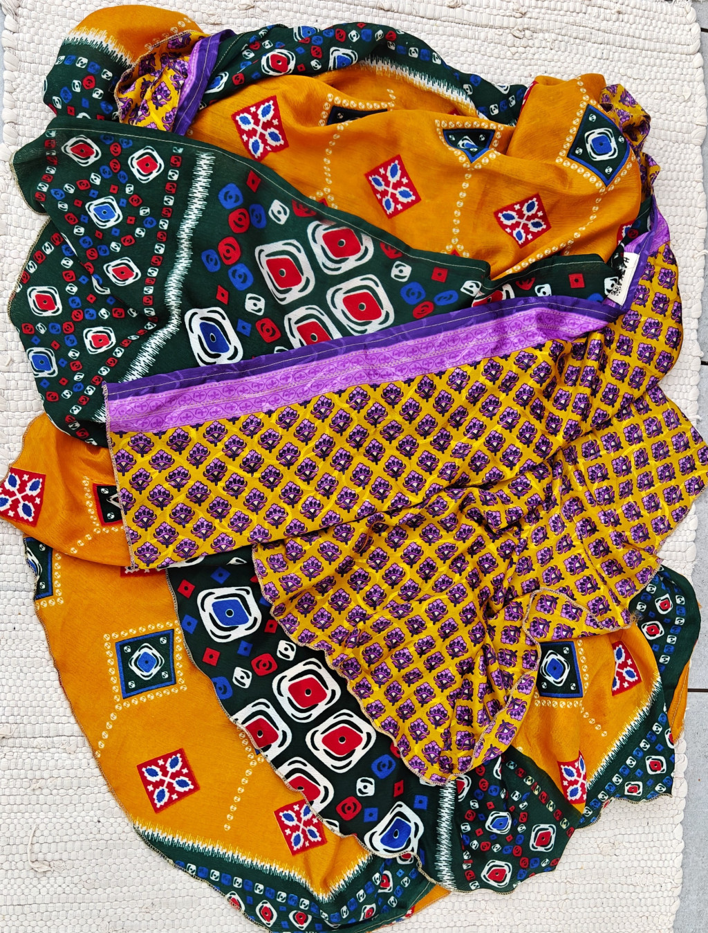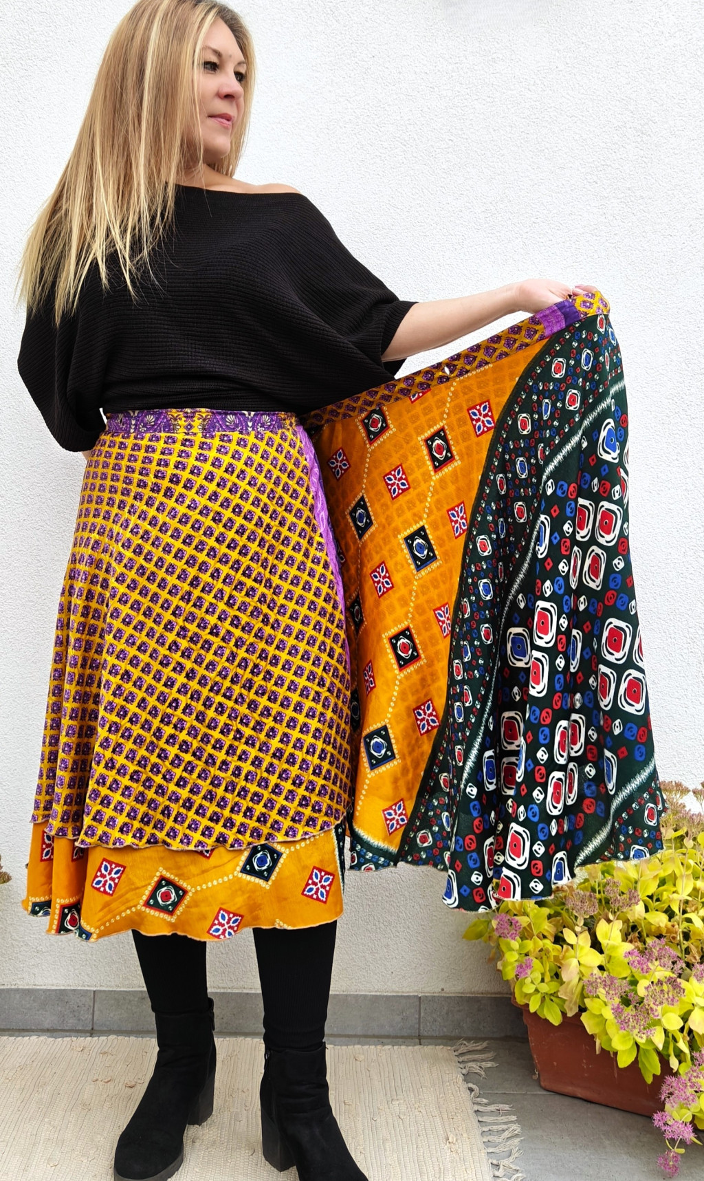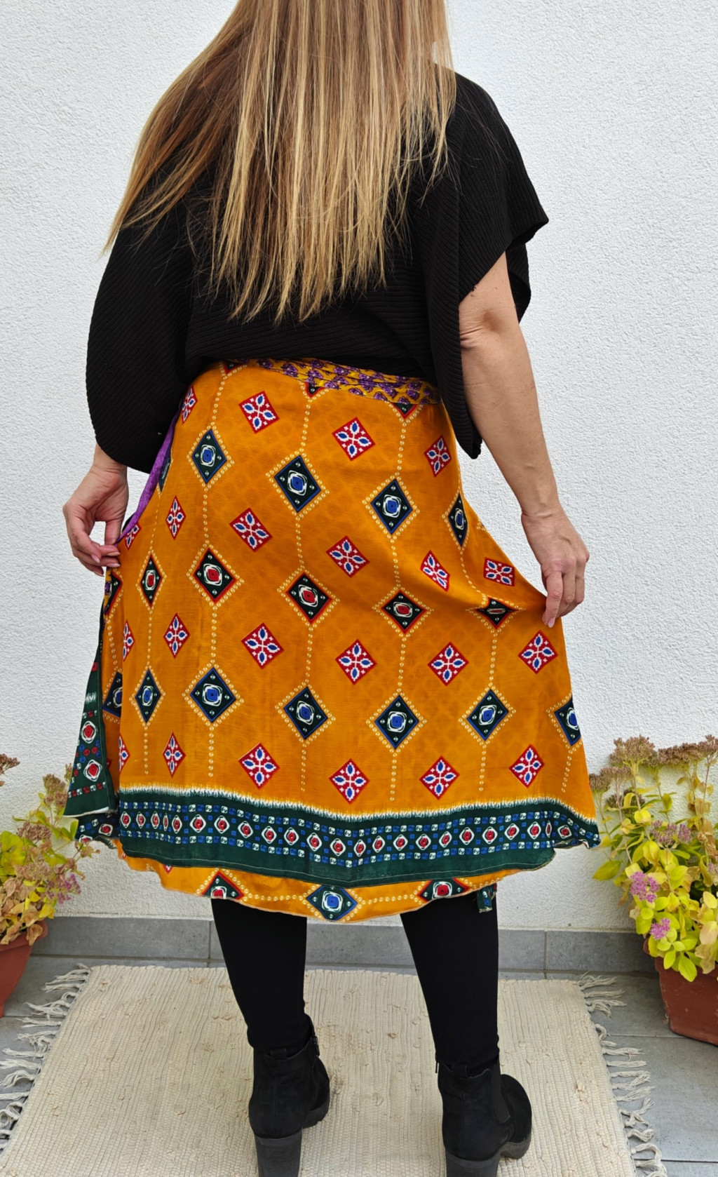 Lapszoknyáink újrahasznosított szárikból készülnek Indiában, egy hosszabb és egy rövidebb anyag derékban összevarrva! Két oldalú, kifordítható, mindkét oldala hordható, sokféleképpen köthető, variálható. Szoknyáinkból nincs két egyforma, mindegyikből csak EGY darab van, ha megtetszik, csapj le rá!