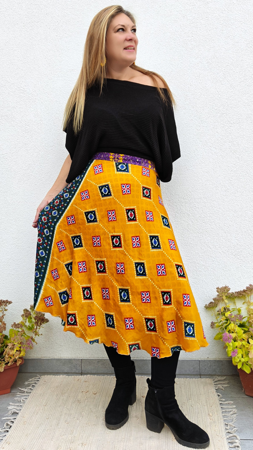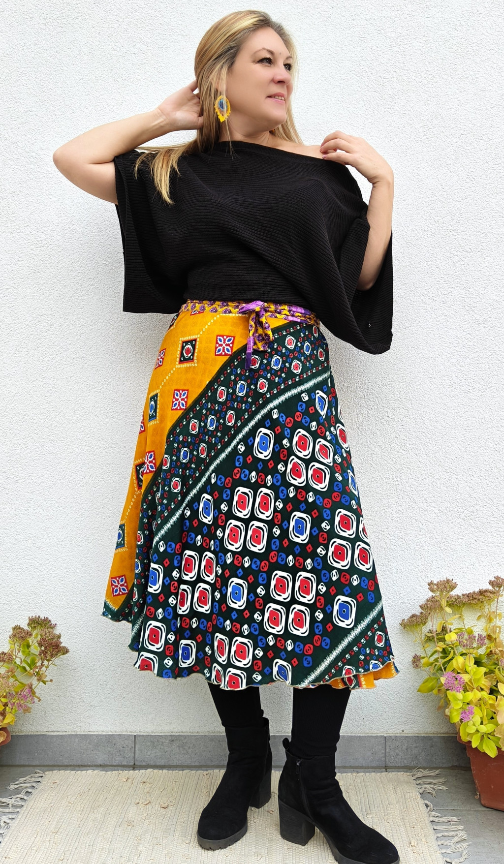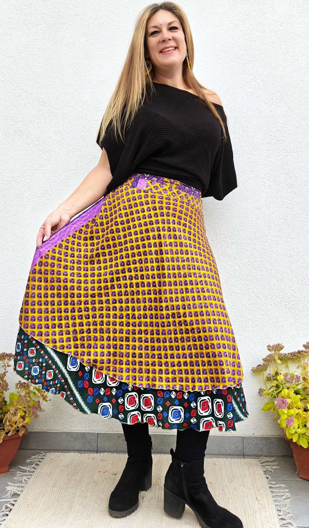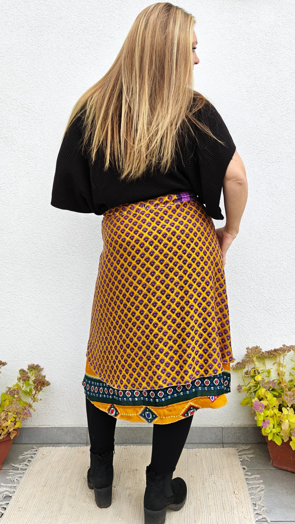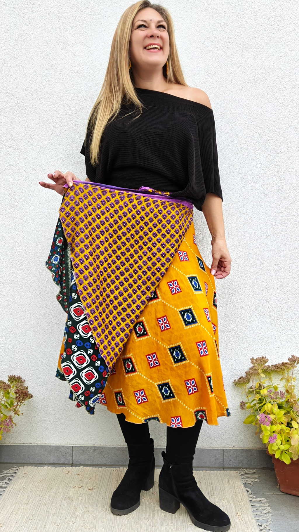 Lapszoknyáink újrahasznosított szárikból készülnek Indiában, egy hosszabb és egy rövidebb anyag derékban összevarrva! Két oldalú, kifordítható, mindkét oldala hordható, sokféleképpen köthető, variálható. Szoknyáinkból nincs két egyforma, mindegyikből csak EGY darab van, ha megtetszik, csapj le rá!