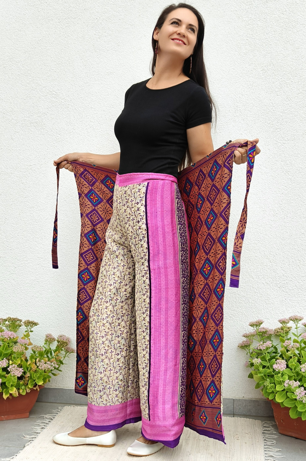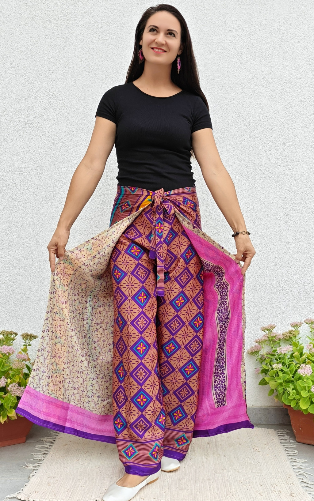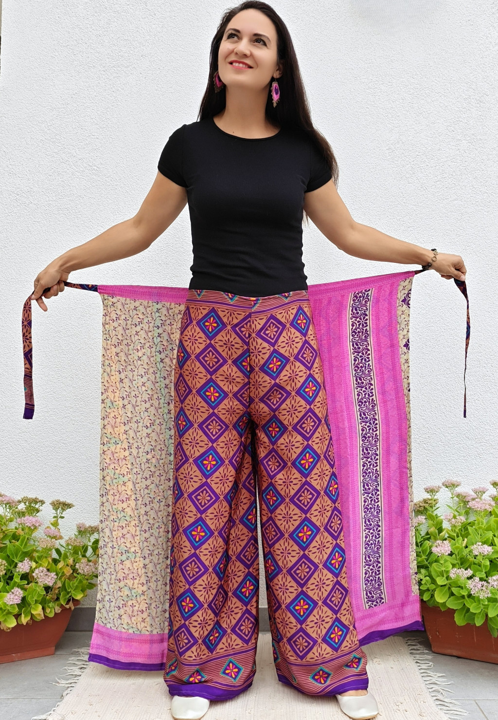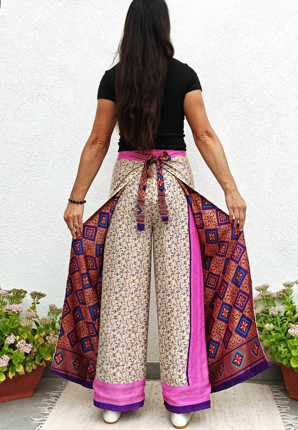 Lapnadrágjaink újrahasznosított szárikból készülnek Indiában. Két különböző csodás anyagot varrnak össze, így a külső és belső fele is hordható!
